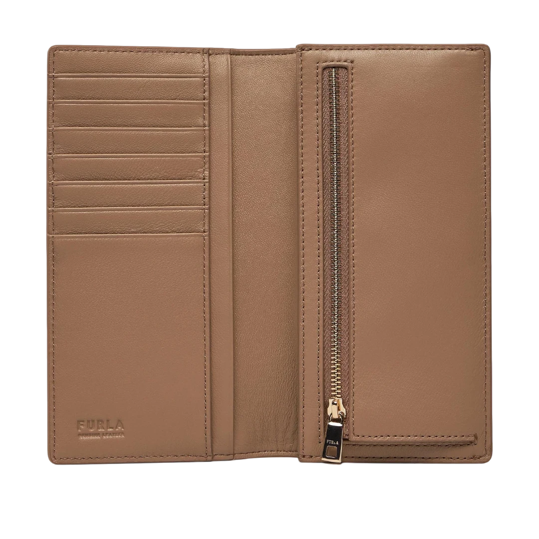 Elegantni Furla Flow novčanik u nježnoj bež nijansi donosi savršenu ravnotežu između minimalističkog dizajna i praktičnosti. Izrađen od kvalitetne kože, krase ga prepoznatljivi metalni Furla logo i sofisticiran zatvarač s remenom. Unutrašnjost je pažljivo organizovana s brojnim pretincima za kartice, novčanice i dokumente — idealan dodatak za žene koje biraju bezvremensku eleganciju i funkcionalan luksuz.