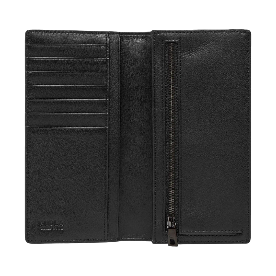 Bezvremenski Furla Flow novčanik u elegantnoj crnoj boji odiše minimalističkim luksuzom. Izrađen od vrhunske kože, s diskretnim monokromatskim Furla logom, ovaj model donosi savršenu ravnotežu između sofisticiranog dizajna i funkcionalnosti. Prostran unutrašnji raspored omogućava uredno čuvanje kartica, novčanica i dokumenata — idealan izbor za žene koje cijene klasu, red i besprijekoran stil.