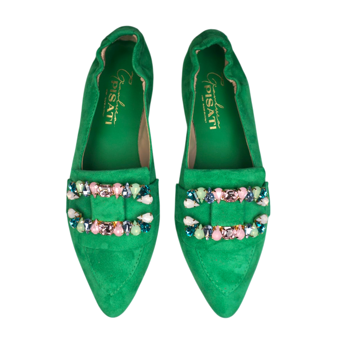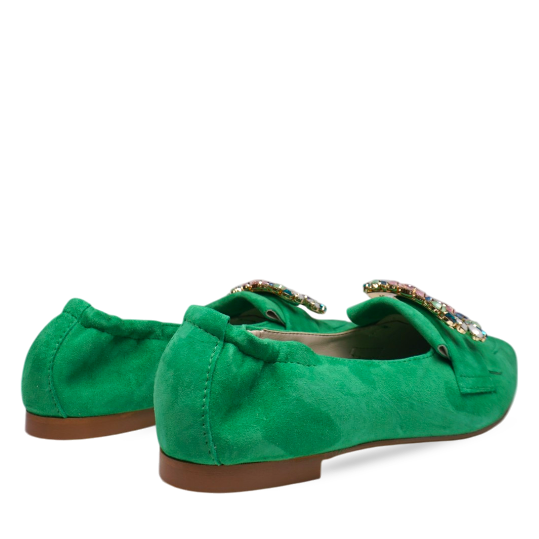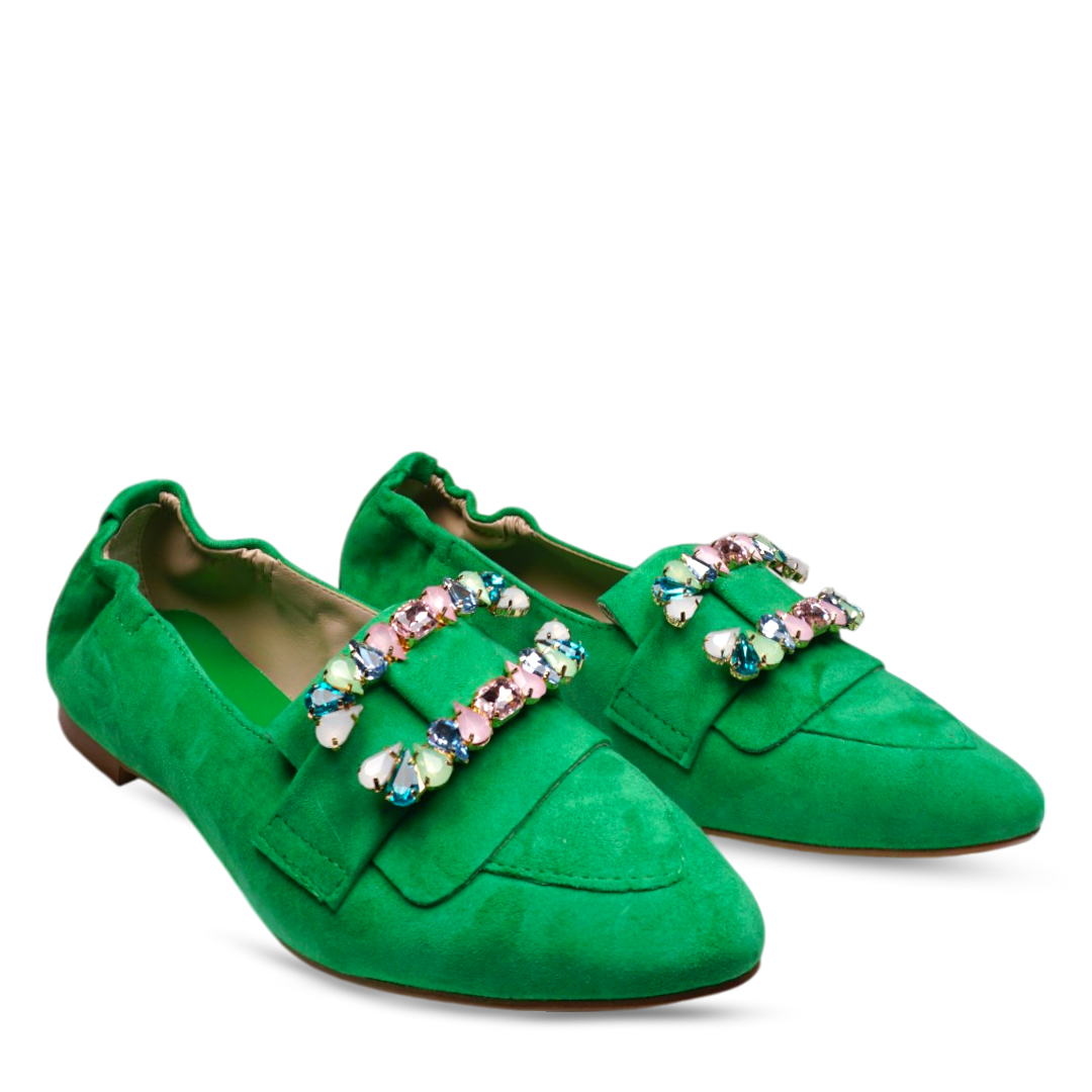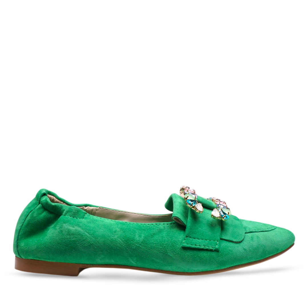 Ove ženske cipele u smjeloj zelenoj nijansi izrađene su od mekanog brušenog materijala koji pruža udobnost i eleganciju pri svakom koraku. Dizajn upotpunjuje atraktivna mašna na prednjem dijelu, ukrašena raskošnim šarenim kristalima koji cipelama daju glamurozan i razigran karakter. Ravni đon čini ih idealnim za svakodnevno nošenje, dok elastična traka na zadnjem dijelu pruža dodatnu udobnost i savršeno pristajanje. Ovaj model je odličan izbor za dame koje žele unijeti boju i sjaj u svoj stil bez kompromisa na udobnosti.