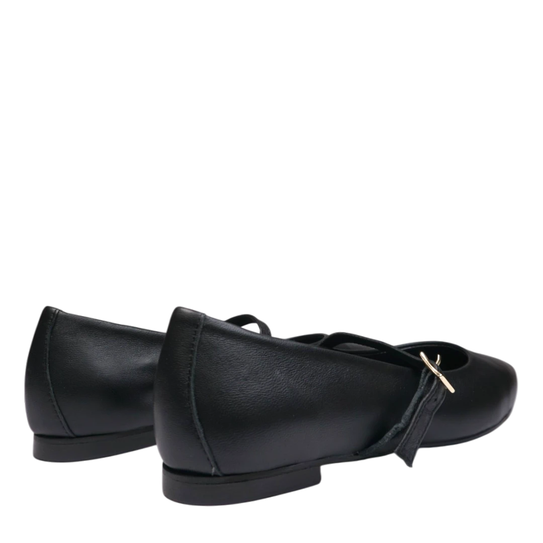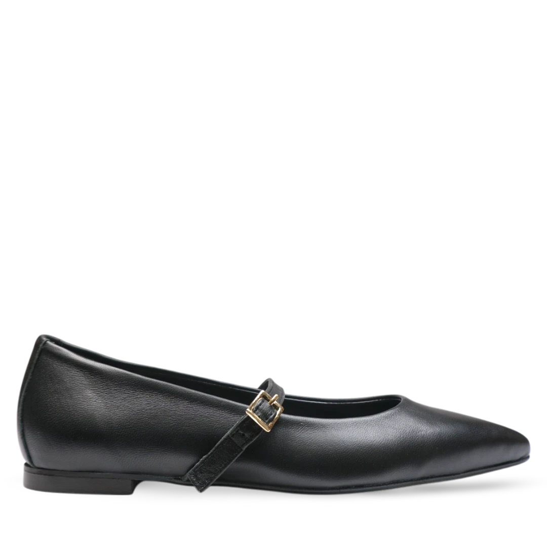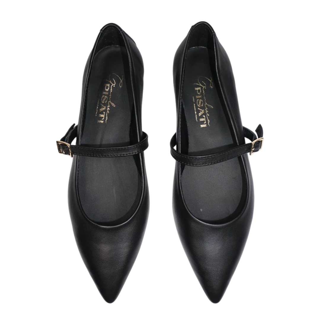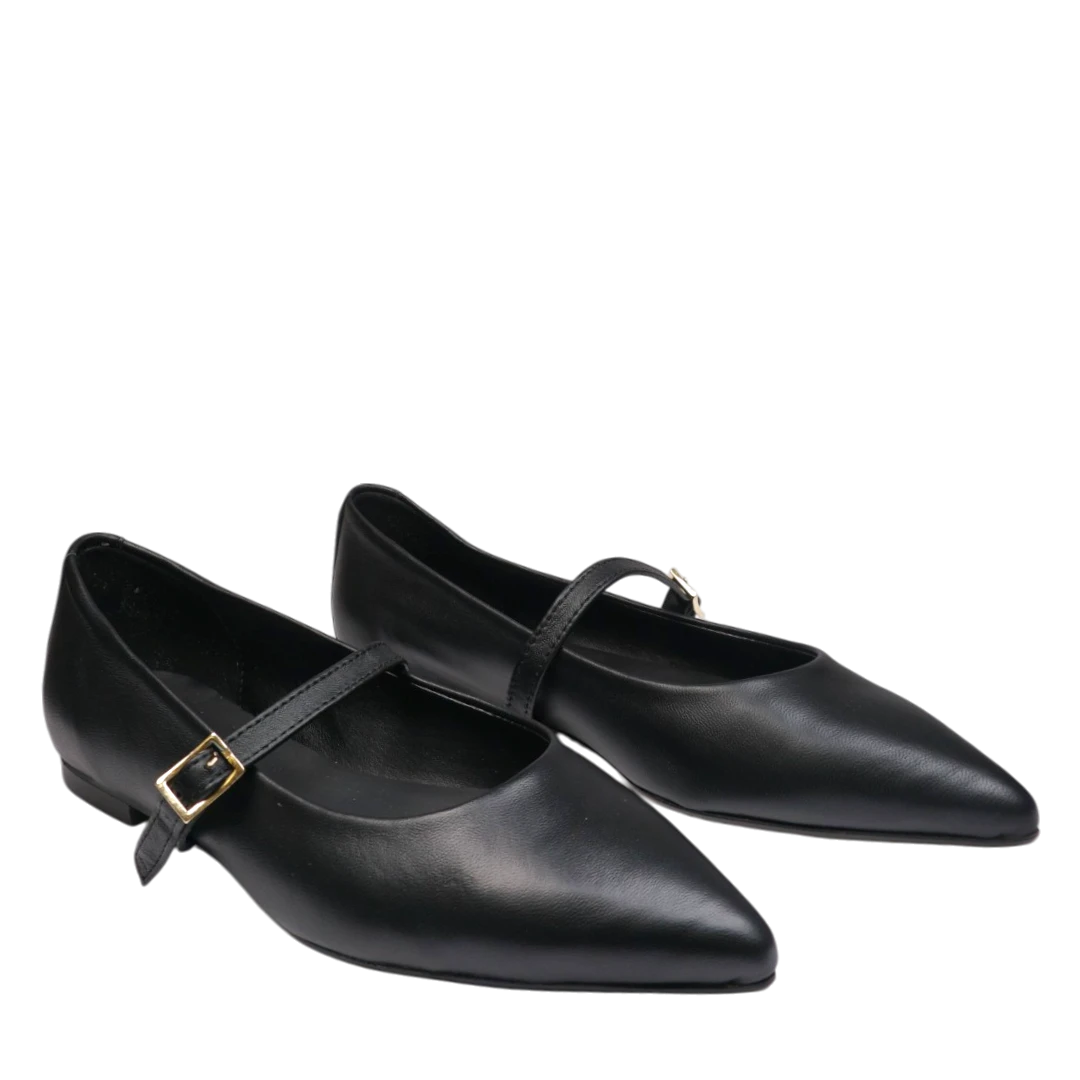 Ove ženske kožne cipele u klasičnoj crnoj boji odišu elegancijom i minimalizmom. Izrađene od glatke kože, ističu se špicastim vrhom i tankim kaišićem s bočne strane, koji dodaje retro šarm i osigurava stabilnost pri nošenju. Ravni đon pruža udobnost, čineći ih idealnim izborom za svakodnevne i poslovne kombinacije. Savršene su za dame koje cijene jednostavan, ali profinjen stil.