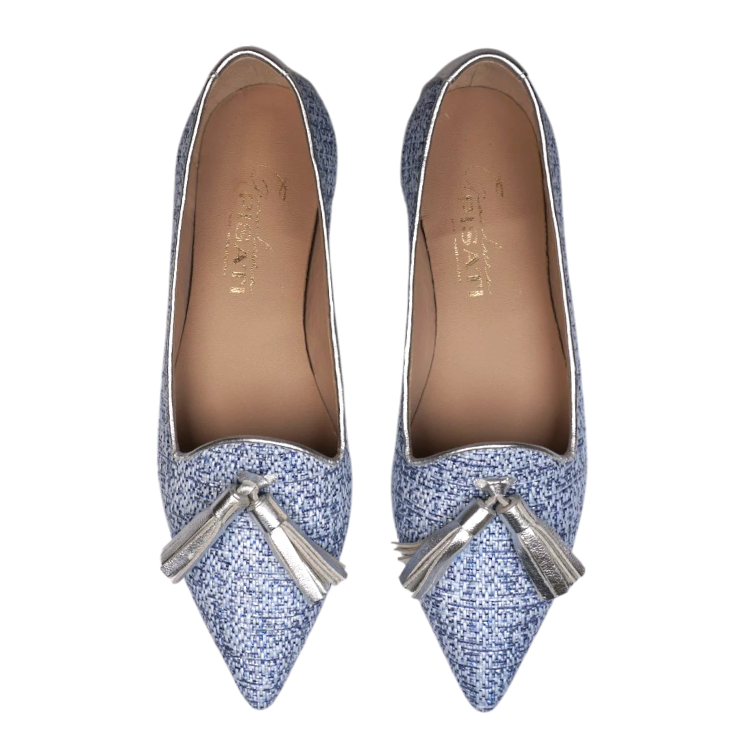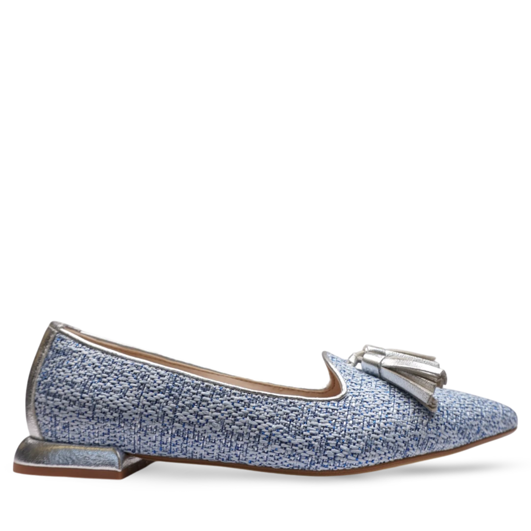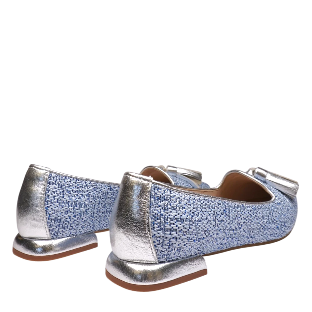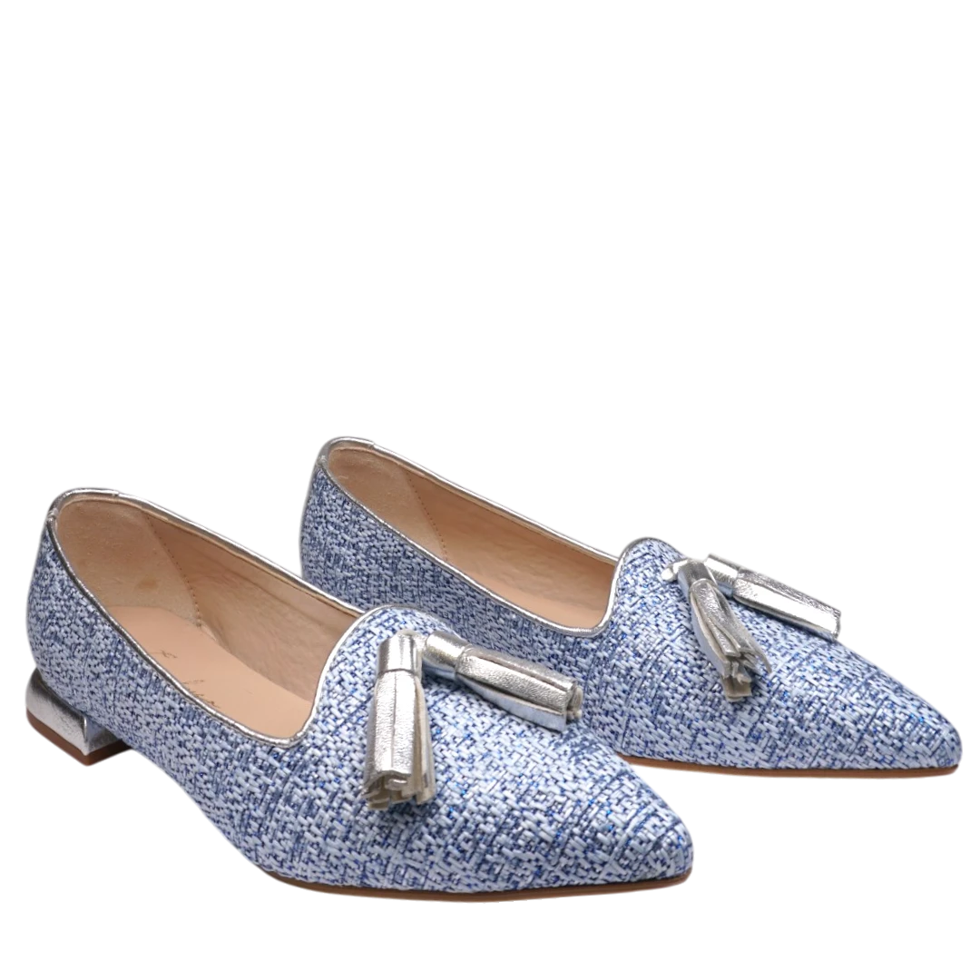 Ove ženske cipele u sofisticiranom mokasin stilu donose moderan spoj teksturiranog plavog tkanja i sjajnih srebrnih detalja. Ističu se metaliziranom resicom na prednjem dijelu i elegantno oblikovanom niskom petom, koja osigurava udobnost tokom cijelog dana. Kombinacija materijala i boja čini ih savršenim izborom za proljetne i ljetne outfite, a njihov ženstven i chic izgled lako se uklapa u poslovne i ležerne kombinacije.