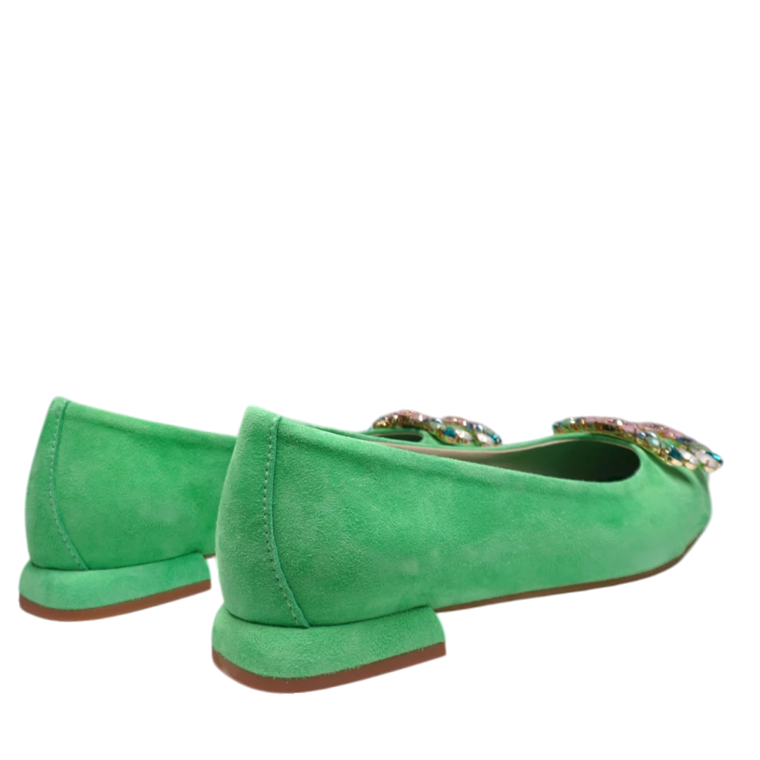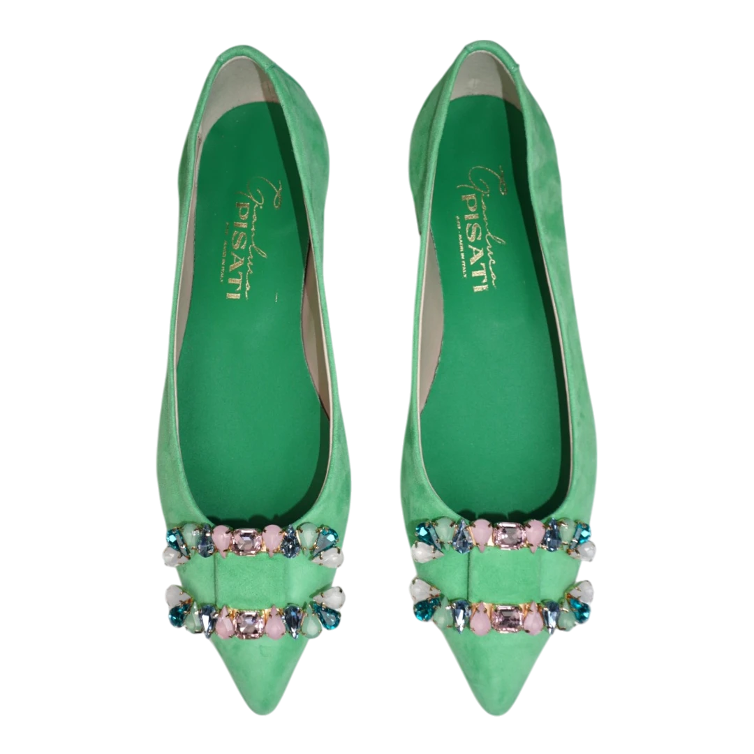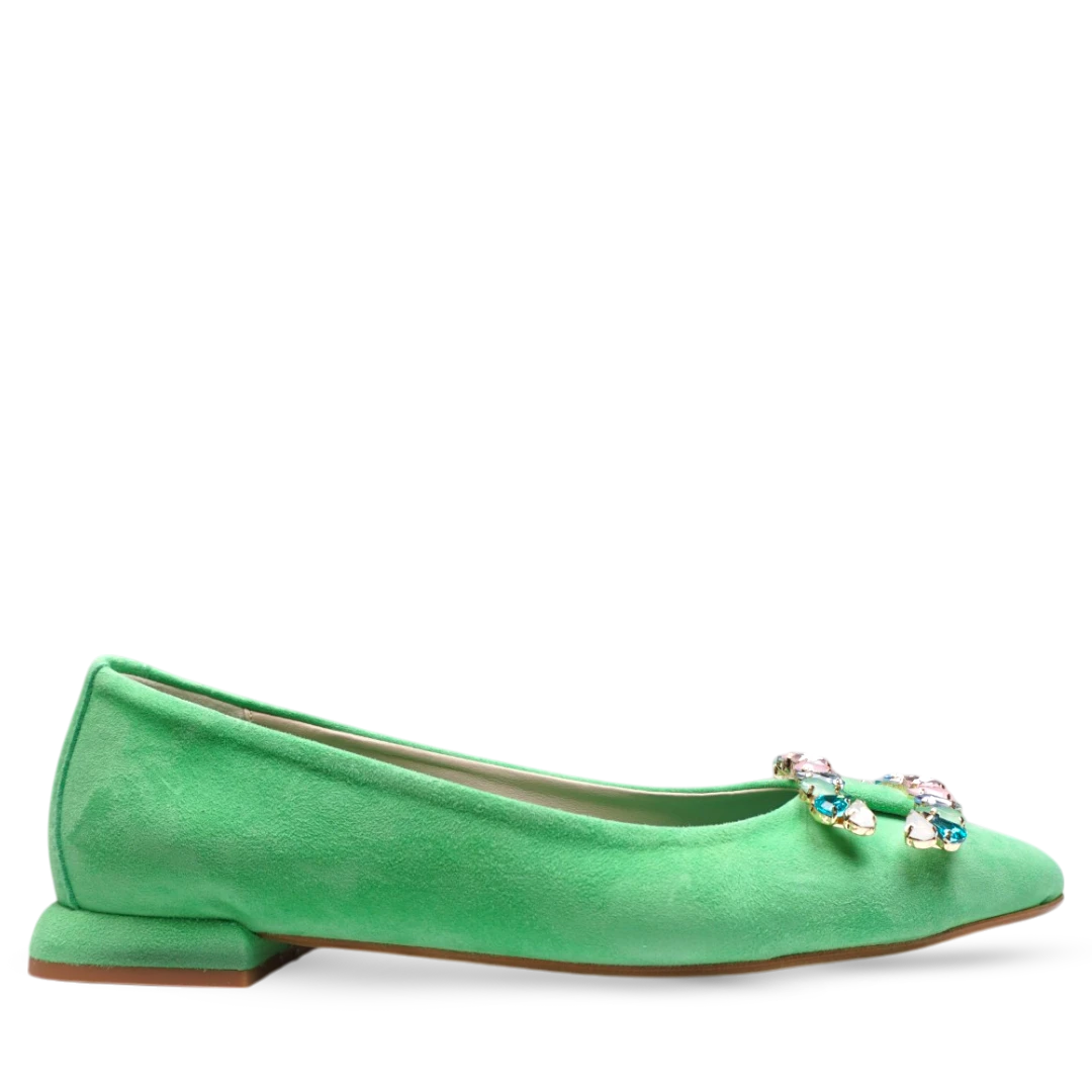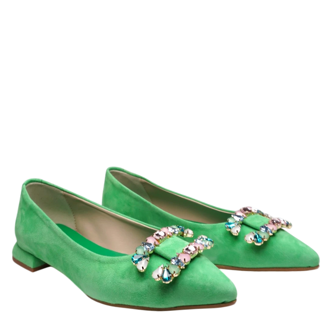 Ove ženske cipele u svježoj i vibrantnoj zelenoj boji donose dašak razigranosti i elegancije u svaki korak. Izrađene od mekane brušene kože, ističu se profinjenim špicastim vrhom i luksuznim ukrasima s kristalima na prednjem dijelu, koji unose blistav detalj. Niska blok peta osigurava udobnost i stabilnost, čineći ih idealnim za dnevne i večernje prilike. Savršen su izbor za dame koje vole upečatljive i stilski odvažne komade.