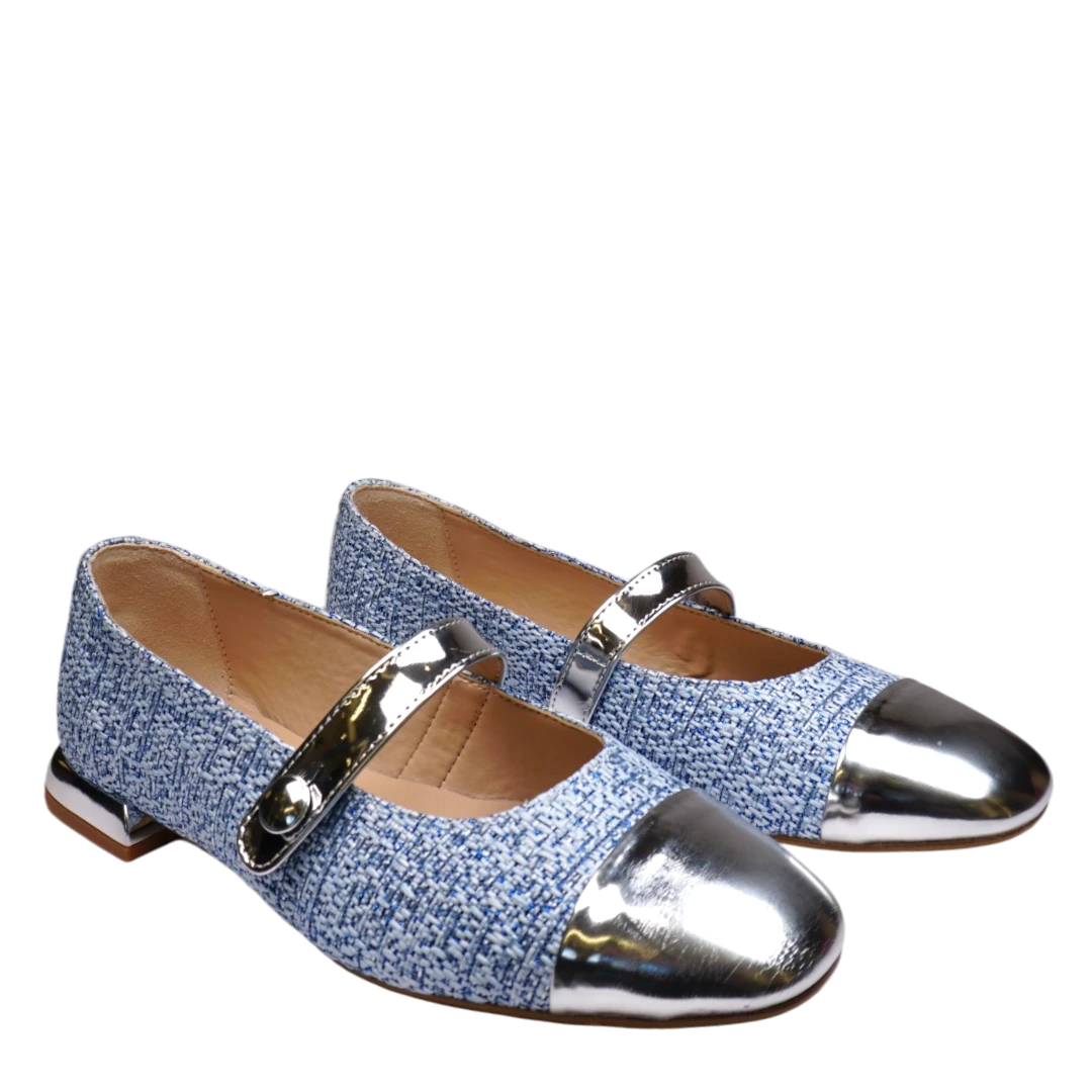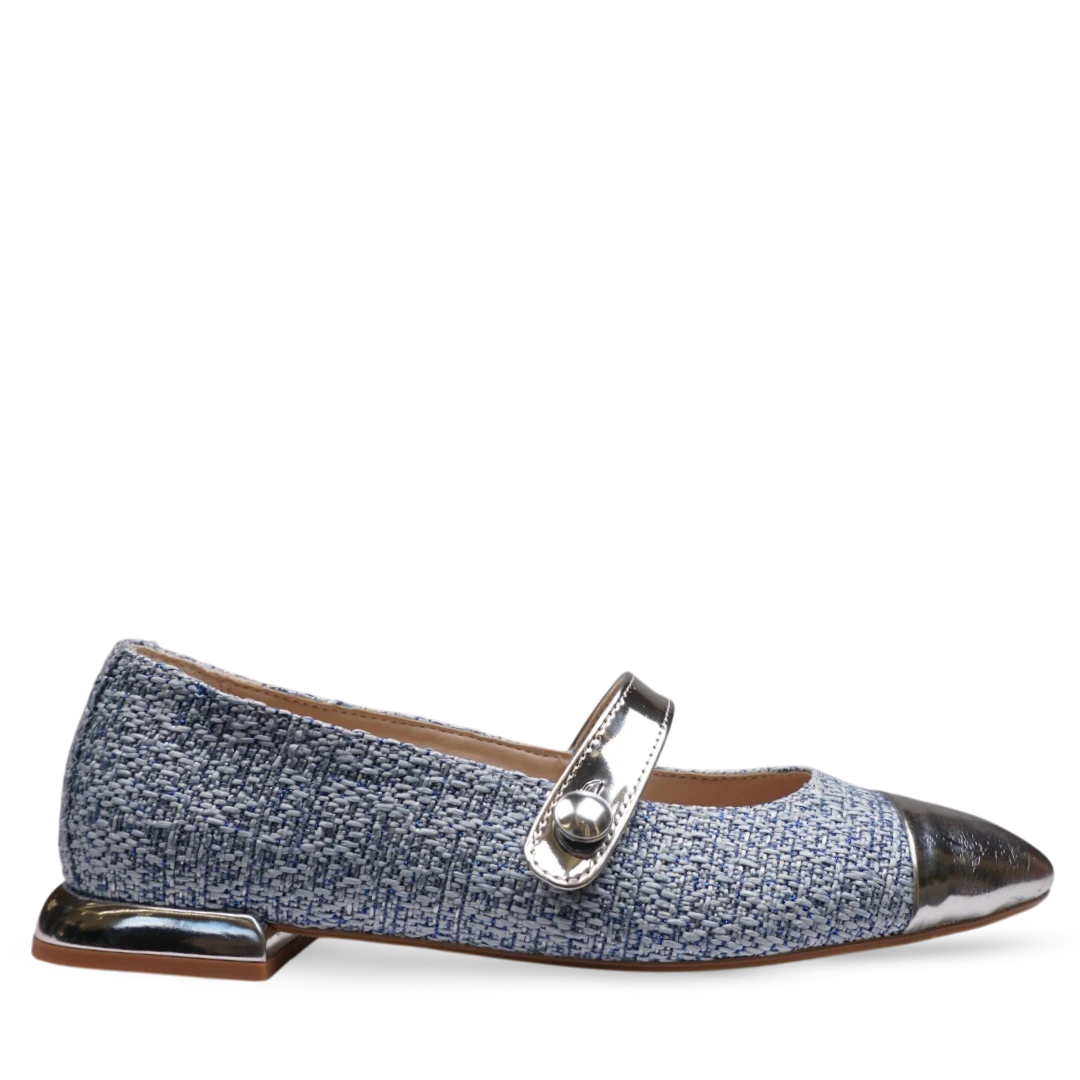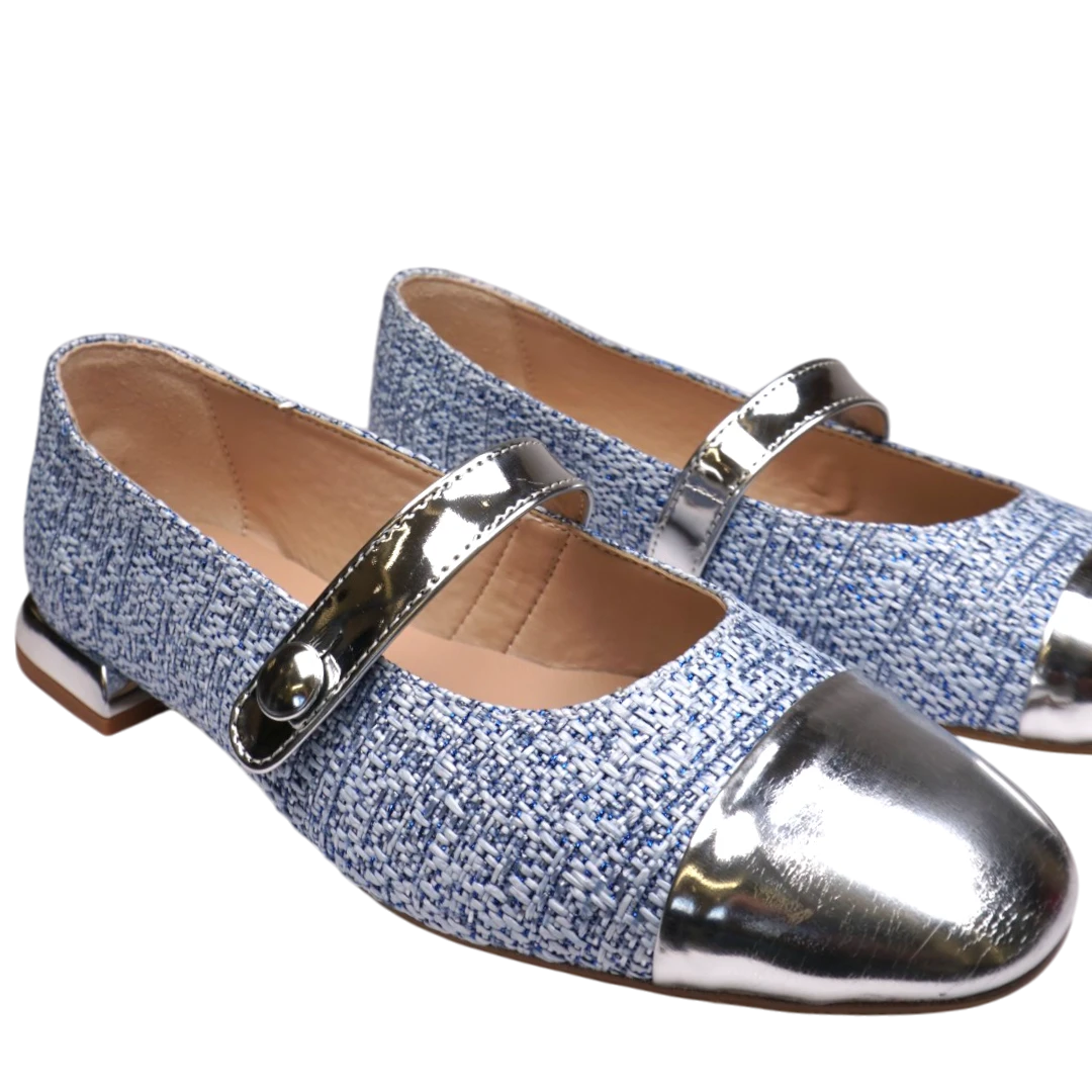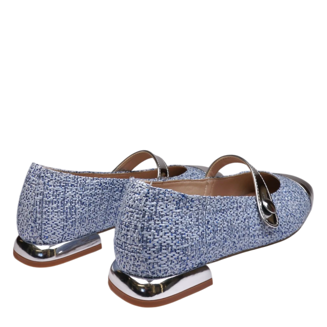 Ove ženske cipele donose jedinstvenu kombinaciju elegantnog plavog tkanja i sjajnih metalik detalja. Dizajnirane u baletanka stilu, krasi ih špicasti crni kap vrh u metalik finišu, kao i upečatljiv remenčić s dekorativnim dugmetom koji dodatno naglašava modni karakter modela. Niska, geometrijska peta obložena metalik materijalom pruža dodatnu stabilnost i vizuelni balans. Idealne su za moderne žene koje žele spoj elegancije, udobnosti i izraženog stila.