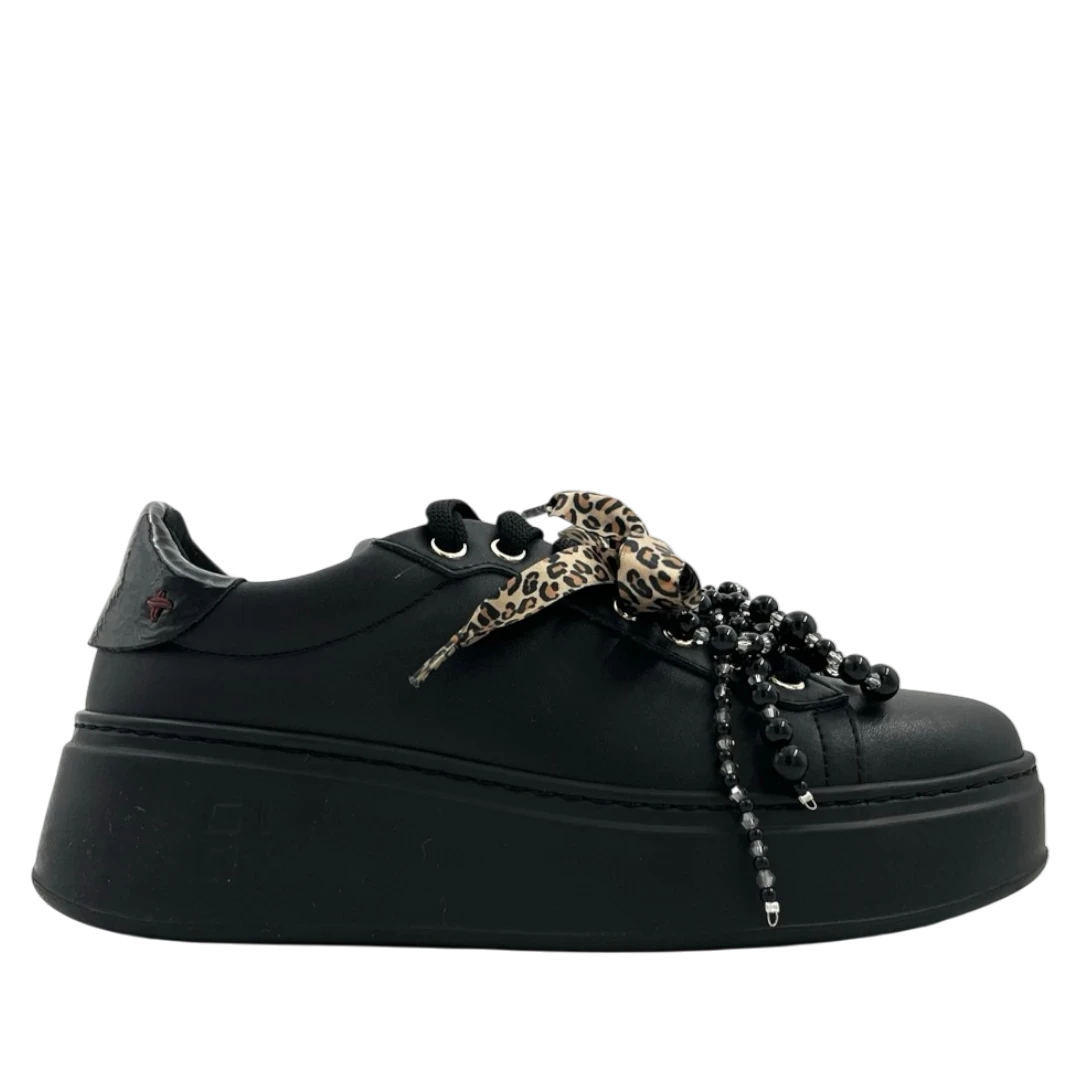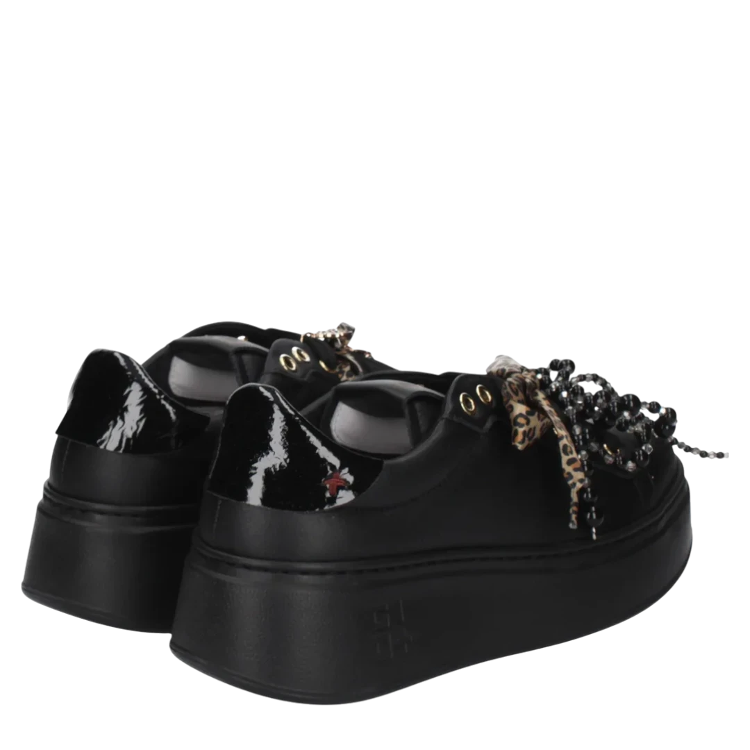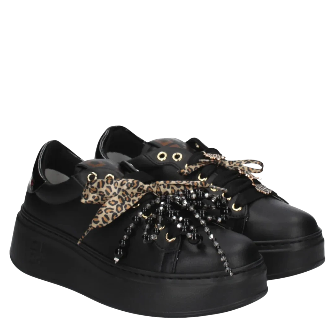 Ove GIO+ patike donose urban i odvažan izgled, idealan za sve koji žele istaknuti svoj stil. Potpuno crna kožna baza u kontrastu je s masivnim platform đonom, stvarajući moderan „total black“ efekat. Poseban pečat daju dekorativne vezice – kombinacija životinjskog printa i ukrasnih perli – koje dodaju notu glamura i ekstravagancije. Zahvaljujući udobnom obliku i kvalitetnoj izradi, ove patike su savršen spoj praktičnosti i modne odvažnosti, namijenjene damama koje vole biti u centru pažnje.