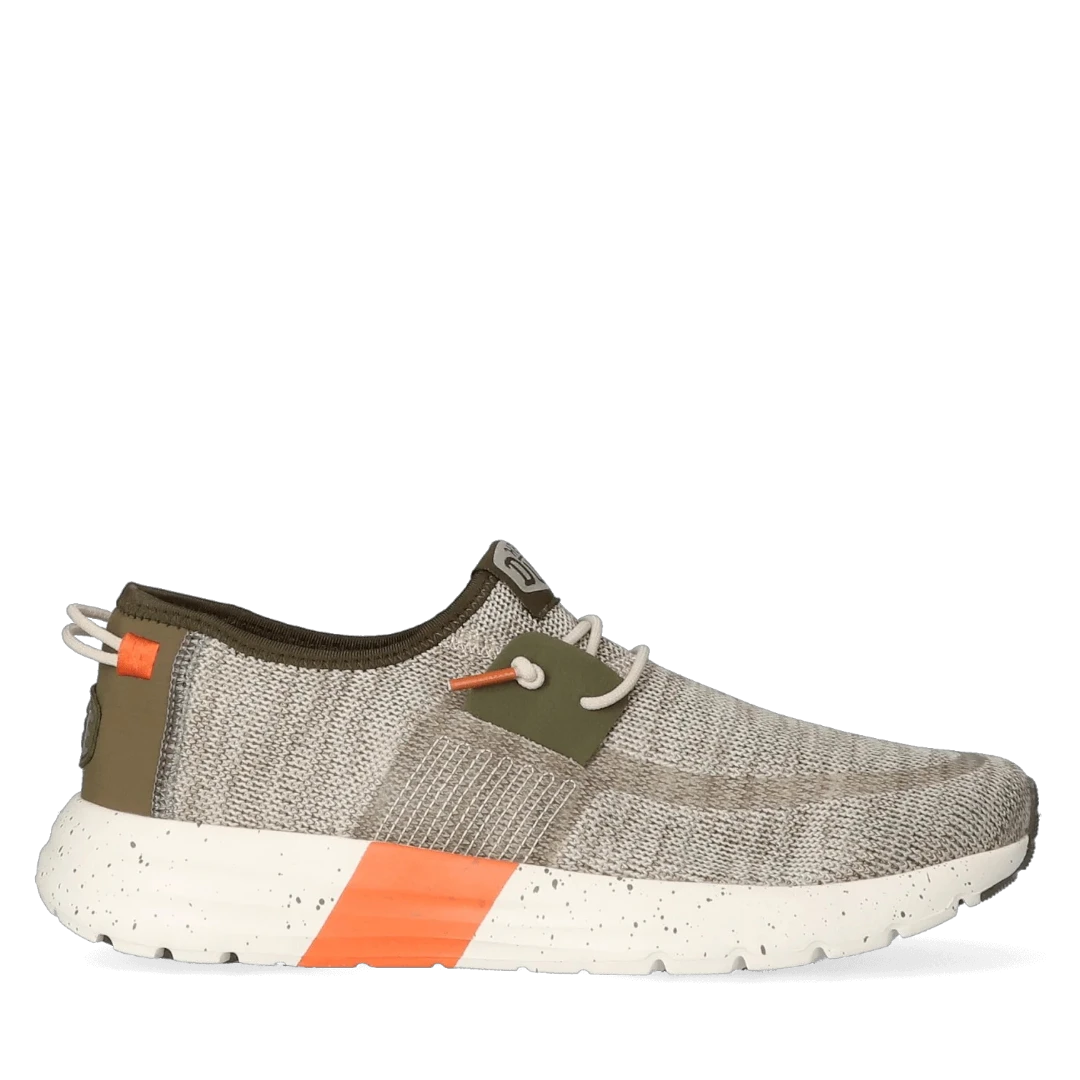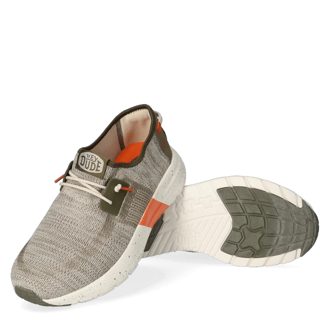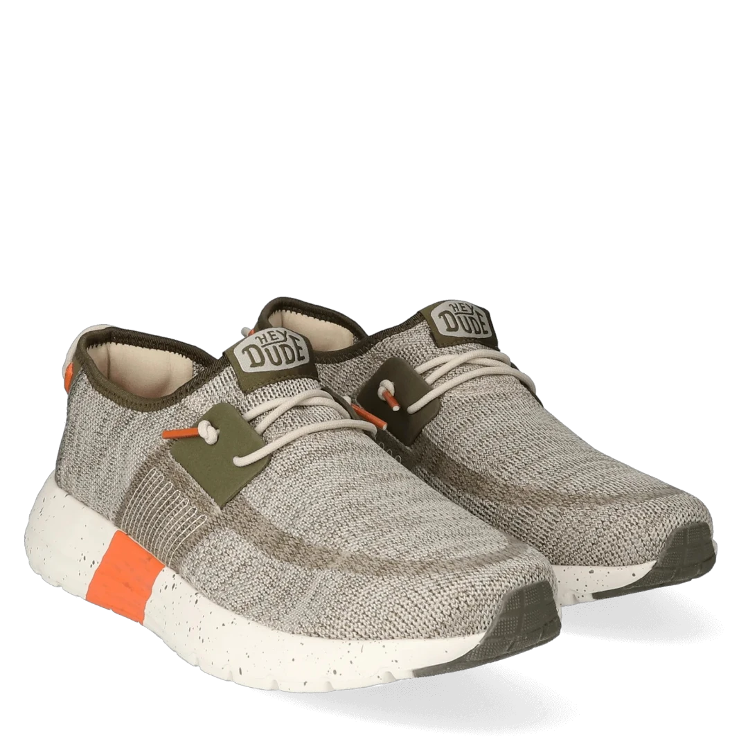 Ove muške Hey Dude patike spajaju sportski duh i urbani stil u laganom i funkcionalnom dizajnu. Izrađene od prozračnog, pletenog materijala u bež i maslinasto zelenim tonovima, savršene su za aktivan način života. Dinamičan izgled dodatno naglašava narandžasti detalj na đonu, koji donosi energiju i vizuelni kontrast. Ultra lagani bijeli đon s prošaranim detaljima pruža maksimalnu udobnost i fleksibilnost, dok elastične vezice osiguravaju lako obuvanje. Idealne su za šetnje, putovanja, svakodnevne obaveze – gdje god vas dan odvede, ove patike idu s vama u korak.