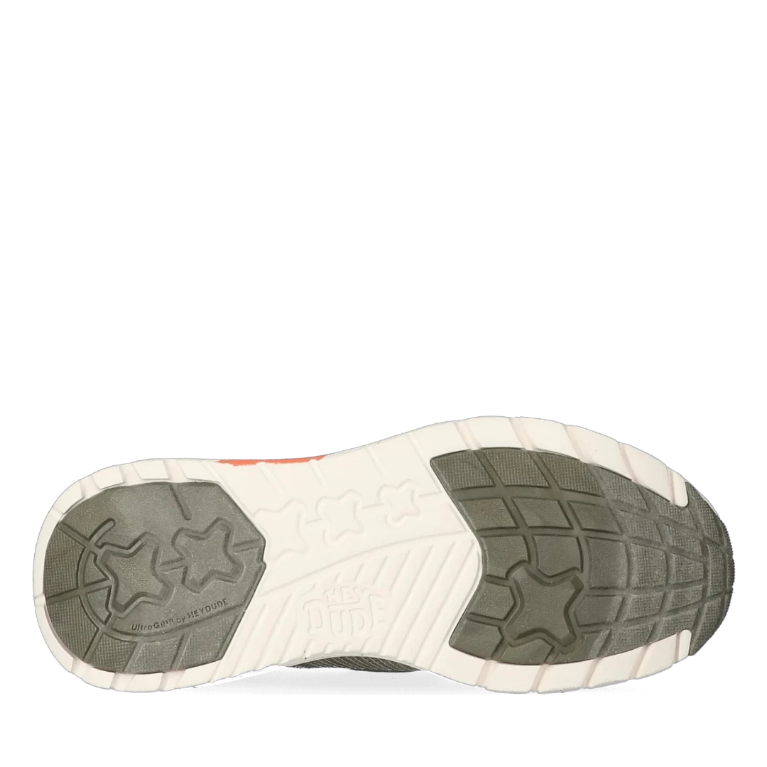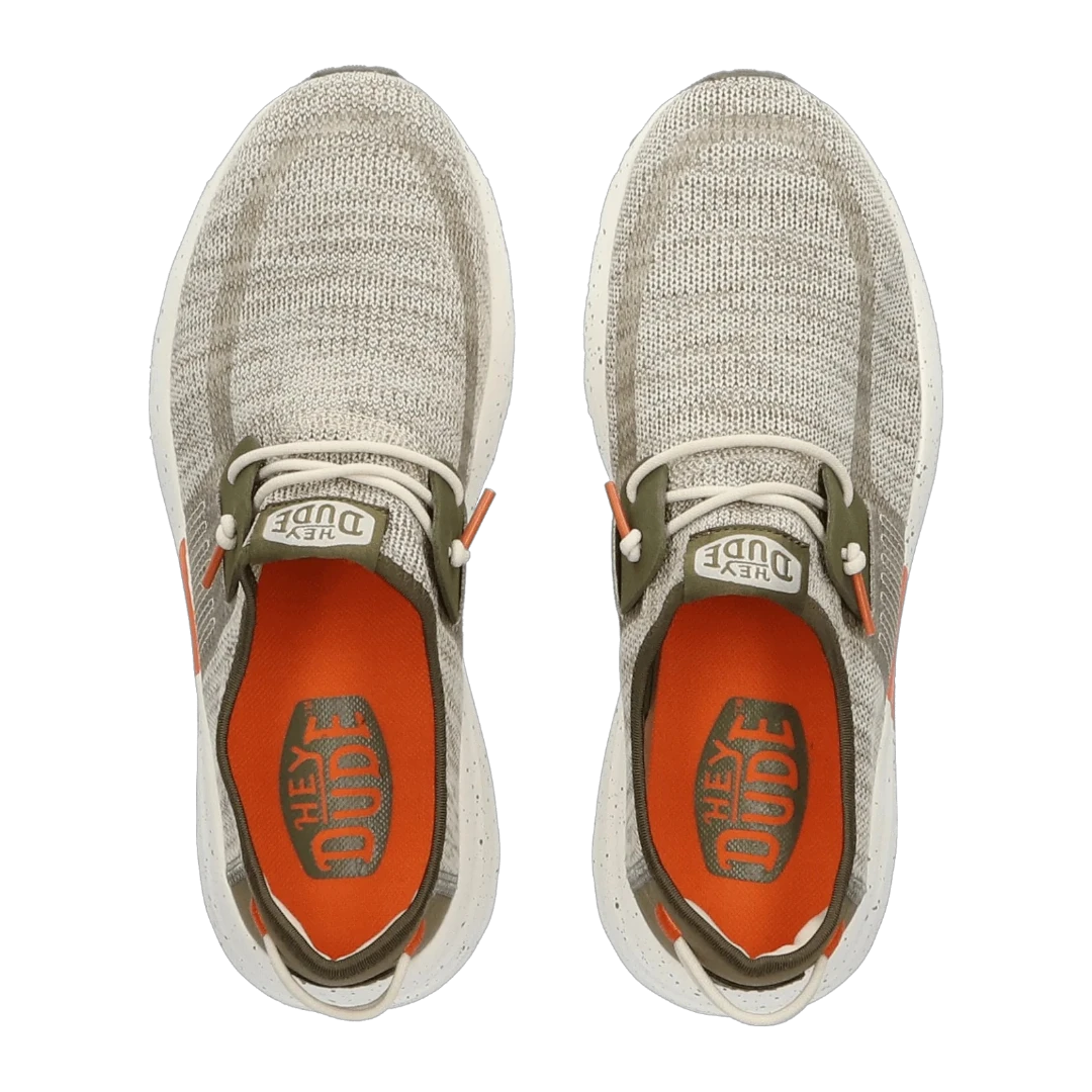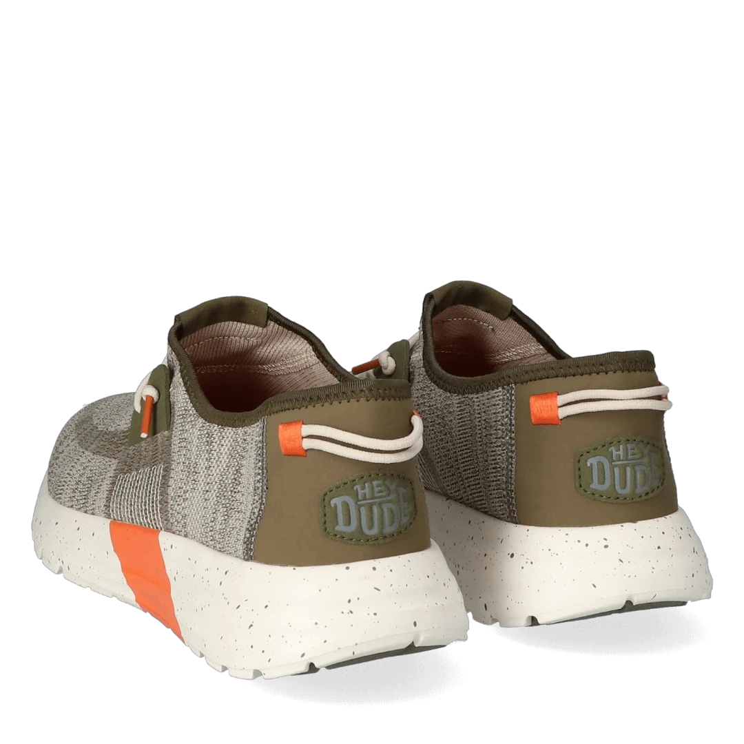 Ove muške Hey Dude patike spajaju sportski duh i urbani stil u laganom i funkcionalnom dizajnu. Izrađene od prozračnog, pletenog materijala u bež i maslinasto zelenim tonovima, savršene su za aktivan način života. Dinamičan izgled dodatno naglašava narandžasti detalj na đonu, koji donosi energiju i vizuelni kontrast. Ultra lagani bijeli đon s prošaranim detaljima pruža maksimalnu udobnost i fleksibilnost, dok elastične vezice osiguravaju lako obuvanje. Idealne su za šetnje, putovanja, svakodnevne obaveze – gdje god vas dan odvede, ove patike idu s vama u korak.