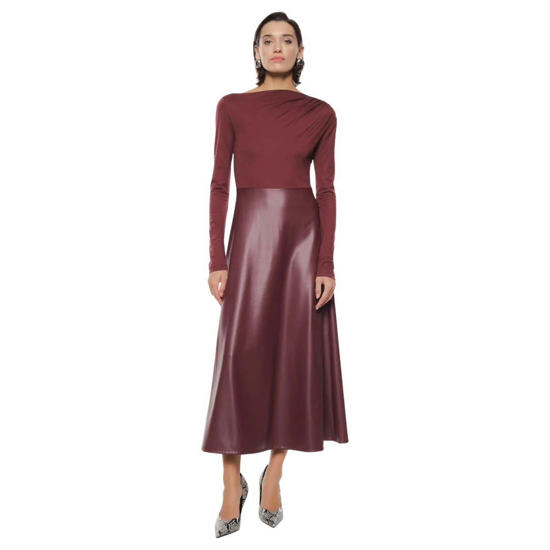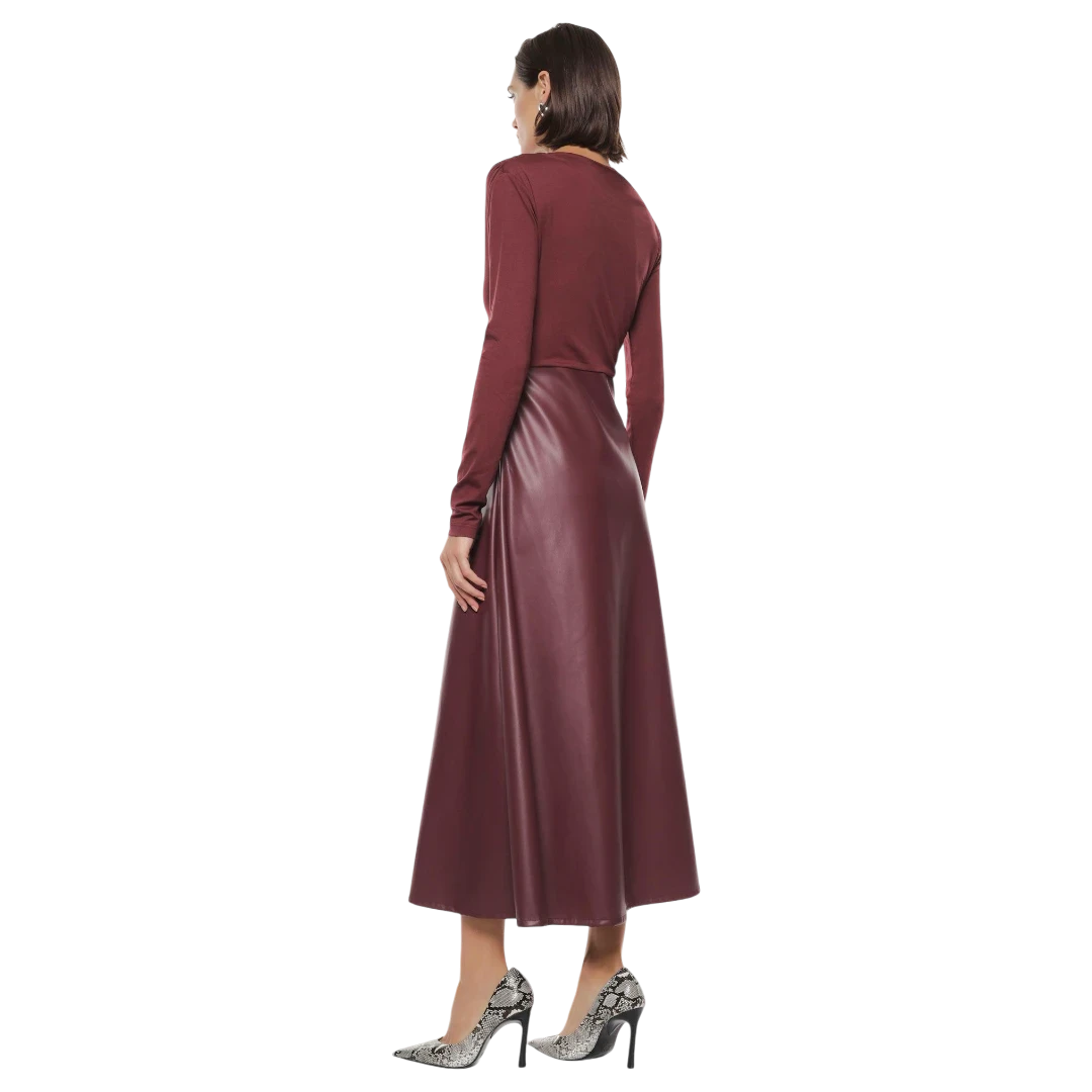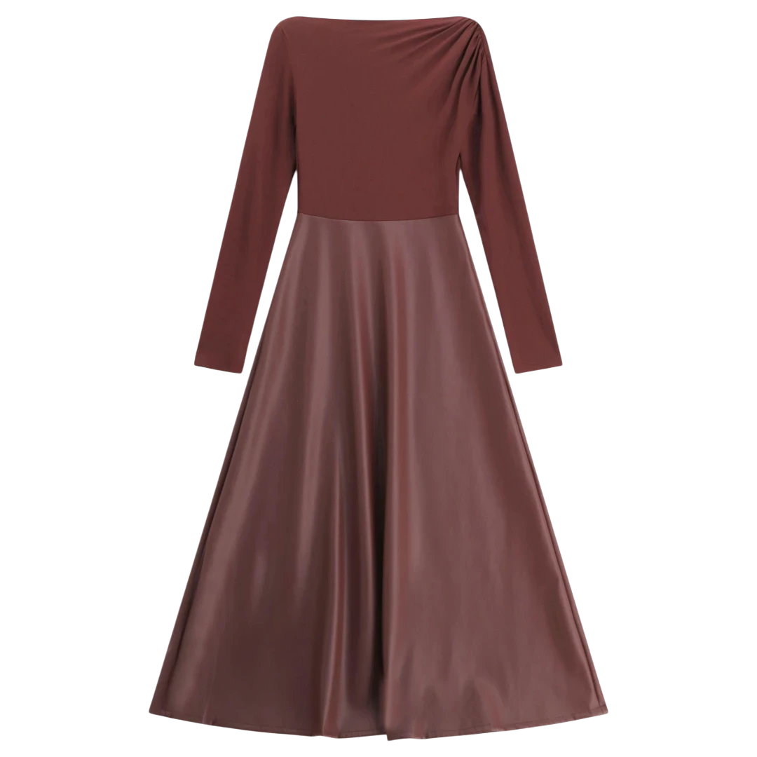Ova Imperial haljina odiše elegancijom s modernim, minimalističkim dodirom. Gornji dio od elastične tkanine prati liniju tijela i pruža savršeno pristajanje, dok donji dio od glatke eko kože u A-kroju unosi dašak sofisticiranosti i urbanog stila. Asimetrični nabor na ramenu dodaje suptilan modni akcenat, a bogata nijansa čokolade naglašava luksuzan karakter modela. Idealna je za večernje prilike, poslovne evente ili posebne trenutke kada želiš izgledati profinjeno i samouvjereno.