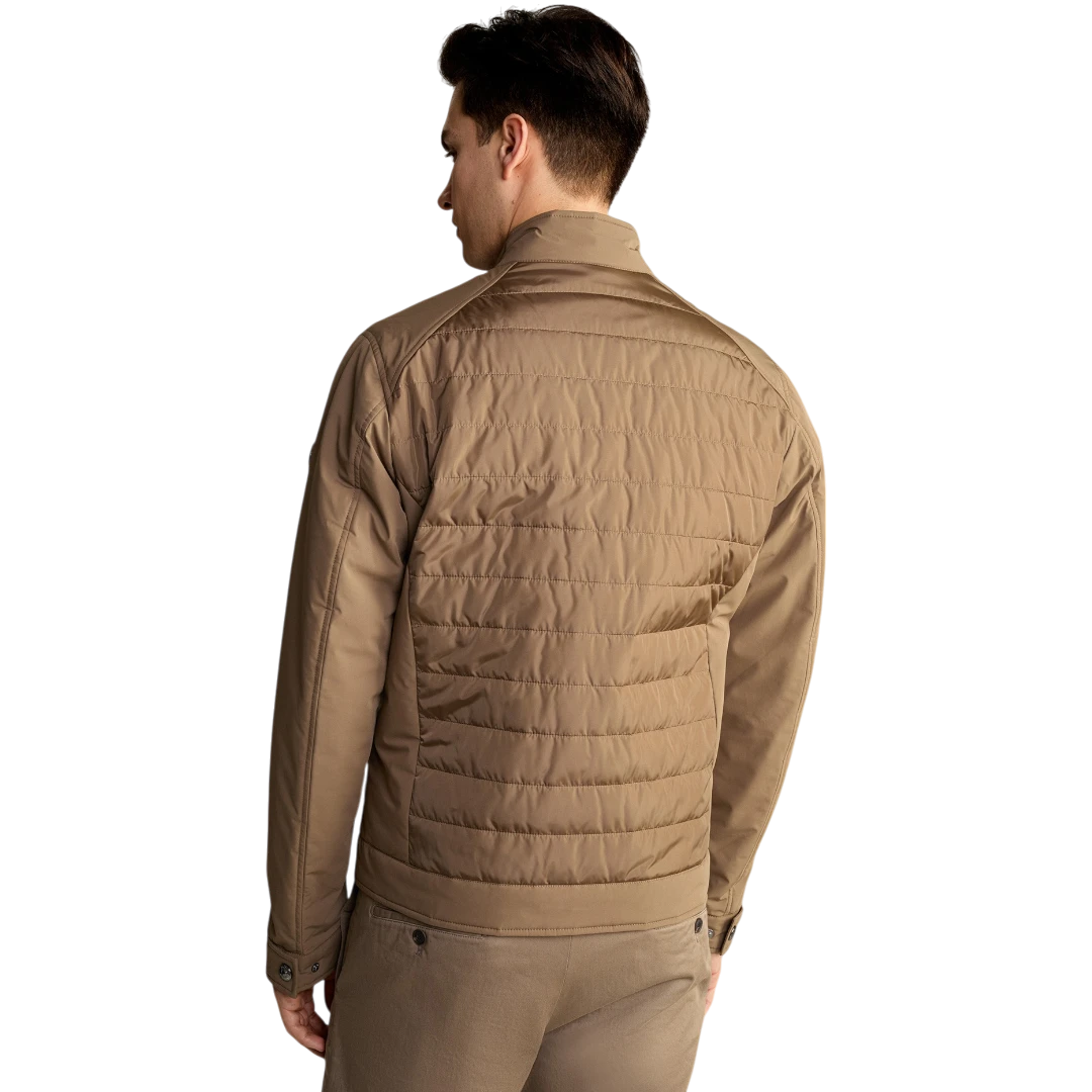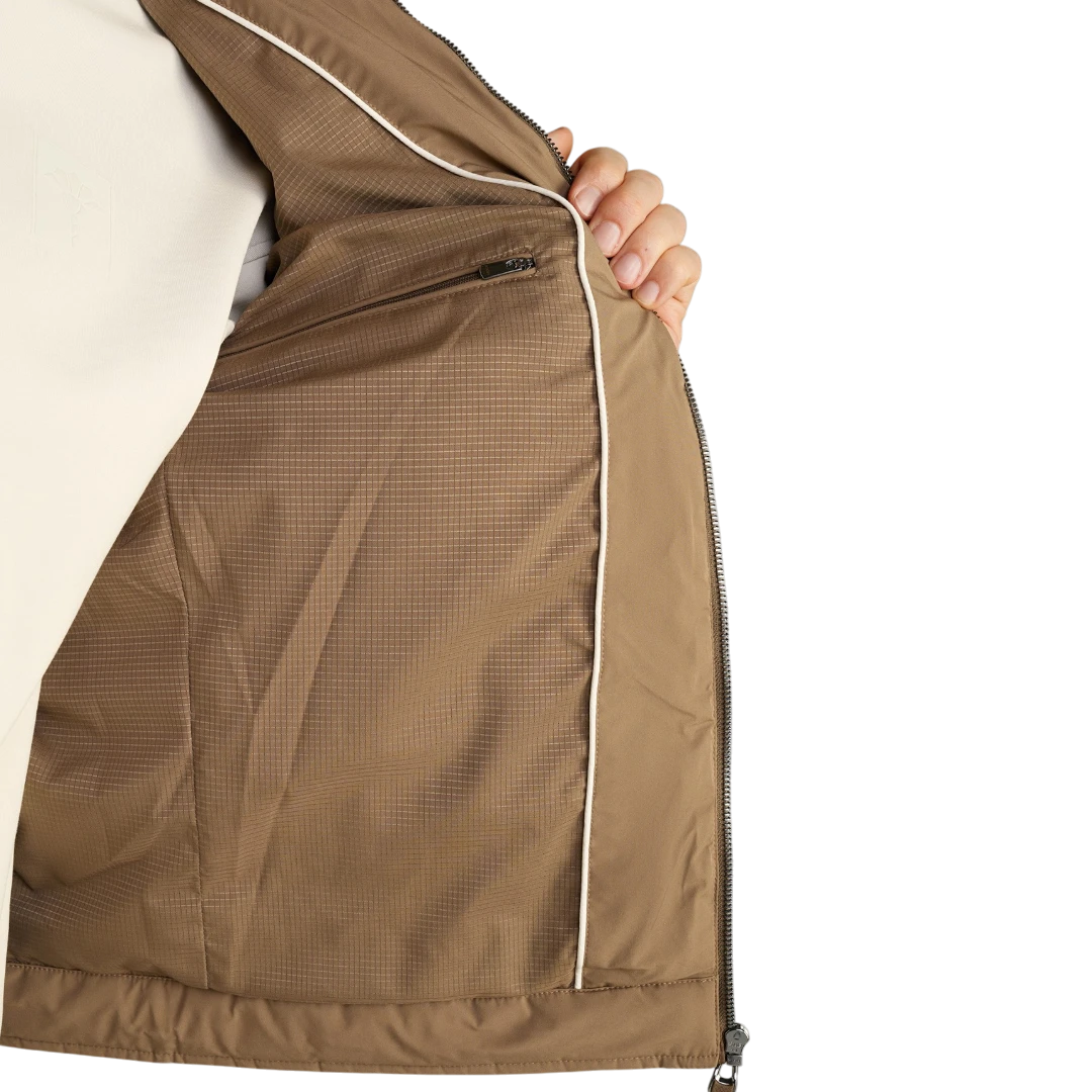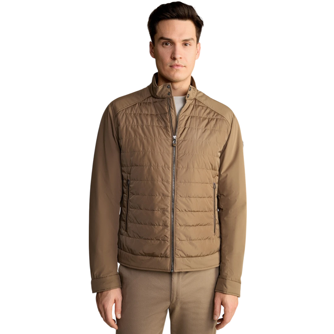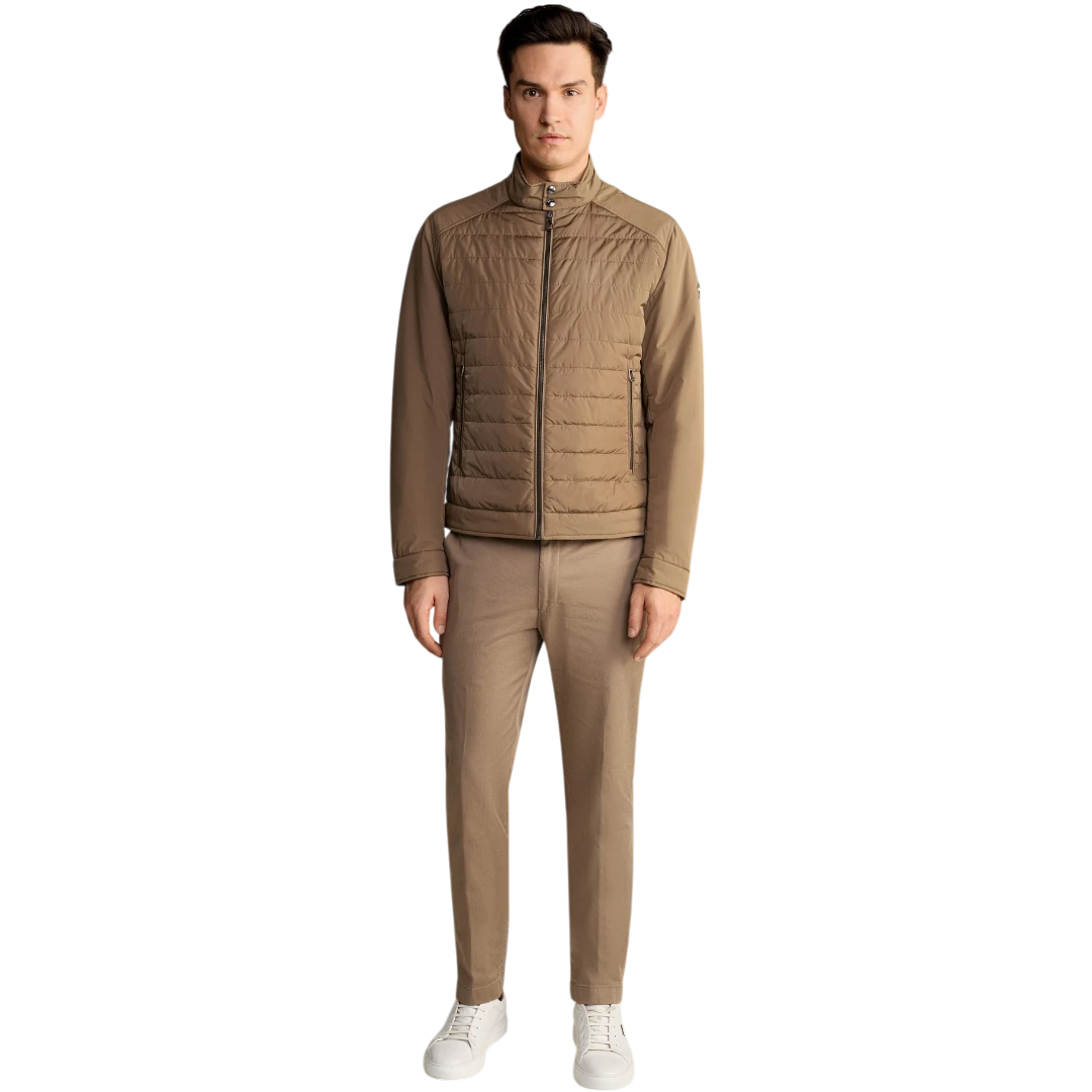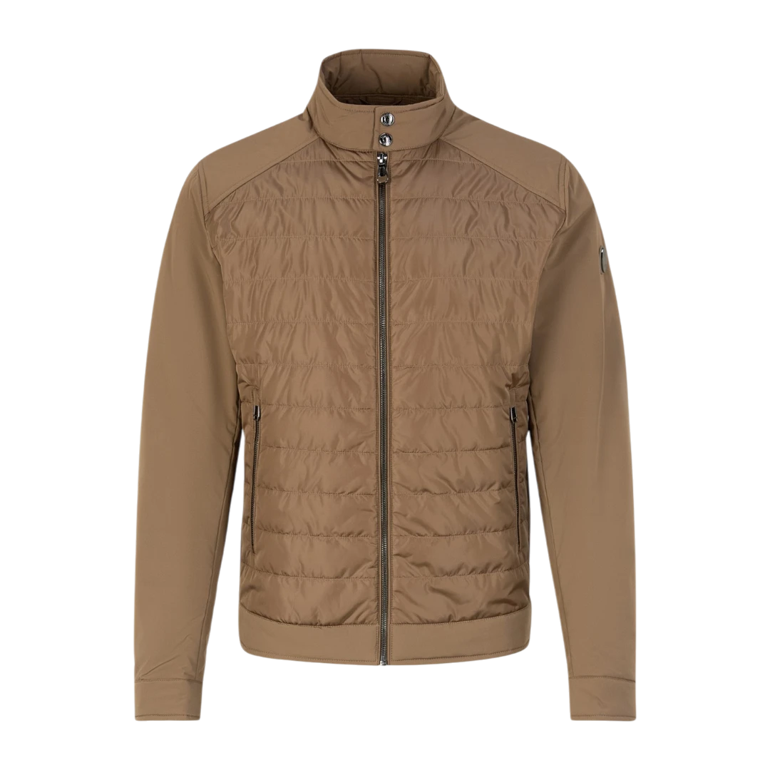 Joop! muška jakna u smeđoj boji ističe se modernim dizajnom sa elegantnom kombinacijom prošivenih i glatkih sekcija, čineći je savršenim izborom za stilizirane, ali udobne dnevne kombinacije. Regular Fit kroj osigurava udobnost i slobodu pokreta, dok postavljena tehnološka ispuna pruža laganu toplinu, idealnu za prijelazne sezone. Jakna se zatvara pomoću patentnog zatvarača s logotipom, a visoki ovratnik s drukerima dodaje sofisticiran izgled uz dodatnu zaštitu od vjetra. Praktičnost naglašavaju dva bočna džepa s patentnim zatvaračem i unutrašnji džep s kopčanjem, savršen za sigurno spremanje manjih predmeta. Manžetne na rukavima s drukerima omogućuju prilagodbu, dok stilizirana amblem pločica s logotipom na lijevom rukavu dodaje prepoznatljiv završni detalj.