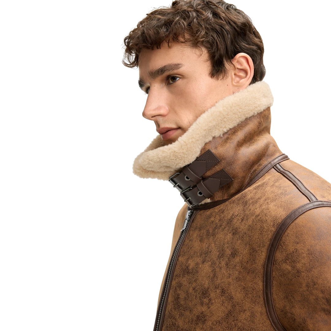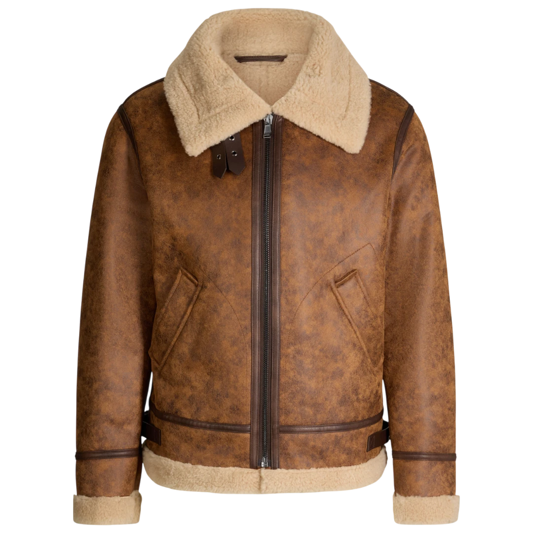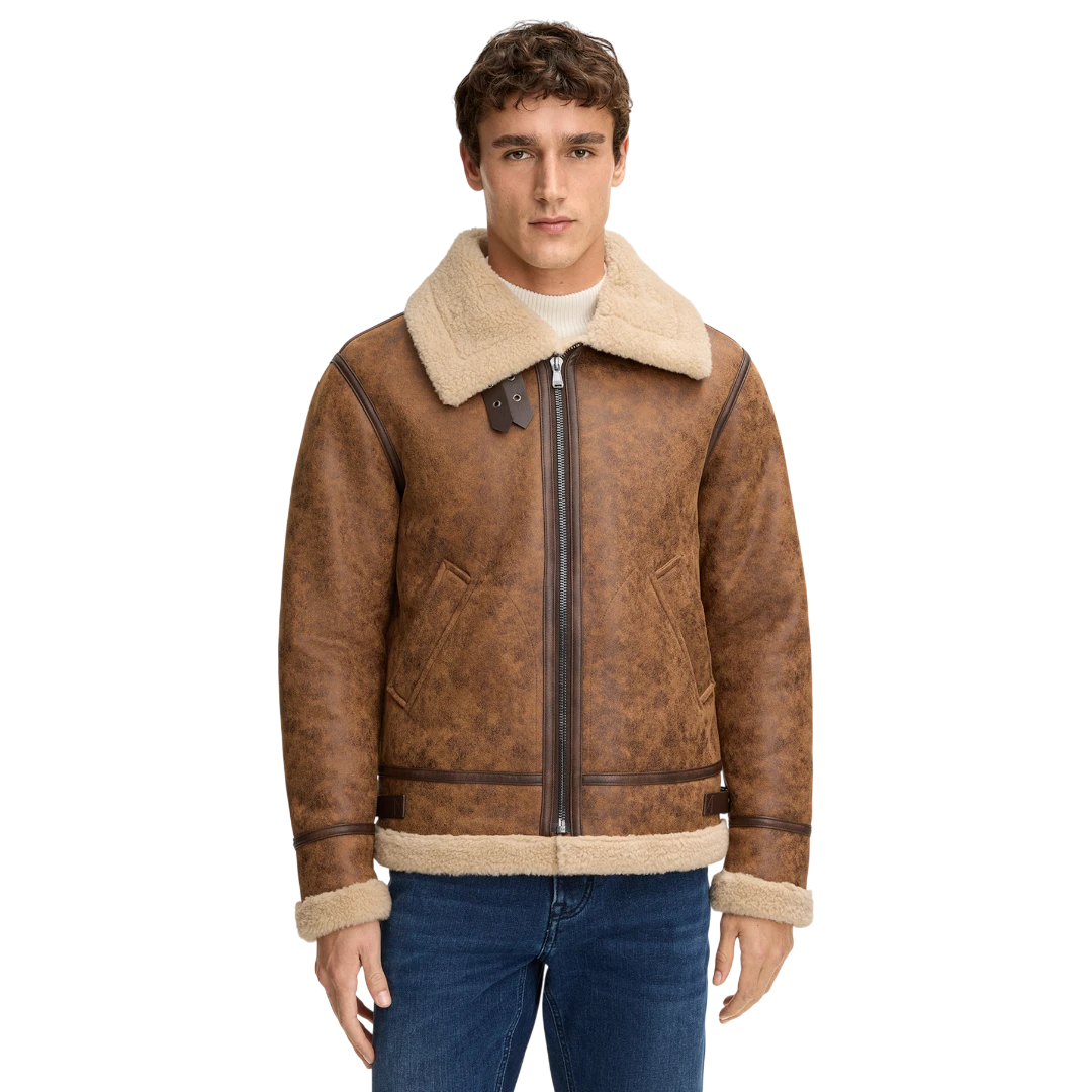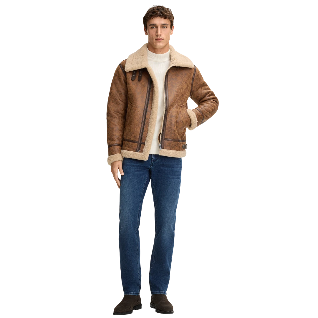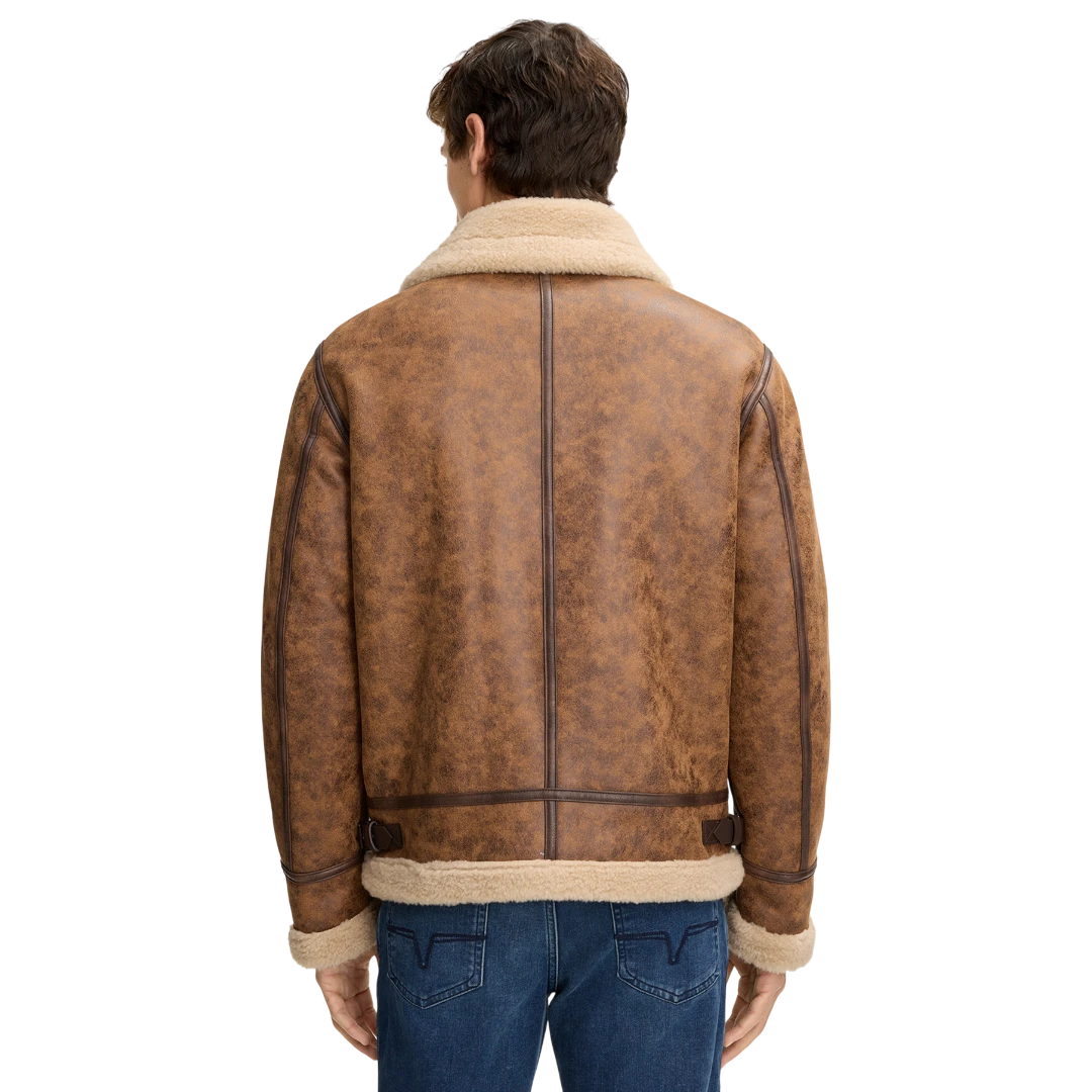 JOOP! muška shearling jakna u toploj konjak smeđoj nijansi donosi savršen spoj luksuza, retro šarma i savremenog dizajna. Inspirisana klasičnim avijatičarskim stilom, izrađena je od mekanog materijala s efektnim brušenim izgledom, dok unutrašnja podstava i široka kragna od umjetnog krzna pružaju izuzetnu toplinu i udobnost. Precizno krojeni paneli, dupli rajsferšlus i dekorativne kožne trake dodatno naglašavaju njen bogat karakter. Ovaj model savršeno kombinuje funkcionalnost i estetiku – idealan je za urbane zimske outfite i daje svakom looku moćan, sofisticiran završni ton.