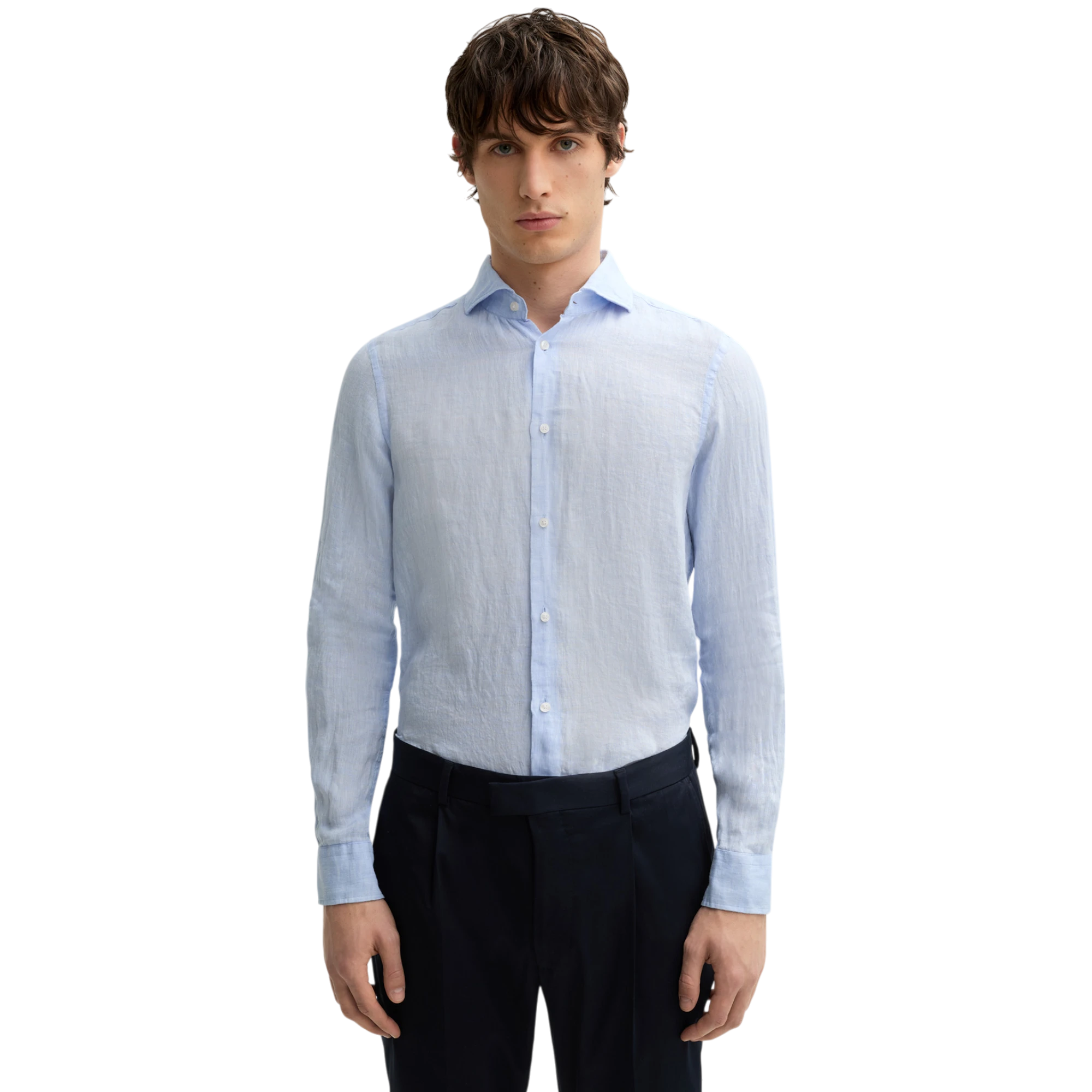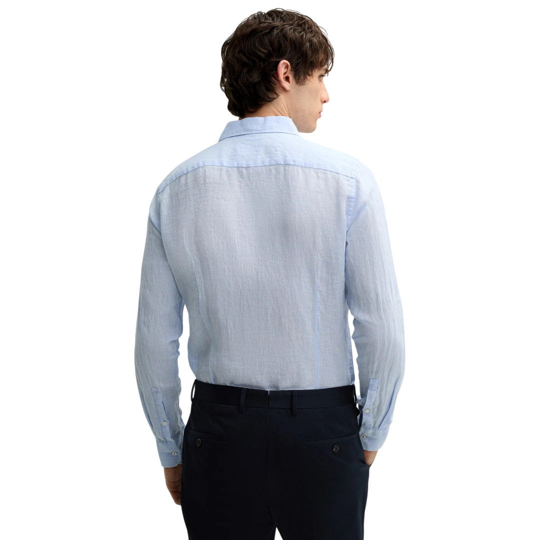 Košulja Pit izrađena od fine lanene tkanine donosi idealan spoj elegancije i ležernog stila. Slim fit kroj naglašava siluetu, dok klasični detalji poput cutaway kragne, glatke dugmadi i zaobljenog poruba doprinose sofisticiranom izgledu. Dugi rukavi sa manžetnama, ukrasnim prorezom i prepoznatljivim koncem u obliku kukuruza na lijevoj strani dodatno ističu pažnju prema detaljima. Uski rameni šavovi i formirajući šavovi čine ovaj model savršenim izborom za toplije dane, bilo da je riječ o poslovnom ili smart-casual outfitu.