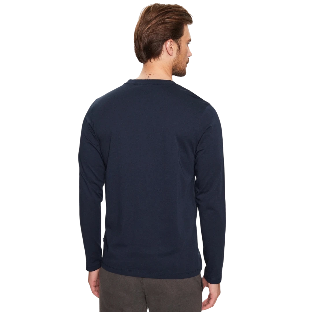 Muška majica dugih rukava u teget boji savršen je izbor za svakodnevne kombinacije zahvaljujući klasičnom regular fit kroju koji pruža udobnost i slobodu pokreta. Izrađena od 100% pamuka, garantuje prozračnost i prijatan osjećaj na koži. Jednostavan dizajn čini ovu majicu svestranim komadom garderobe, idealnim za nošenje samostalno ili kao sloj ispod jakne ili džempera, bilo u ležernim ili poluformalnim prilikama.