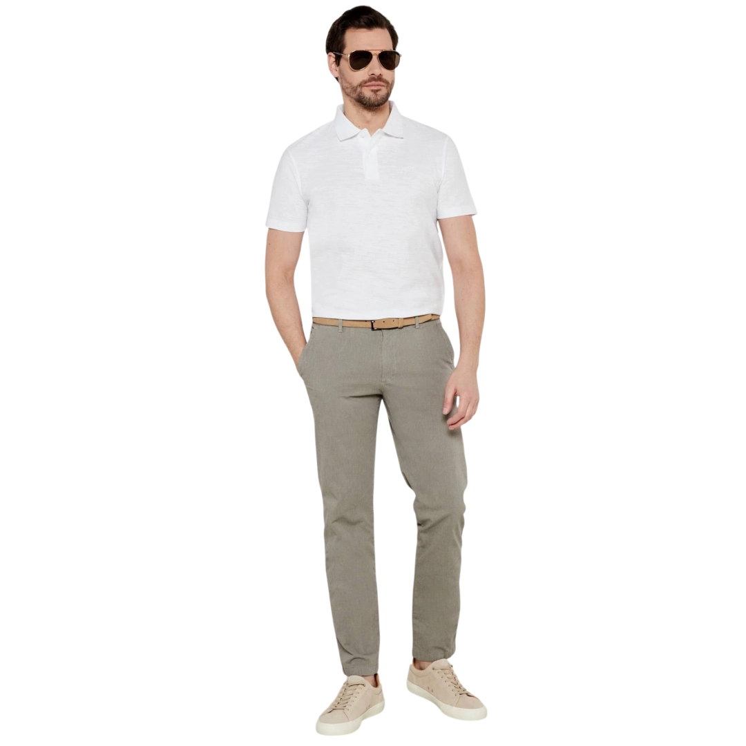 JOOP! bijela polo majica predstavlja spoj klasične elegancije i moderne udobnosti. Izrađena od visokokvalitetnog pamuka, karakteriše je blago strukturirana tkanina s diskretnim melange efektom. Klasični polo okovratnik, kratka dugmadena traka i uredno završeni rukavi doprinose sofisticiranom izgledu, dok tonalni JOOP! logotip na grudima unosi suptilan brendirani detalj. Zahvaljujući ravnom kroju i mekoj teksturi, ova majica je idealan izbor za svakodnevni stil s dozom elegancije.