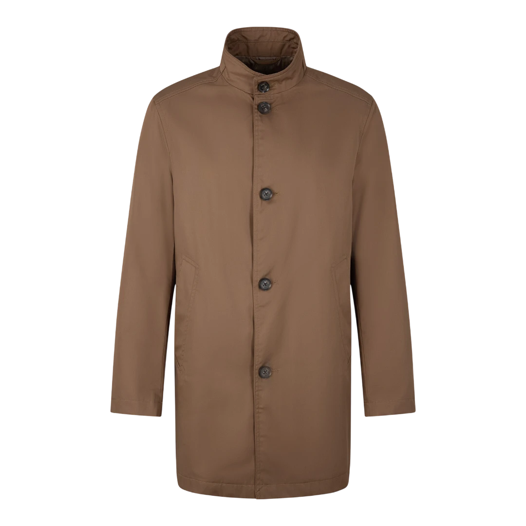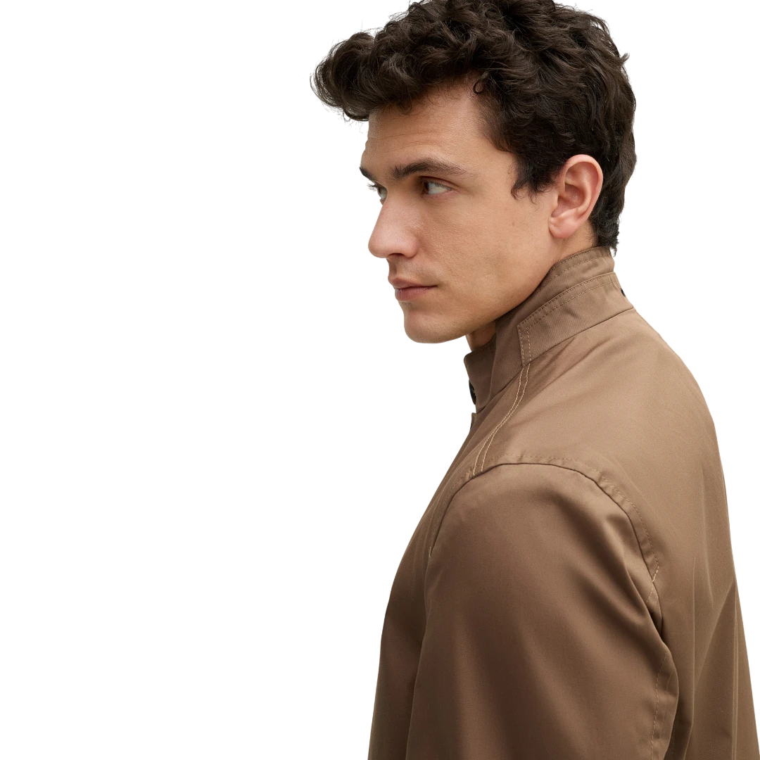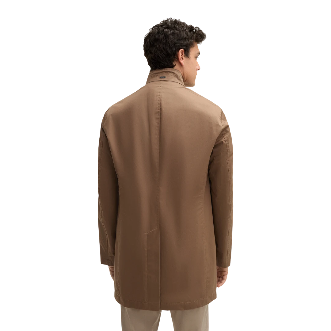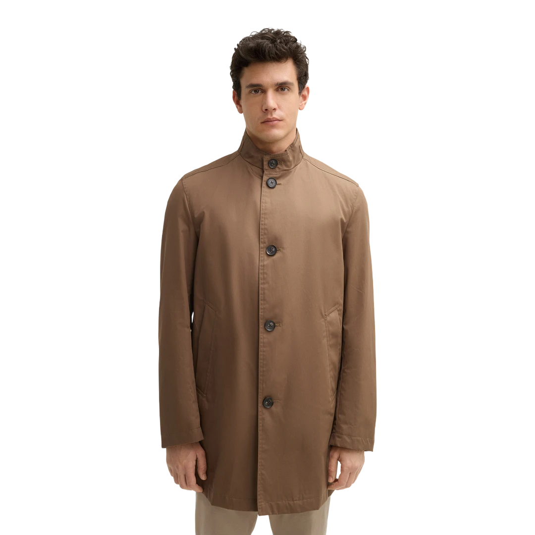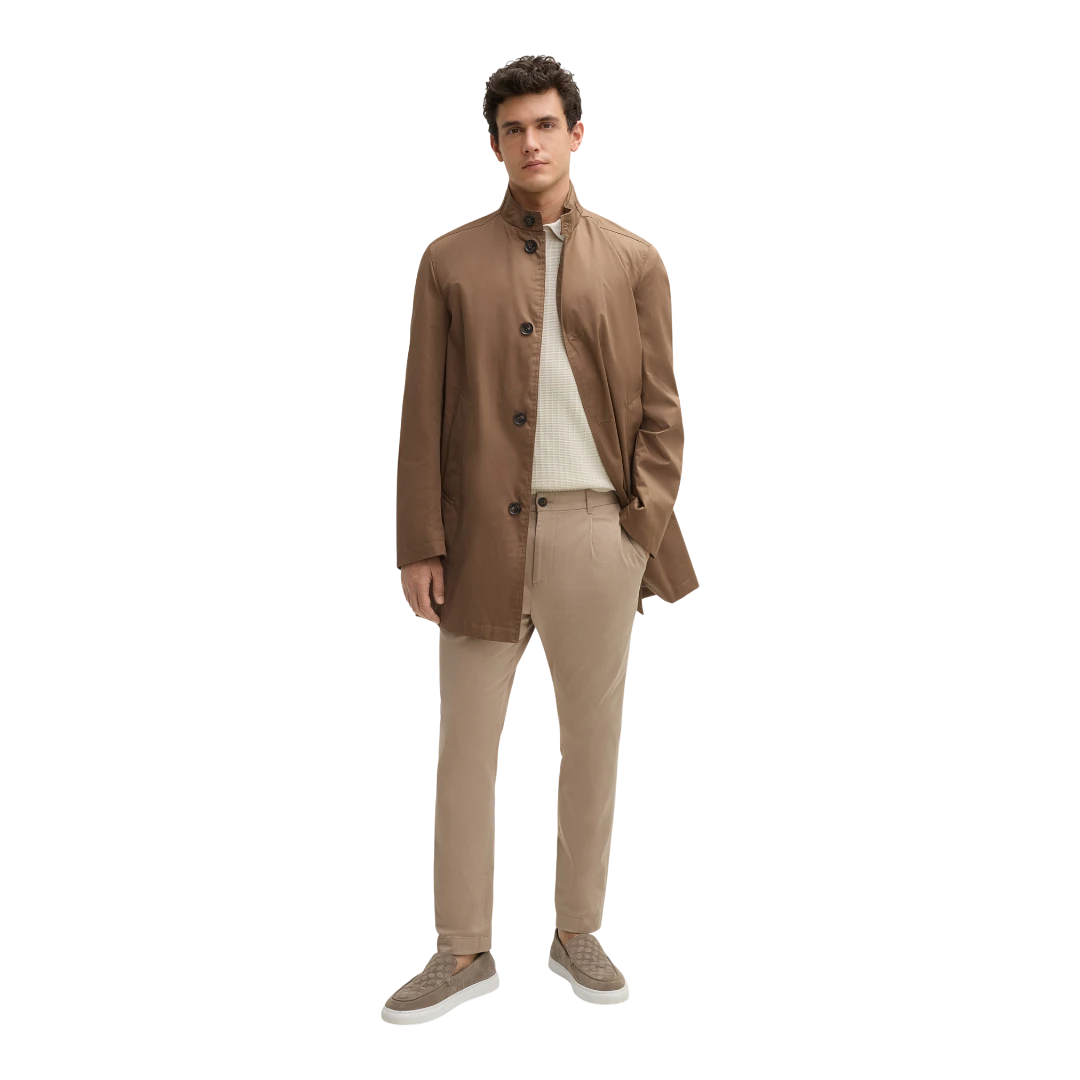 Kaput ima visoku kragnu koja daje moderan karakter i dodatnu praktičnost u hladnijim uslovima. Prednje kopčanje dugmadima diskretno je uklopljeno u dizajn, a bočni džepovi omogućavaju funkcionalnost bez narušavanja čiste linije modela. Neutralna smeđa boja čini ovaj kaput izuzetno svestranim i jednostavnim za kombinovanje sa odelima, sakoom ili ležernijim outfitima.