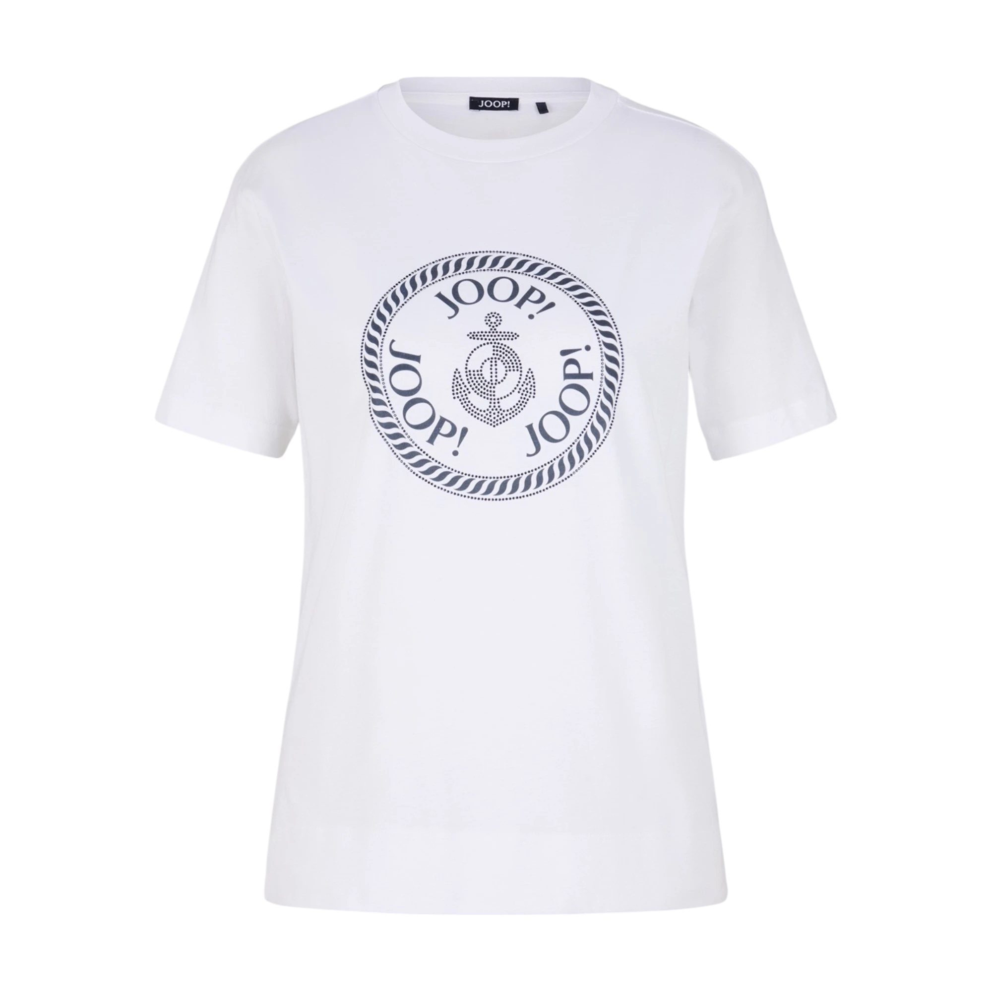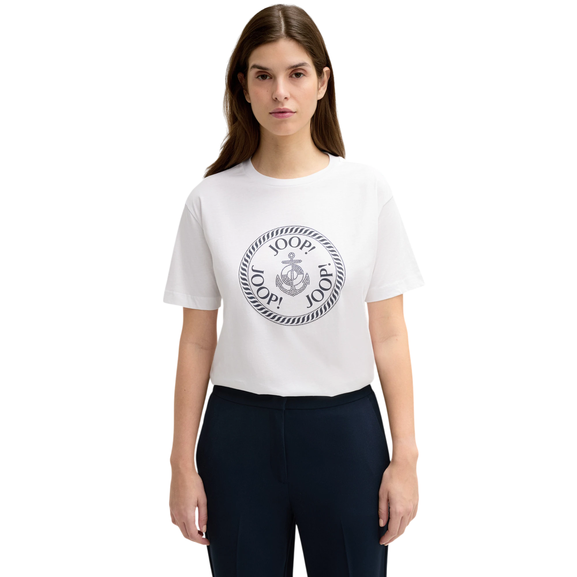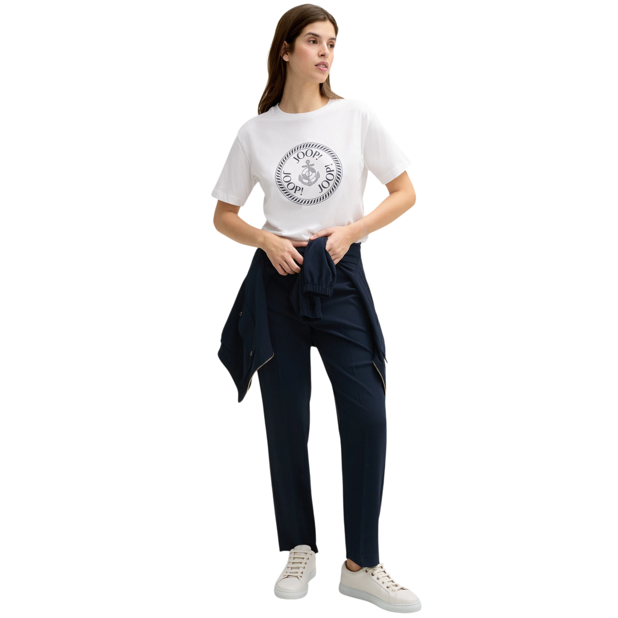 Majica Tonia od čistog pamuka predstavlja neizostavan osnovni komad u garderobi, savršen za kombinovanje s farmerkama ili suknjama. Prepoznatljiva je po logotipu ukrašenom cirkonima na prednjoj strani, koji unosi dašak elegancije u svakodnevni stil. Klasičan rebrasti okrugli izrez, dupli šavovi na rukavima i uredno završeni porub naglašavaju kvalitet izrade, dok diskretna pločica s logotipom na leđima upotpunjuje prepoznatljiv Joop! izgled.