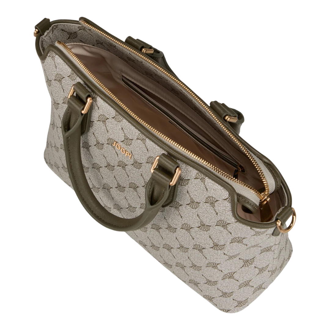 Moderan dodatak u cornflower signé dizajnu: Mazzolino Lauren torba izrađena od veganske kože s elegantnom, zrnastom teksturom. Model se ističe klasičnim ručkama te odvojivim i podesivim remenom za nošenje preko ramena. Zatvaranje na patentni zatvarač osigurava praktičnost i sigurnost.