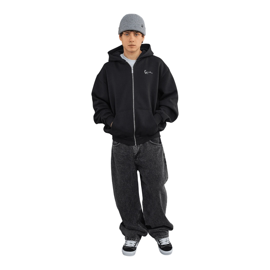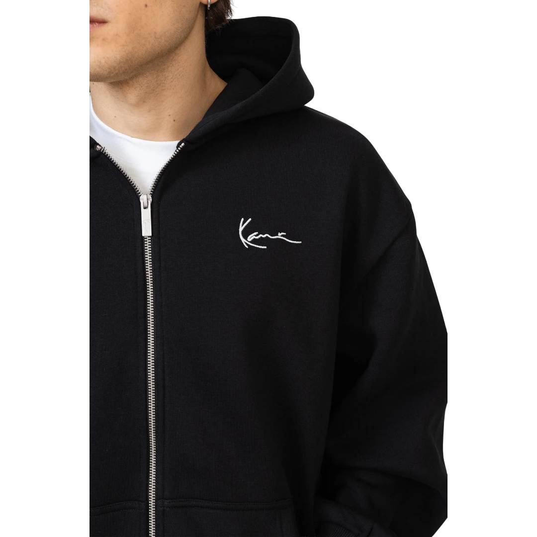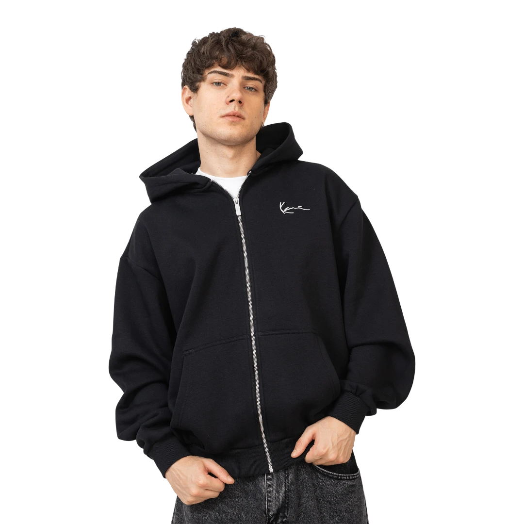 Minimalistički dizajn naglašen je diskretnim Karl Kani potpisom na prednjem dijelu, što dukserici daje prepoznatljiv identitet bez pretjeranog vizuelnog opterećenja. Zatvaranje na rajsferšlus omogućava praktičnost i prilagodljivost, dok kapuljača pruža dodatnu zaštitu i komfor.