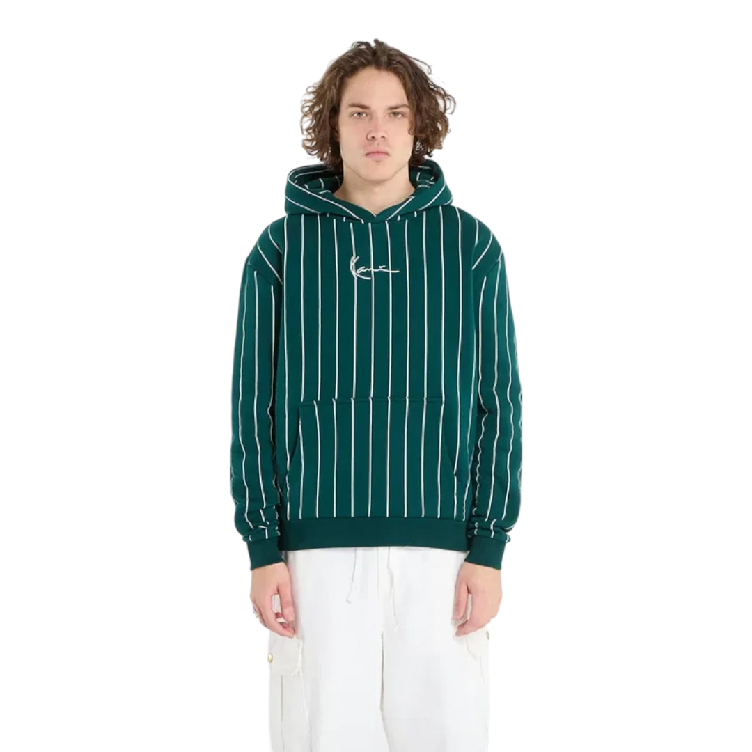 Vertikalne pruge vizuelno naglašavaju siluetu, dok diskretni Karl Kani potpis na prednjem dijelu daje suptilan, ali autentičan brendirani akcenat. Kapuljača dodatno doprinosi funkcionalnosti i urbanom karakteru, a kengur džep pruža praktičnost i komfor. Elastične ranfle na rukavima i donjem dijelu osiguravaju dobar fit i zadržavanje forme.