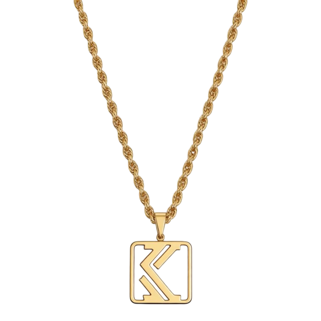 Moderna ogrlica sa dekorativnim priveskom u obliku slova K savršen je izbor za lični detalj ili poklon sa značenjem. Privesak je smešten u minimalistički kvadratni okvir, dok upleteni lančić daje dodatnu dozu sofisticiranosti i vizuelne dinamike.