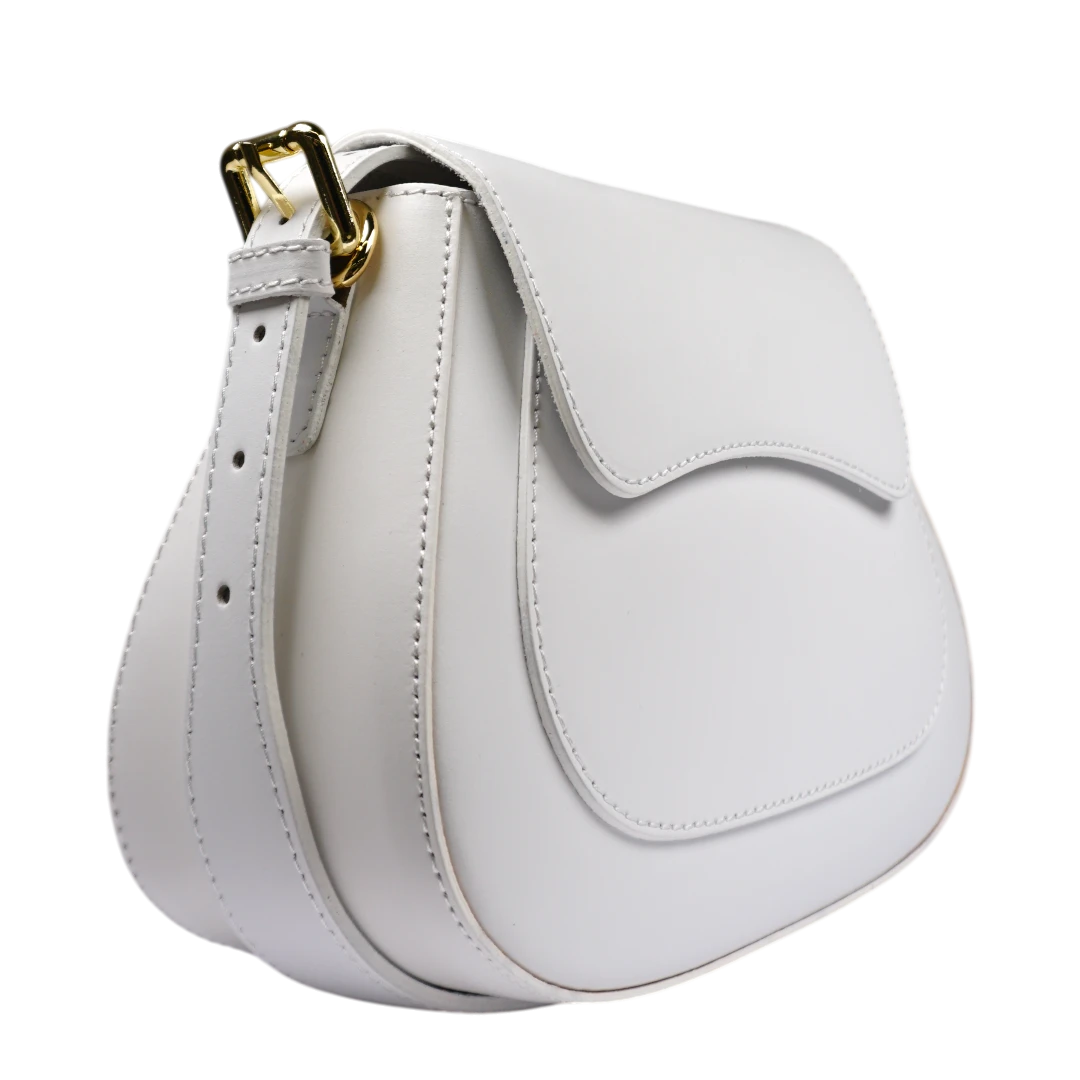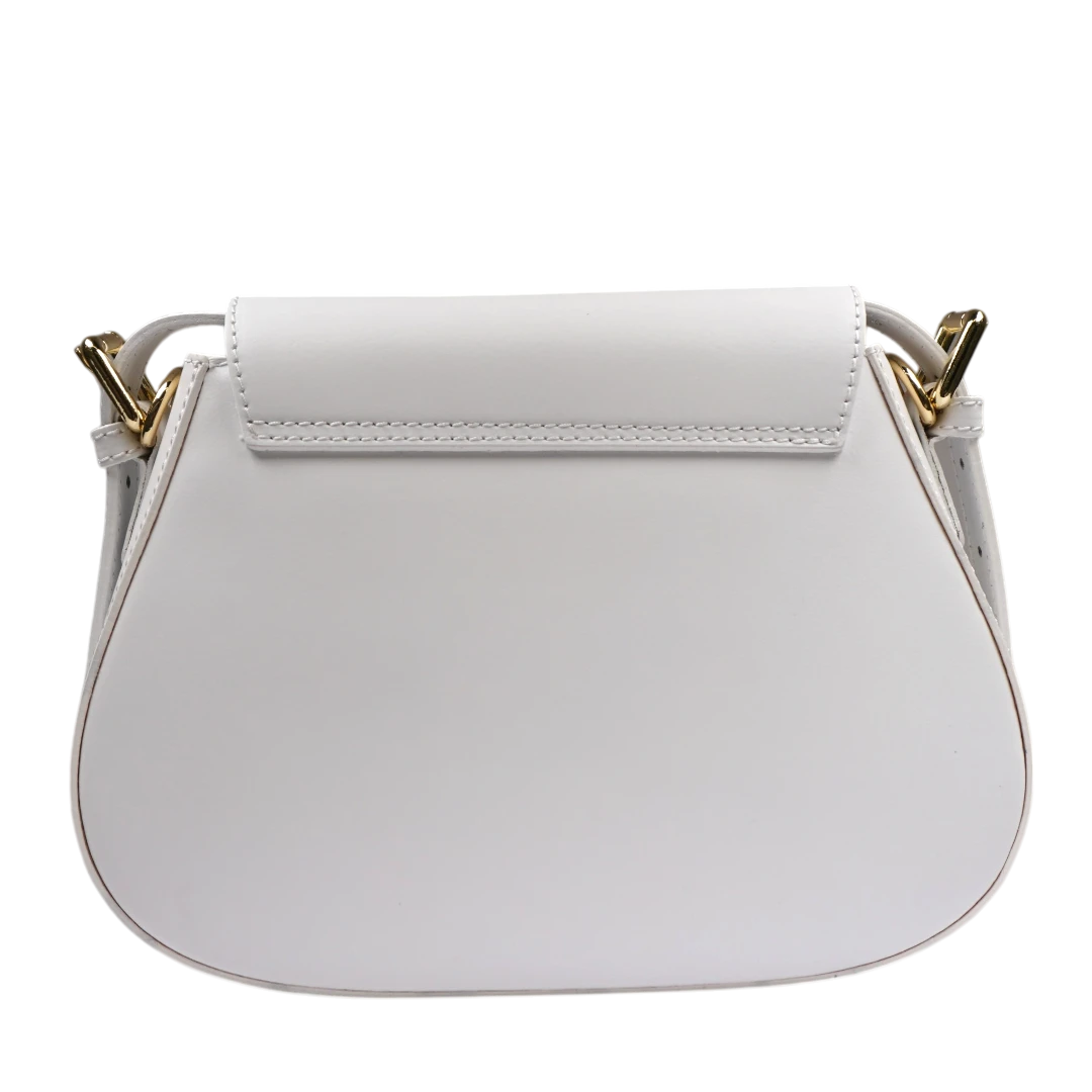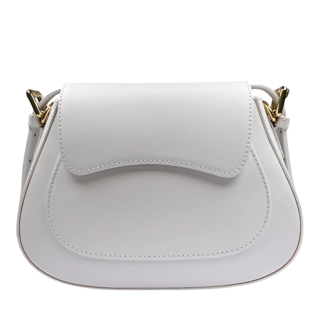 Elegantna i profinjena, ova bijela torba odiše minimalističkim šarmom i savršenim linijama. Izrađena od prirodne kože kože, njen zaobljeni dizajn s poklopcem daje dozu sofisticiranosti, dok zlatni metalni detalji na ručkama dodaju luksuzan završni pečat. Praktična i moderna, idealna je za dnevne kombinacije, ali i večernje izlaske gdje želite ostaviti utisak suptilne elegancije. Bezvremenska klasika za svaku sezonu.