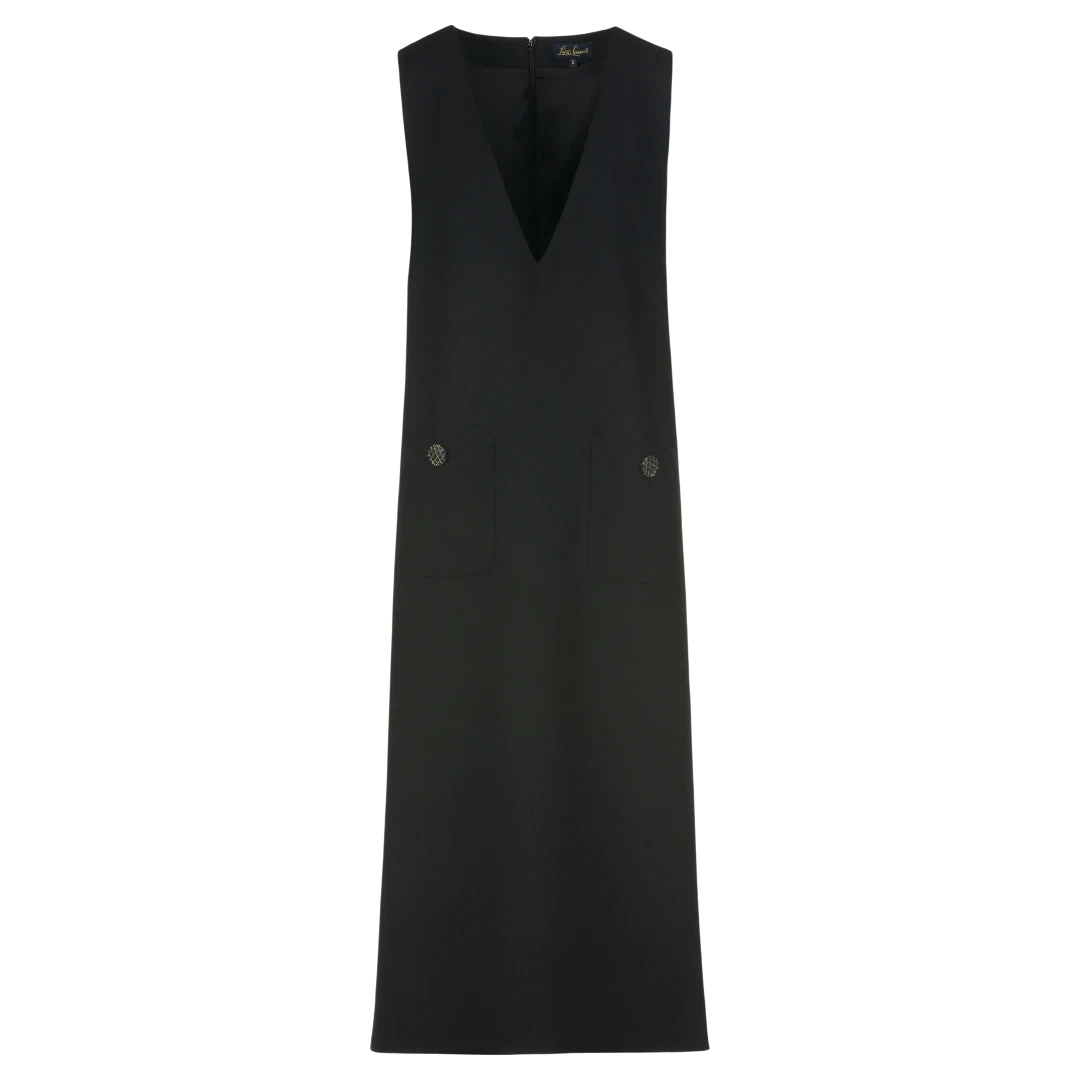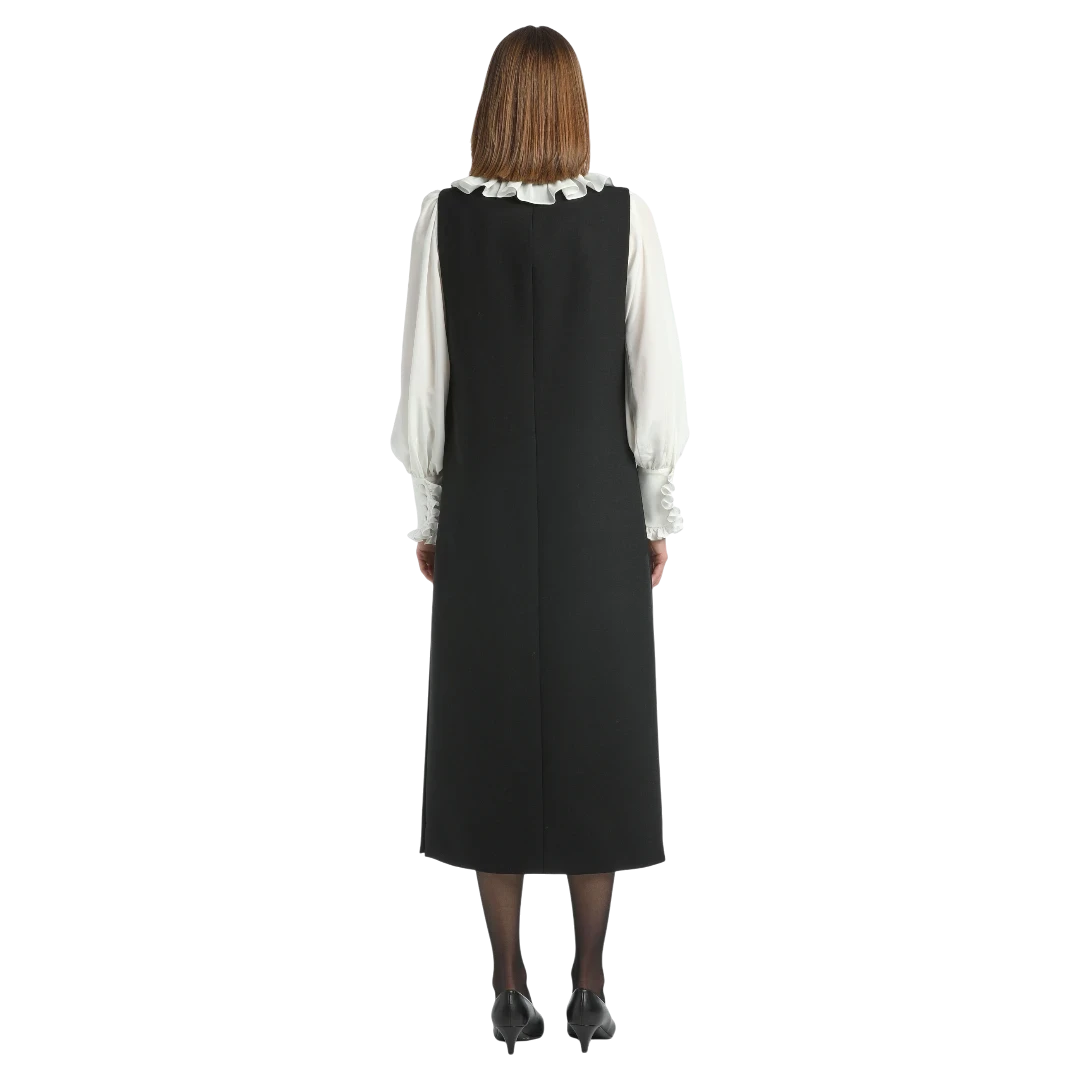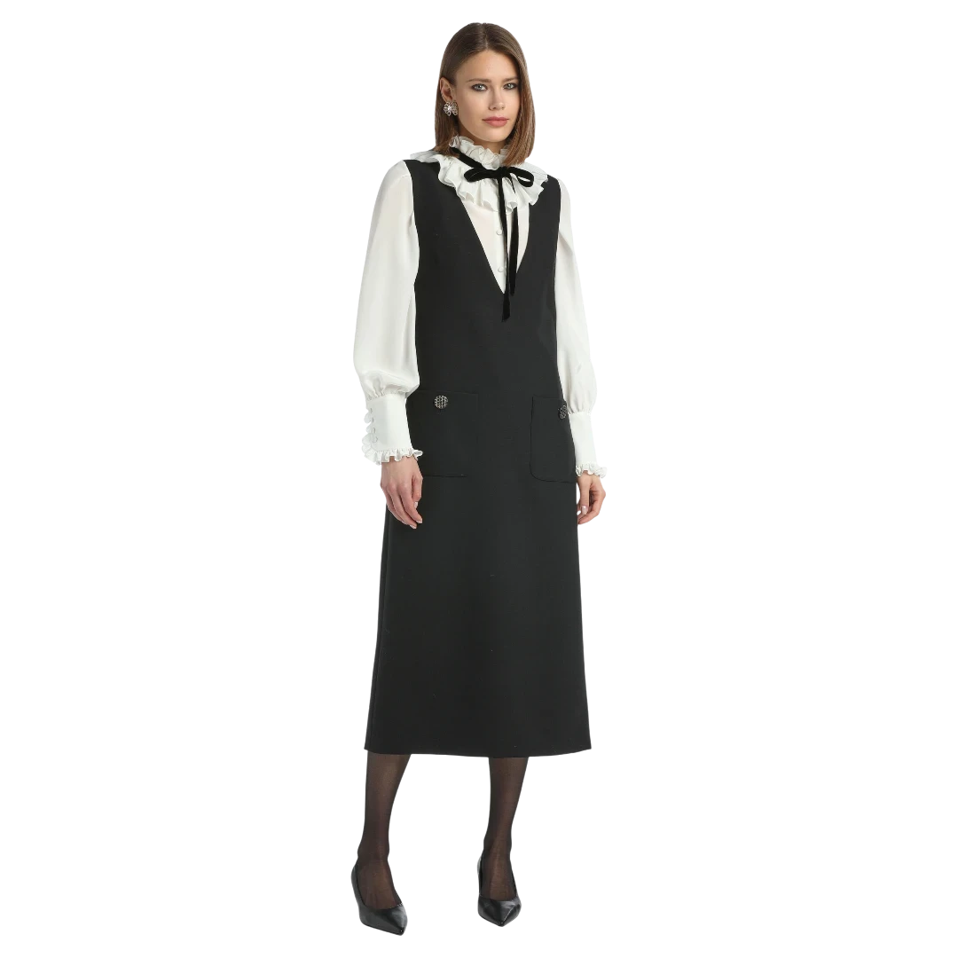 Minimalistička, ali izuzetno sofisticirana, ova Luisa Spagnoli haljina izrađena je u ravnom kroju koji pruža čistu i elegantnu siluetu. Bez rukava i s dubokim V-izrezom, odiše modernom jednostavnošću, dok džepovi sprijeda, ukrašeni dekorativnim dugmadima, dodaju suptilan luksuzni detalj. Idealna je za poslovne kombinacije, večernje izlaske ili slojevito stiliziranje uz košulje i rolke.