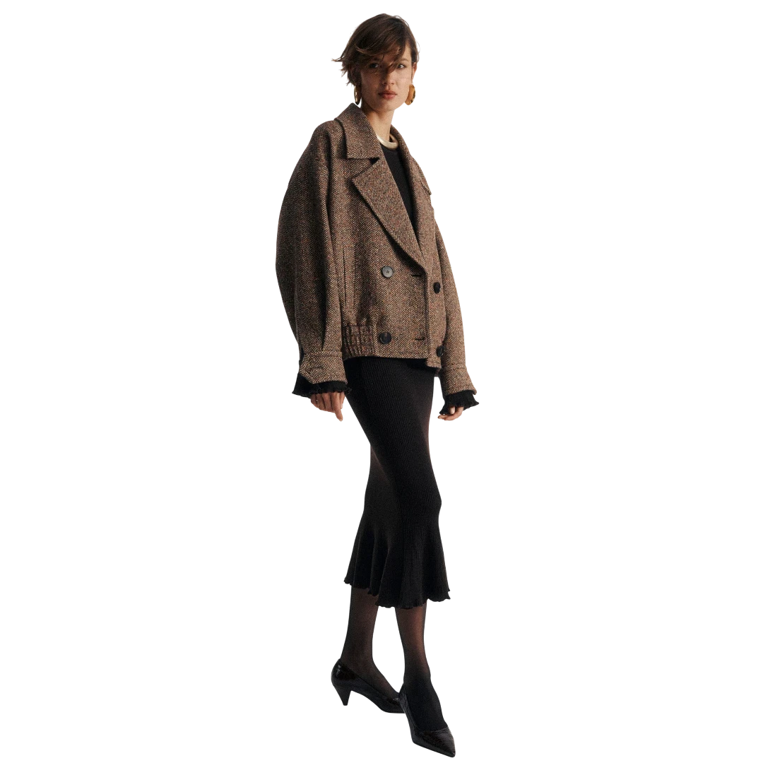 SKU: 44518Luisa Spagnoli kratki kaput u tvid uzorku donosi bezvremensku eleganciju sa modernim prizvukom. Izrađen od kvalitetne vune, ističe se klasičnim dvorednim kopčanjem i velikim reverima, dok elastični detalj u struku daje suptilan oblik i dodatnu udobnost. Topao i sofisticiran, ovaj model savršeno se uklapa u urbane jesensko-zimske kombinacije, bilo da se nosi uz elegantne pantalone ili ležerne farmerke.