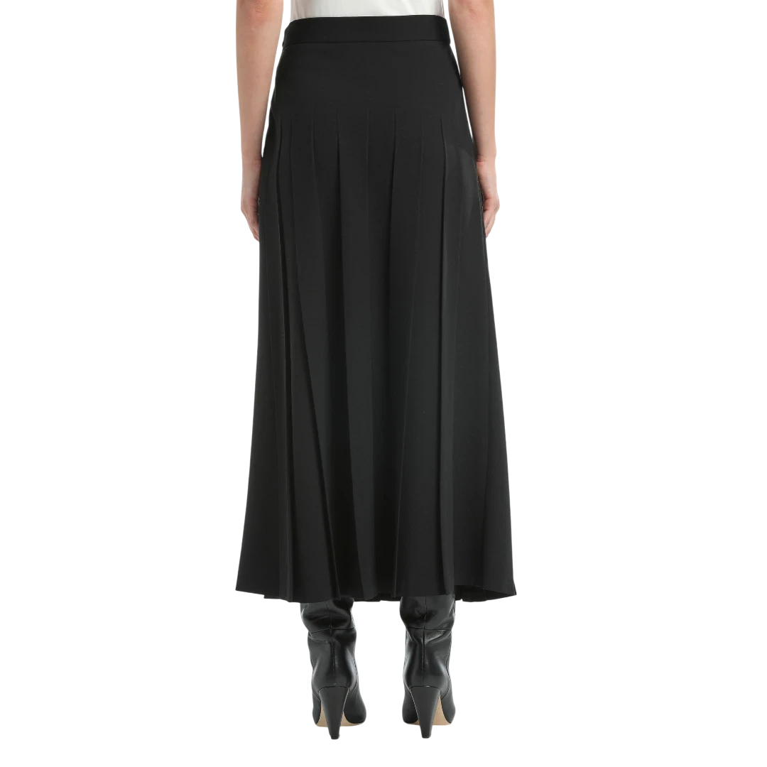 Ova Luisa Spagnoli plisirana suknja u crnoj boji donosi klasičnu profinjenost i lakoću pokreta. Zahvaljujući laganom materijalu i ženstvenom kroju koji prati siluetu, savršeno se uklapa u sofisticirane dnevne i večernje kombinacije. Plisirani detalji naglašavaju fluidnost i daju suptilan, romantičan efekt. Može se nositi uz bluze i sakoe za poslovne prilike, ili uz pletene džempere i cipele s potpeticom za elegantne i chic outfite. Bezvremenski komad koji odiše luksuzom i svestranošću.