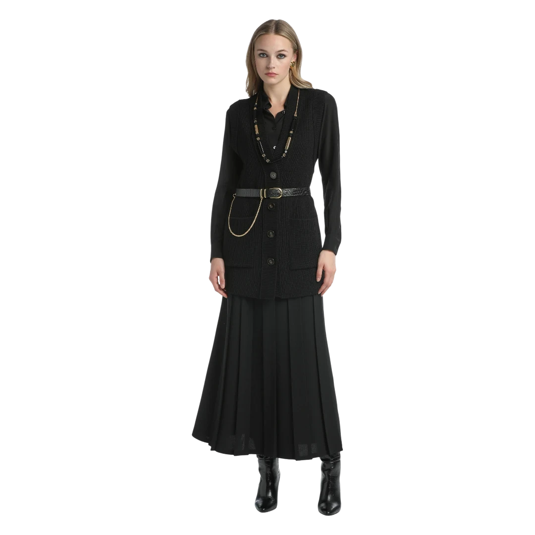 SKU: 44527Ova Luisa Spagnoli plisirana suknja u crnoj boji donosi klasičnu profinjenost i lakoću pokreta. Zahvaljujući laganom materijalu i ženstvenom kroju koji prati siluetu, savršeno se uklapa u sofisticirane dnevne i večernje kombinacije. Plisirani detalji naglašavaju fluidnost i daju suptilan, romantičan efekt. Može se nositi uz bluze i sakoe za poslovne prilike, ili uz pletene džempere i cipele s potpeticom za elegantne i chic outfite. Bezvremenski komad koji odiše luksuzom i svestranošću.