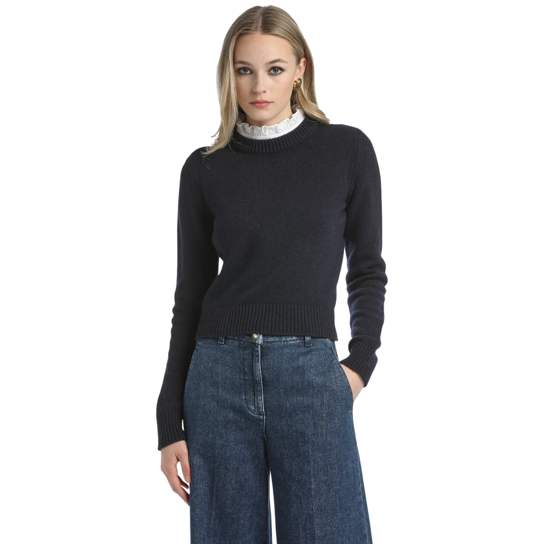 Ovaj Luisa Spagnoli džemper u tamnoplavoj boji donosi spoj klasične elegancije i romantičnih detalja. Ravan kroj sa finim rebrastim porubima na rukavima i dnu upotpunjen je bijelom volan kragnom koja dodaje ženstven i sofisticiran kontrast. Savršen je za kombinovanje uz poslovne pantalone ili suknju, ali i za casual chic stil sa farmericama. Bezvremenski komad koji ističe prefinjen ukus i pruža udobnost kroz svaki dan.