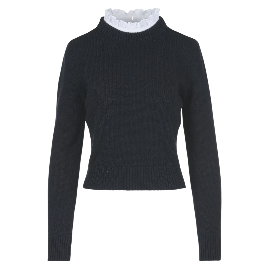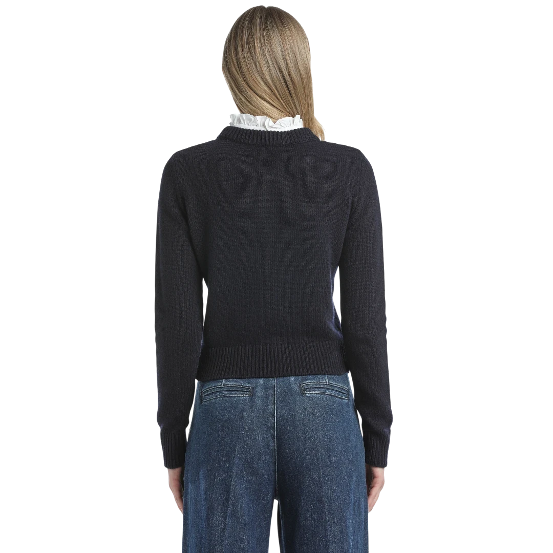 SKU: 44493Ovaj Luisa Spagnoli džemper u tamnoplavoj boji donosi spoj klasične elegancije i romantičnih detalja. Ravan kroj sa finim rebrastim porubima na rukavima i dnu upotpunjen je bijelom volan kragnom koja dodaje ženstven i sofisticiran kontrast. Savršen je za kombinovanje uz poslovne pantalone ili suknju, ali i za casual chic stil sa farmericama. Bezvremenski komad koji ističe prefinjen ukus i pruža udobnost kroz svaki dan.