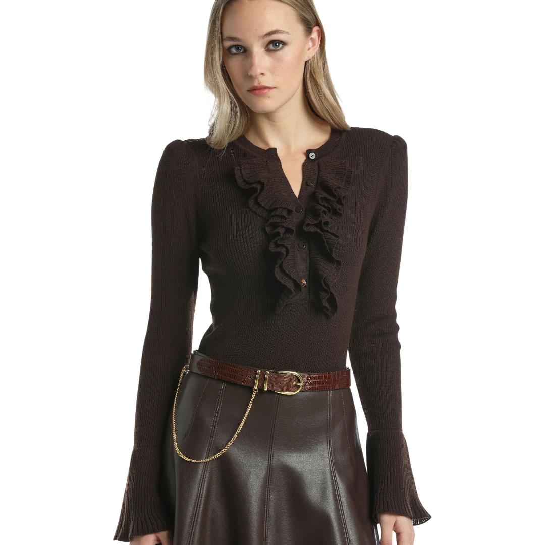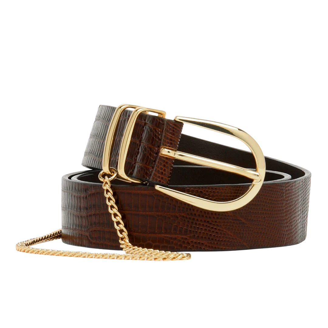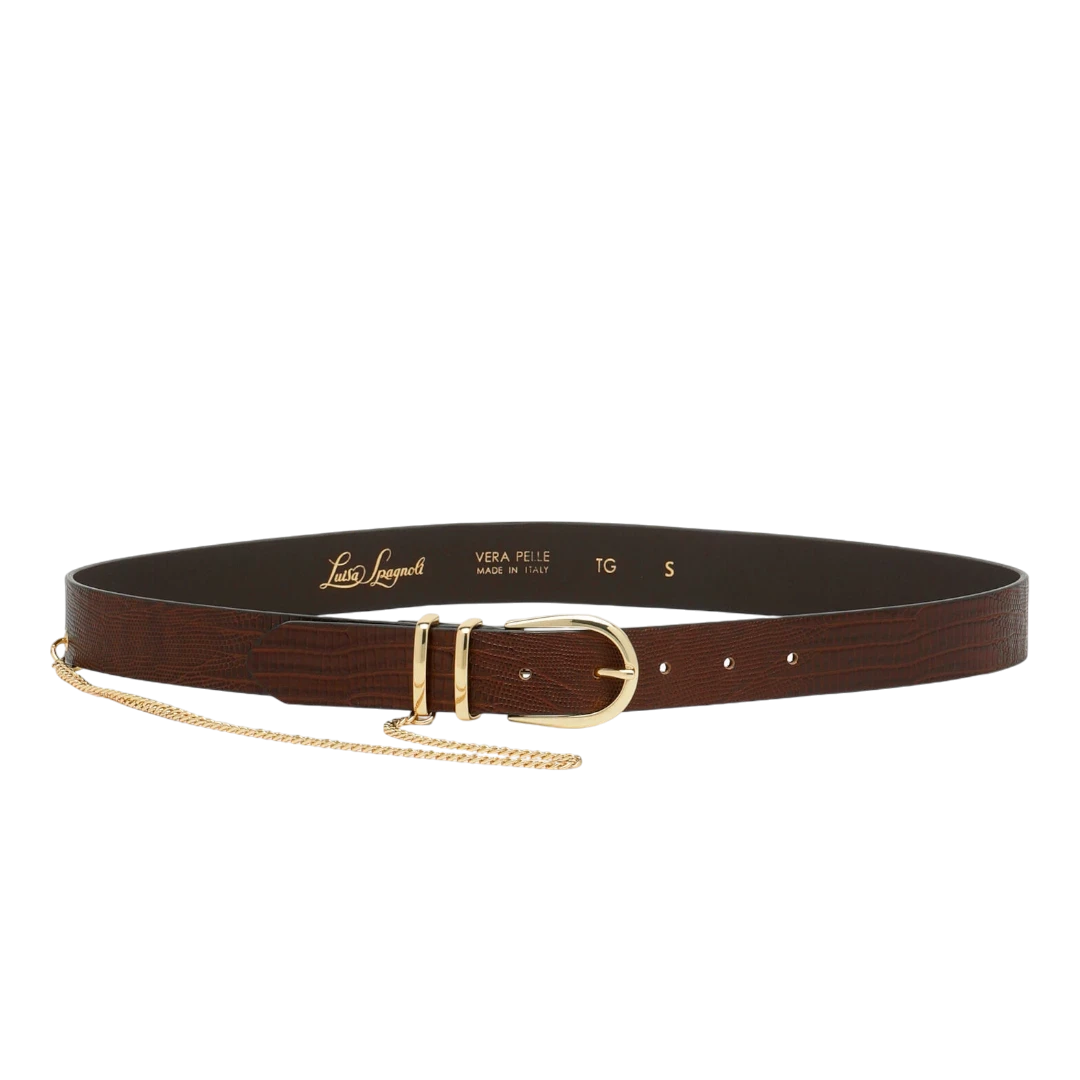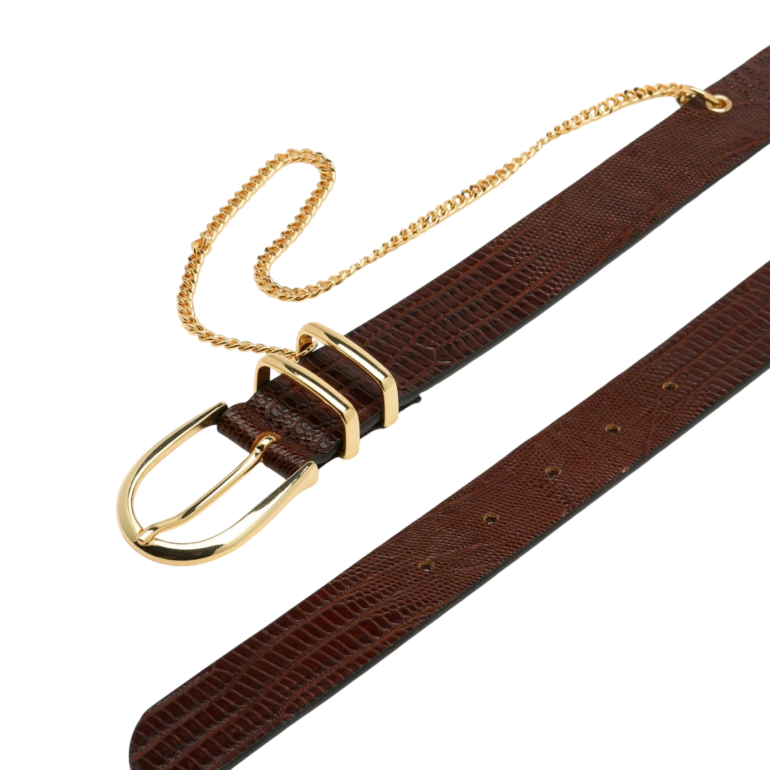 Ovaj Luisa Spagnoli kožni kaiš izrađen je od fine smeđe kože s decentnim uzorkom, naglašen luksuznom zlatnom kopčom i tankim dekorativnim lancem koji mu daje sofisticiran i moderan pečat. Tanak i elegantan, savršen je za stilizovanje suknji, hlača ili haljina, dodajući profinjeni akcenat svakoj kombinaciji. Bezvremenski dodatak garderobi, idealan za žene koje cijene klasiku s dozom luksuza i prefinjenosti.