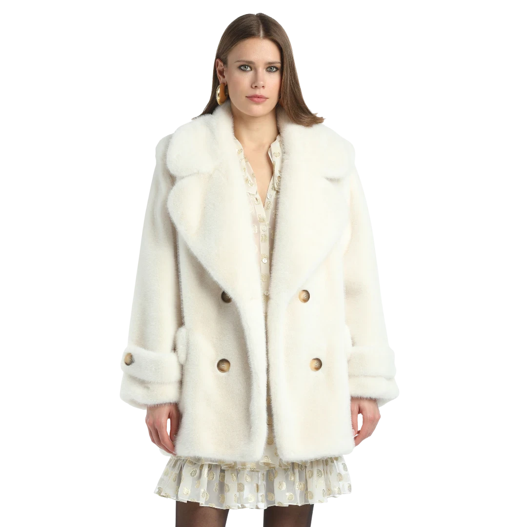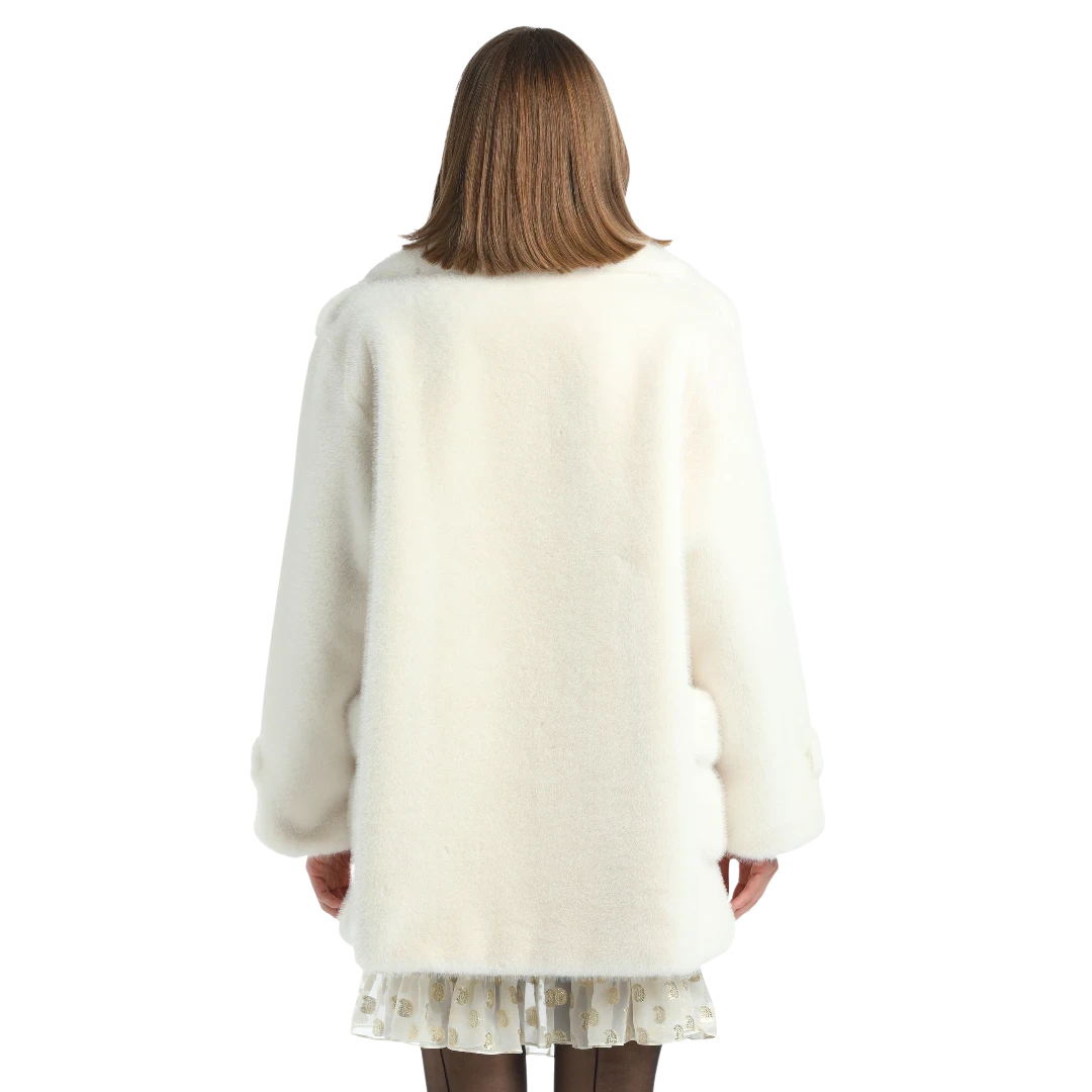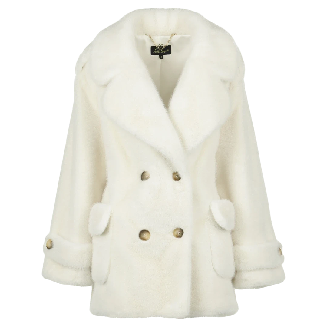 Luisa Spagnoli kratki kaput od umjetnog krzna u bijeloj boji donosi savršen spoj luksuza i udobnosti. Dvoredno kopčanje i široki reveri naglašavaju klasičnu eleganciju, dok voluminozan kroj i mekana tekstura pružaju osjećaj raskoši i topline. Džepovi s preklopom i detalji na rukavima dodatno obogaćuju sofisticirani dizajn. Ovaj kaput idealan je izbor za hladne dane kada želite izgledati glamurozno i profinjeno.