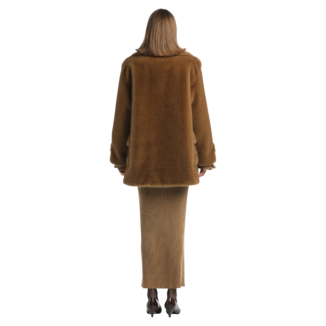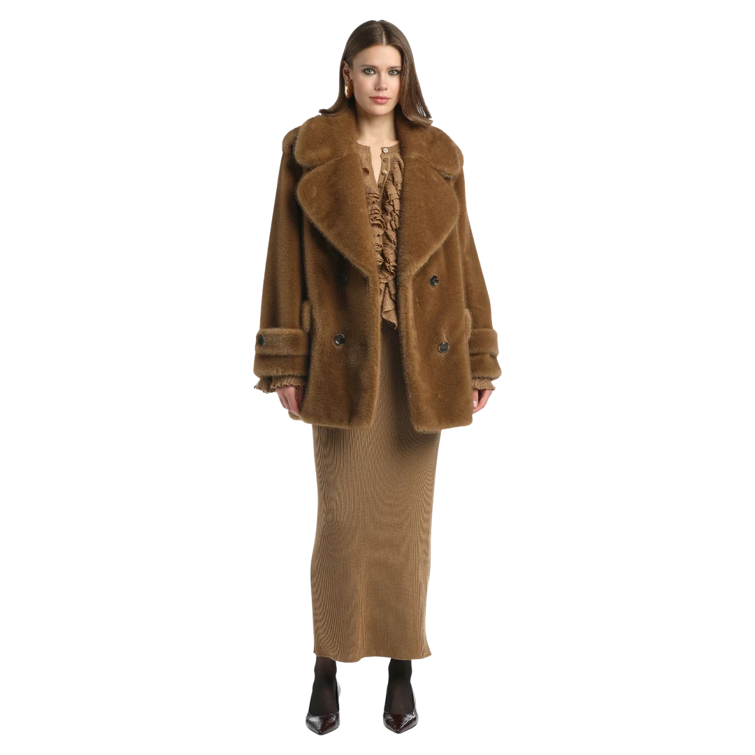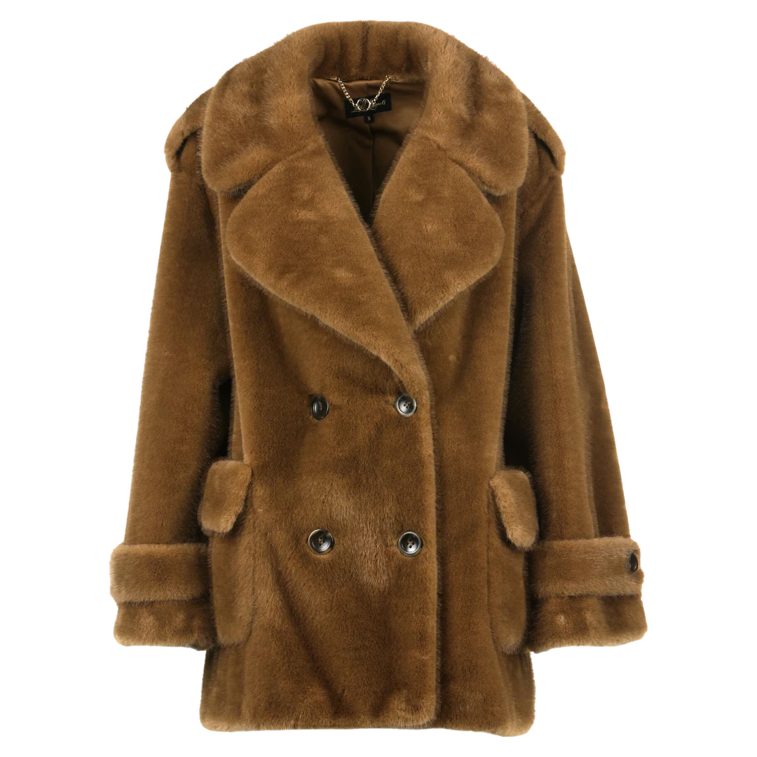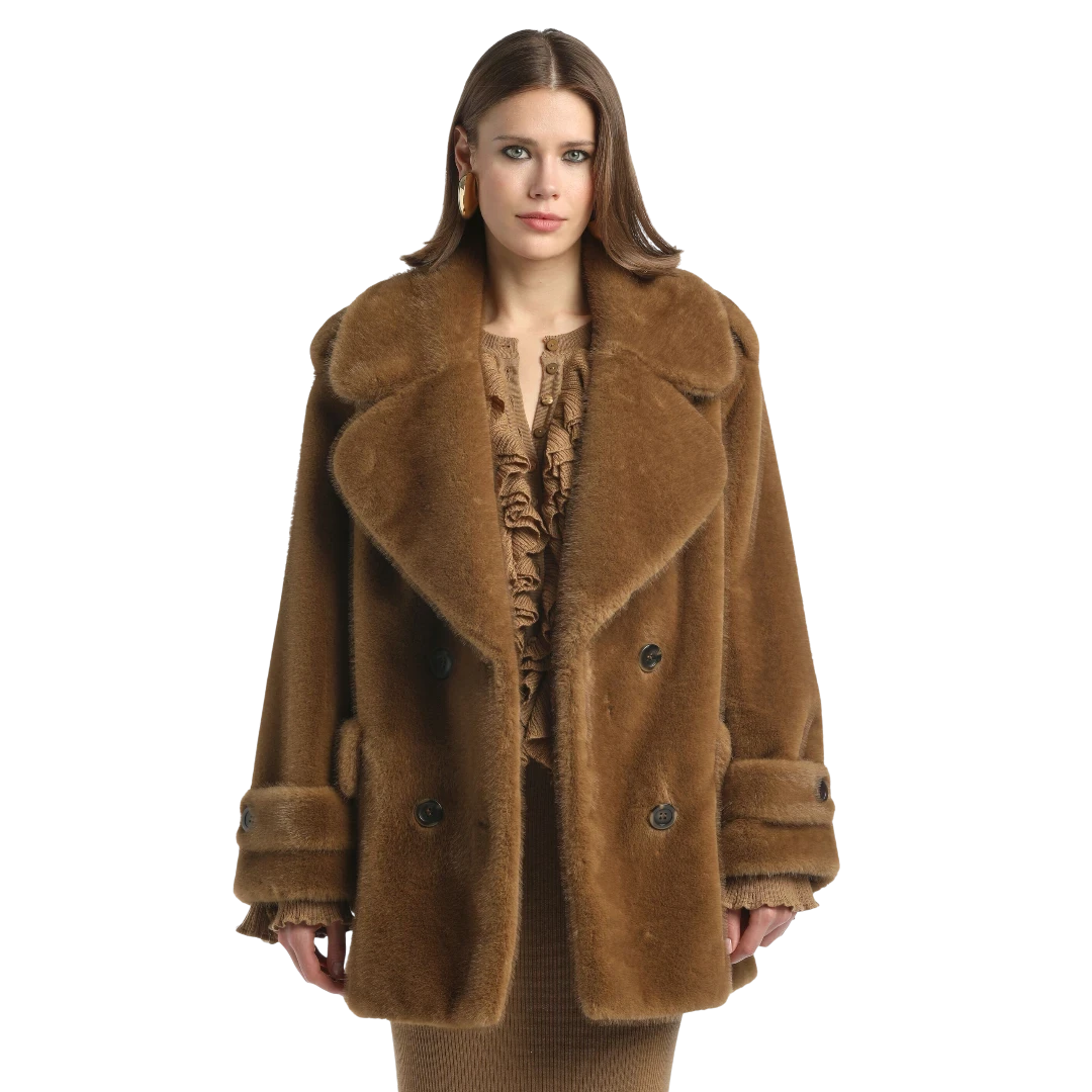 Luisa Spagnoli kratki kaput od umjetnog krzna u toploj nijansi karamele donosi savršen spoj luksuza i udobnosti. Dvoredno kopčanje i široki reveri naglašavaju klasičnu eleganciju, dok voluminozan kroj i mekana tekstura pružaju osjećaj raskoši i topline. Džepovi s preklopom i detalji na rukavima dodatno obogaćuju sofisticirani dizajn. Ovaj kaput idealan je izbor za hladne dane kada želite izgledati glamurozno i profinjeno.