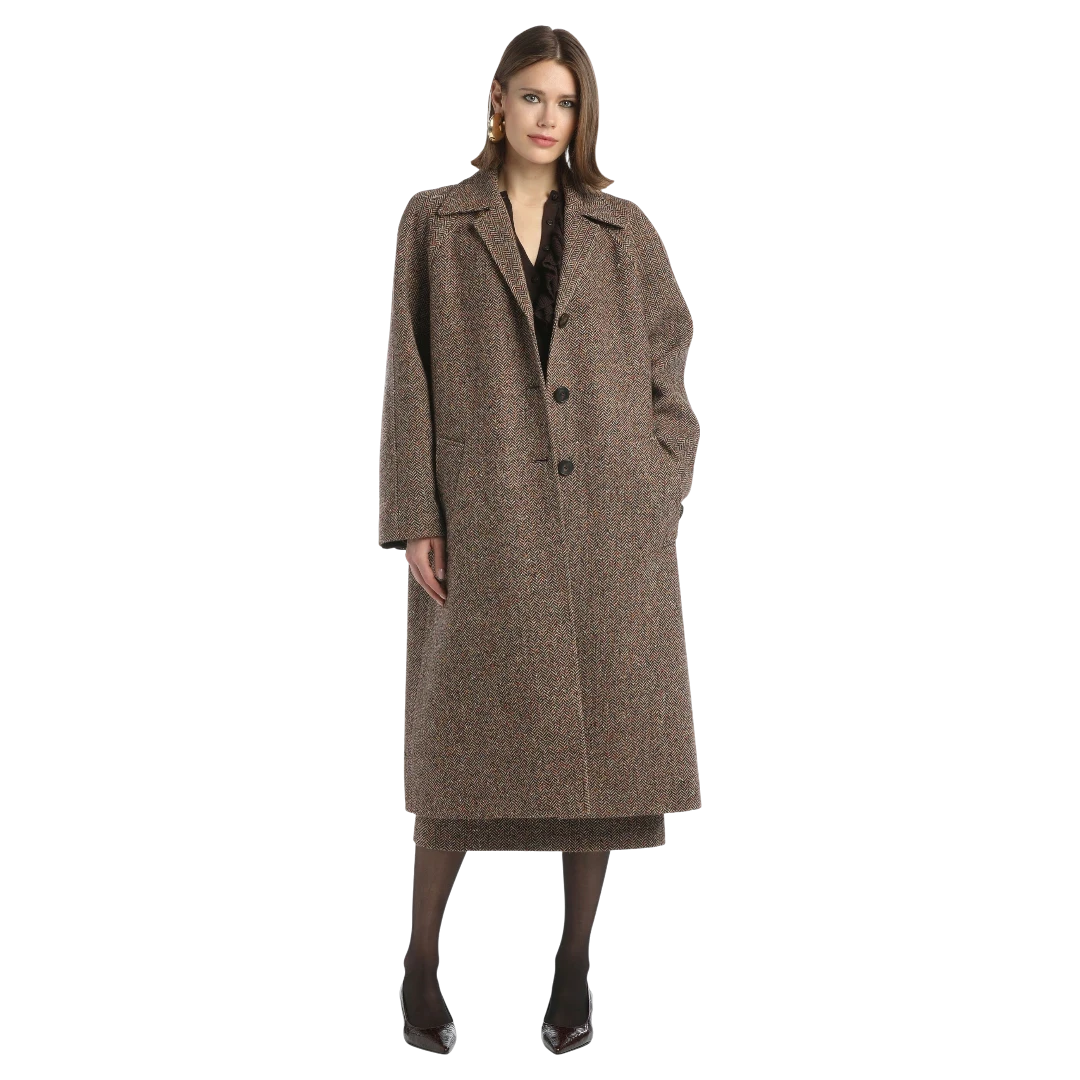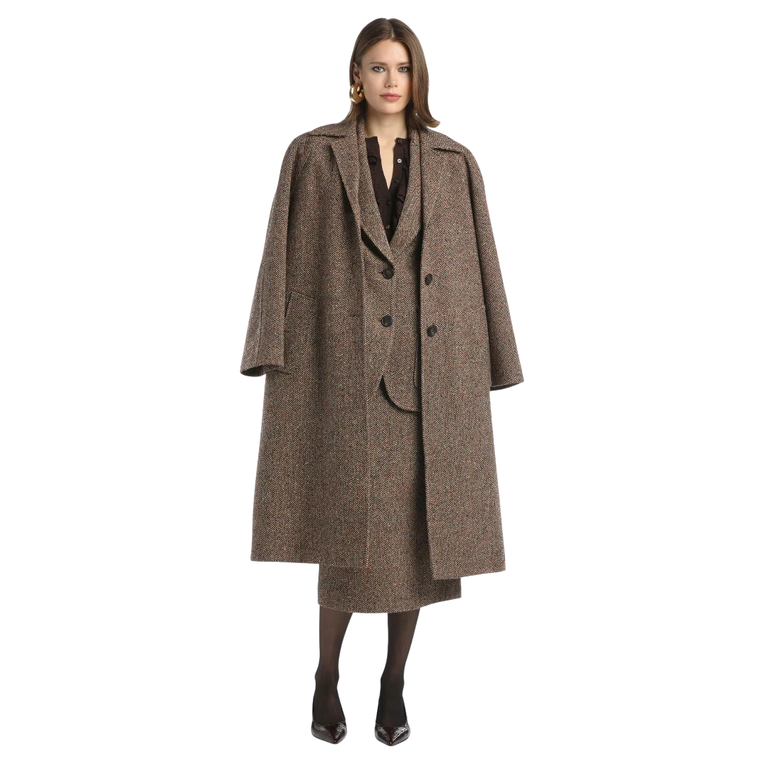 Ovaj kaput iz kolekcije Luisa Spagnoli donosi bezvremensku eleganciju i toplinu za hladne dane. Izrađen od kvalitetne vune u klasičnom „riblja kost“ uzorku, pruža sofisticiran izgled uz maksimalnu udobnost. Ravnog kroja sa dugim rukavima i klasičnim reverom, zakopčava se sa tri dugmeta, dok diskretni džepovi dodaju funkcionalnost. Savršen izbor za poslovne kombinacije, ali i za svakodnevno nošenje uz dozu luksuza.