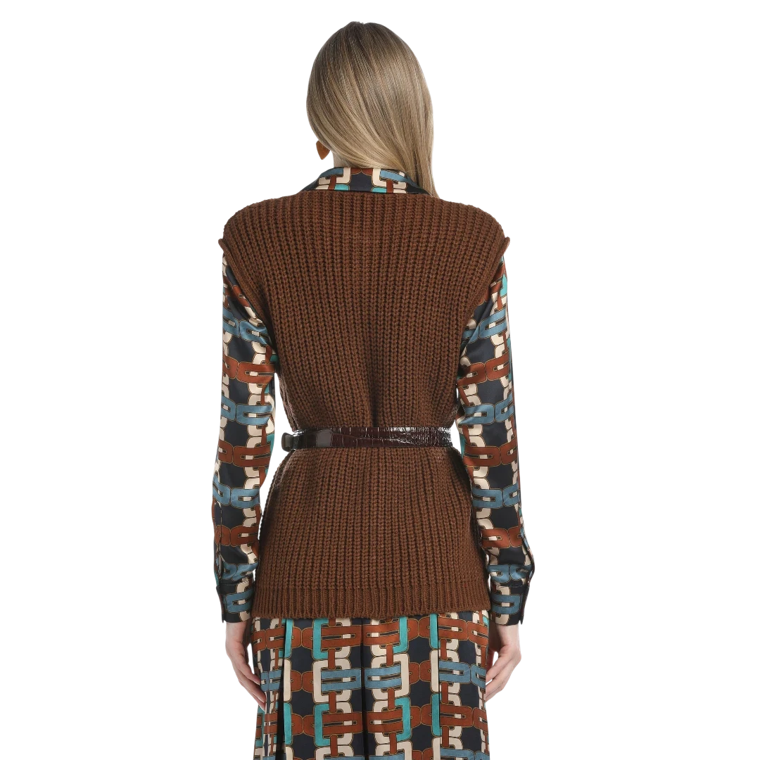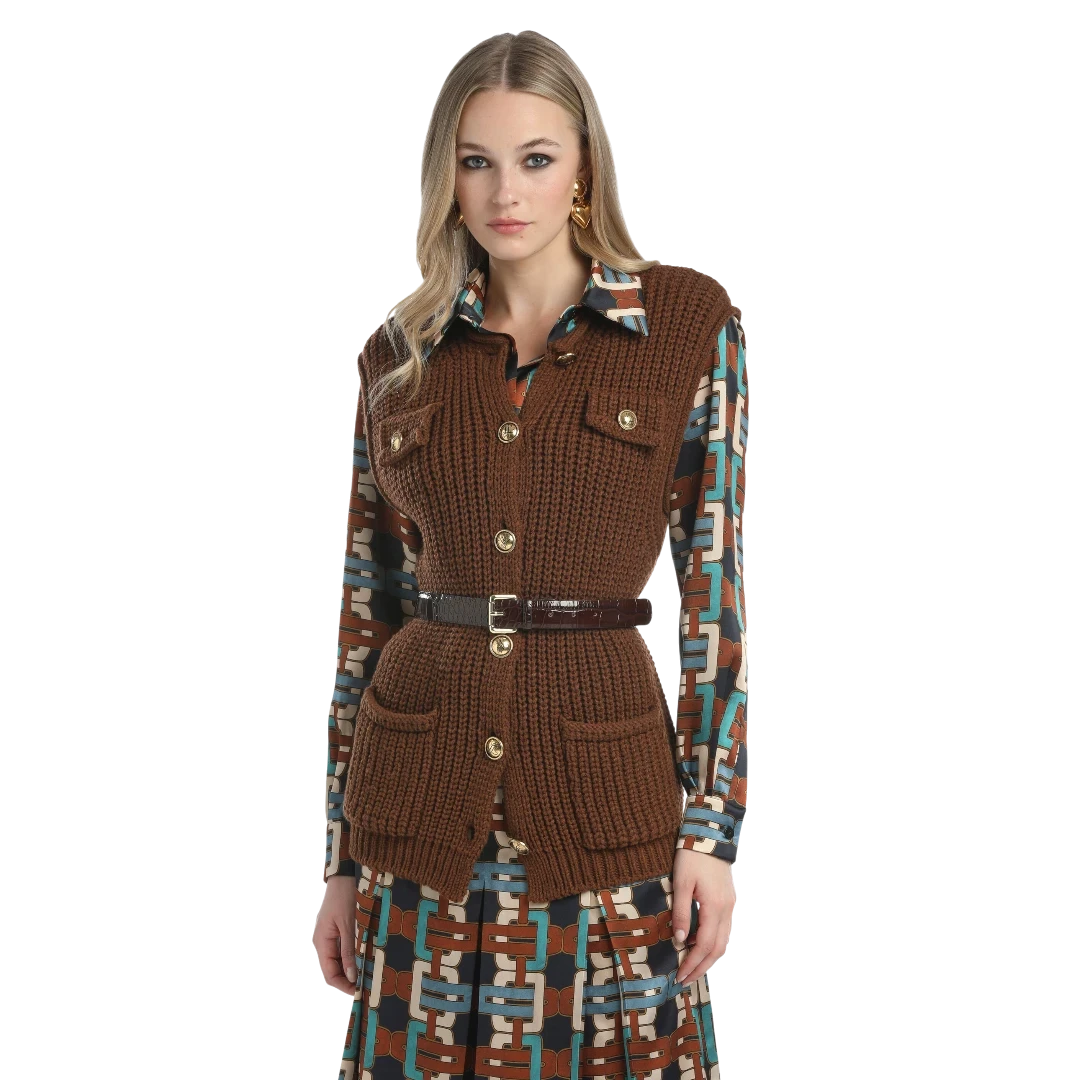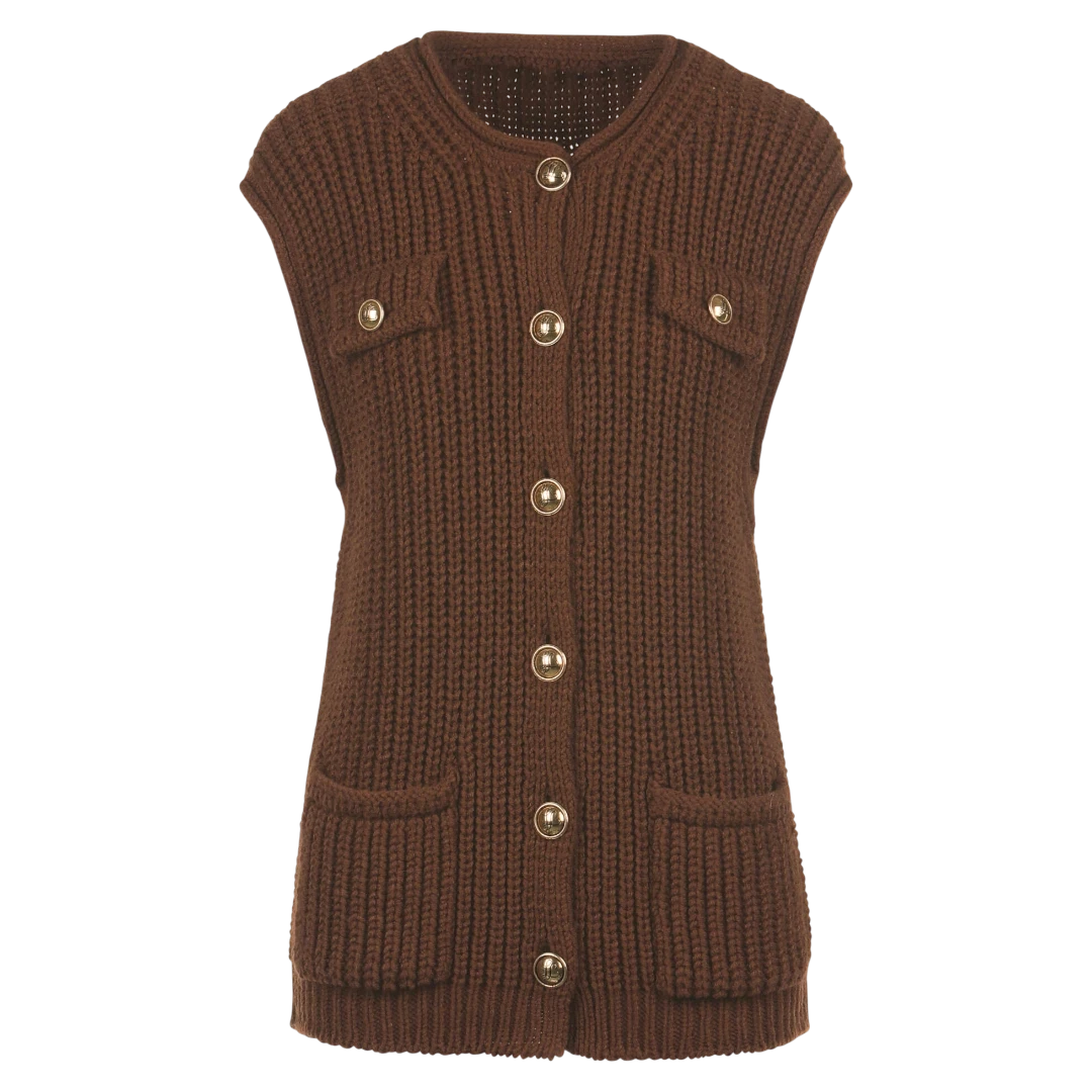 Ovaj Luisa Spagnoli pleteni prsluk u toploj smeđoj nijansi spaja udobnost i eleganciju. Sa širokim rebrastim pletivom i klasičnim krojem bez rukava, ističe se dekorativnim džepovima i zlatnim dugmadima koji mu daju luksuzan završni detalj. Savršen je za slojevite kombinacije – nosite ga preko košulje ili tanke dolčevite za chic dnevni look, ili ga uparite s elegantnim hlačama i suknjom za sofisticiran stajling u hladnijim danima.