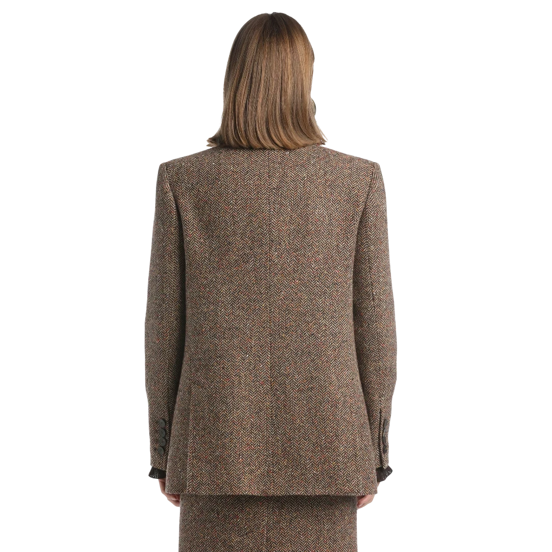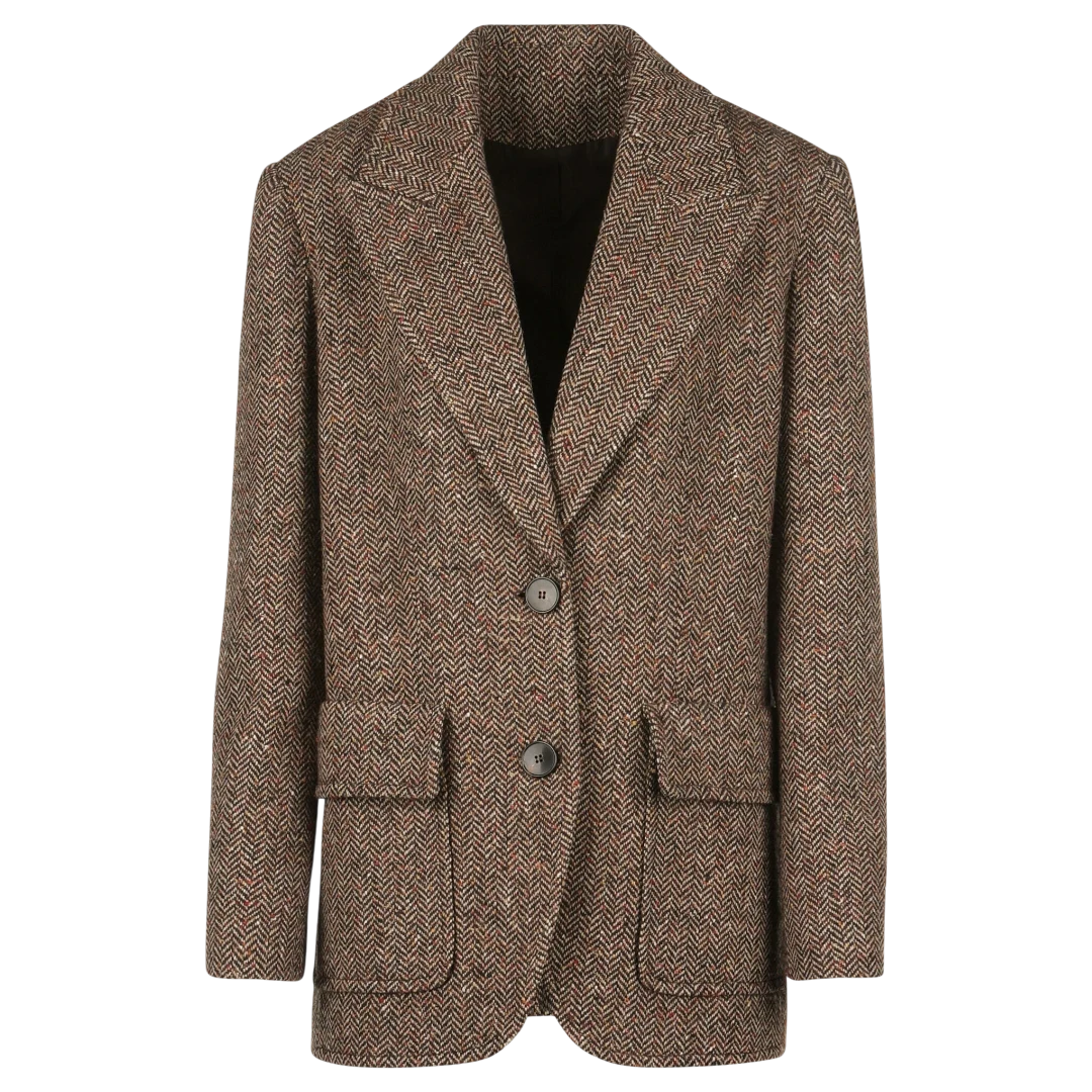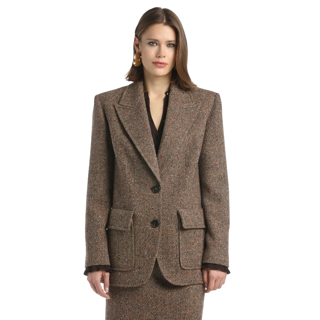 Luisa Spagnoli sako u klasičnom tvid uzorku odiše bezvremenskom elegancijom i profinjenim stilom. Izrađen od kvalitetne vunene tkanine u kombinaciji toplih tonova, ističe se strukturiranim krojem, širokim reverima i dvodijelnim kopčanjem. Veliki prednji džepovi s preklopom dodaju praktičnost i klasični šarm. Ovaj sako je savršen izbor za poslovne kombinacije, ali i za sofisticirane casual outfite, donoseći dašak autentičnog italijanskog šika.