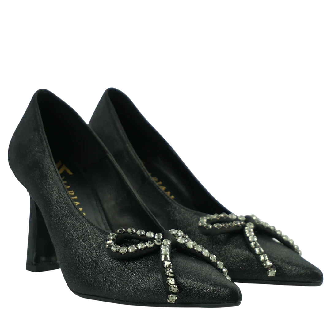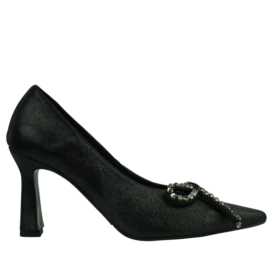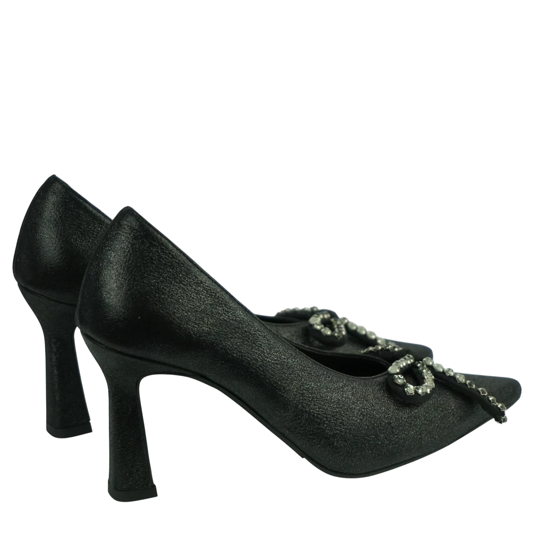 Ove elegantne crne salonke odišu sofisticiranošću zahvaljujući sjajnoj teksturi materijala i prepoznatljivom ukrasu od kristala na prednjem dijelu. Klasična silueta s visokom potpeticom produžuje figuru i donosi profinjen izgled, dok ukrasni detalj unosi luksuzni sjaj idealan za večernje prilike i posebne događaje. Savršene su za dame koje žele spoj elegancije i glamura u jednom paru cipela.