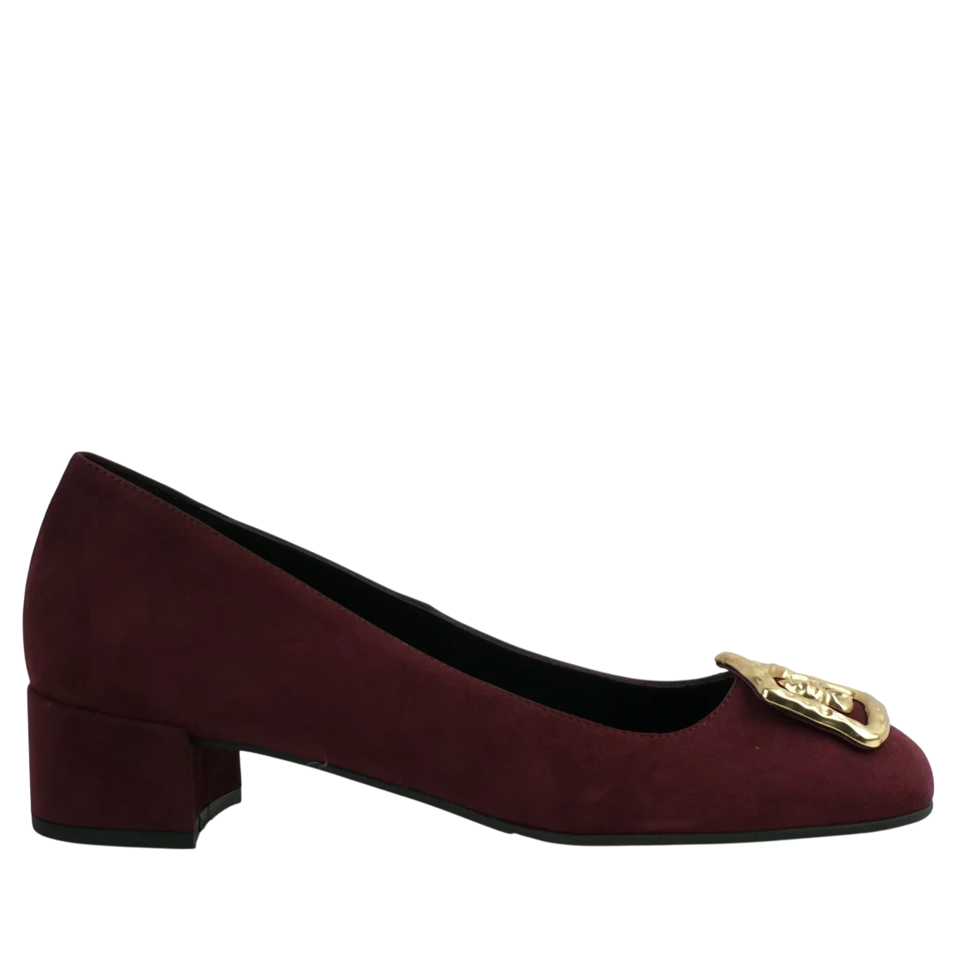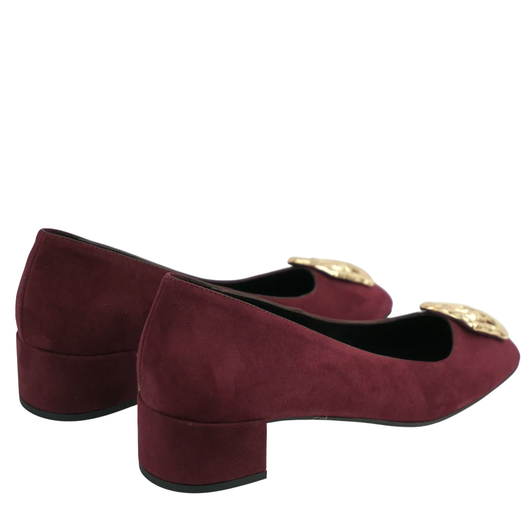 Ove elegantne salonke u bordo nijansi izrađene su od fine brušene kože i krasi ih upečatljiva zlatna ukrasna kopča na prednjem dijelu. Niski, stabilni blok potpetica pruža udobnost i lakoću nošenja, dok sofisticiran dizajn unosi luksuz u svaku kombinaciju. Savršene su za poslovne prilike, večernje izlaske ili posebne događaje gdje želite da izgledate profinjeno, a da se pritom osjećate udobno.