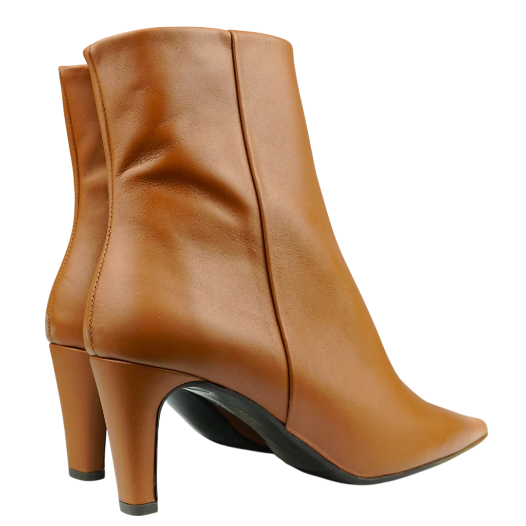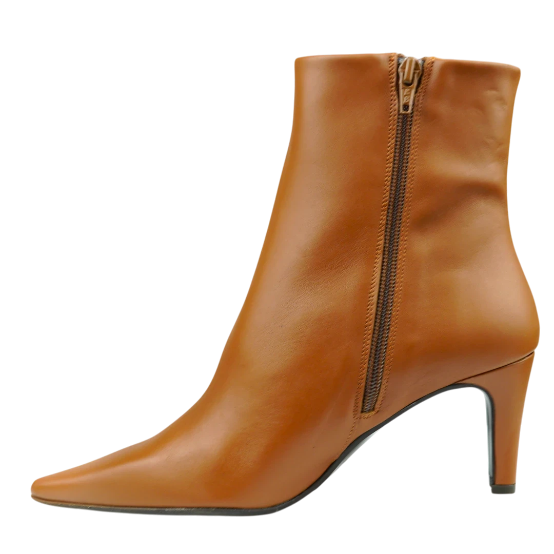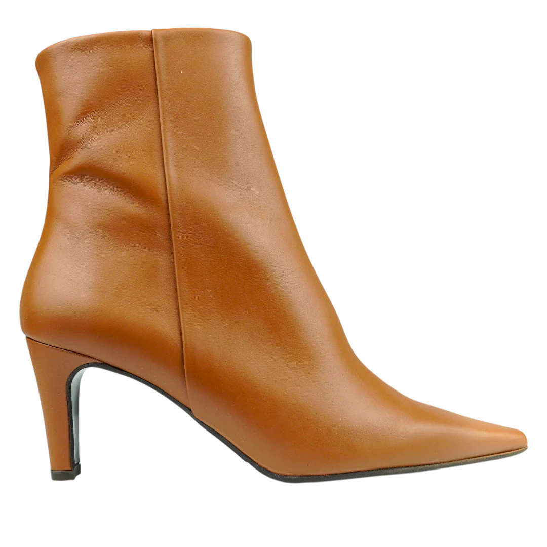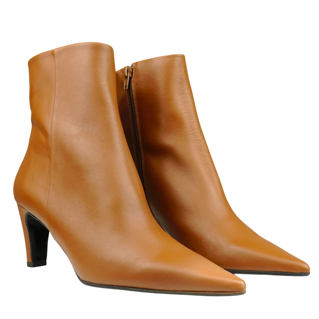 Elegantne i profinjene, ove ženske gležnjače izrađene su od glatke kože u toploj karamel nijansi, koja donosi sofisticiran izgled i lako se uklapa u svaki stil. Model krasi špicasti vrh i tanka visoka potpetica koja vizualno produžava siluetu, dok čista linija bez suvišnih detalja naglašava minimalizam i luksuz. Savršen izbor za poslovne kombinacije s elegantnim hlačama ili za večernji izlazak uz haljinu i kaput, ove gležnjače predstavljaju bezvremenski komad u ormaru svake žene koja voli klasičan, ali moderan stil.