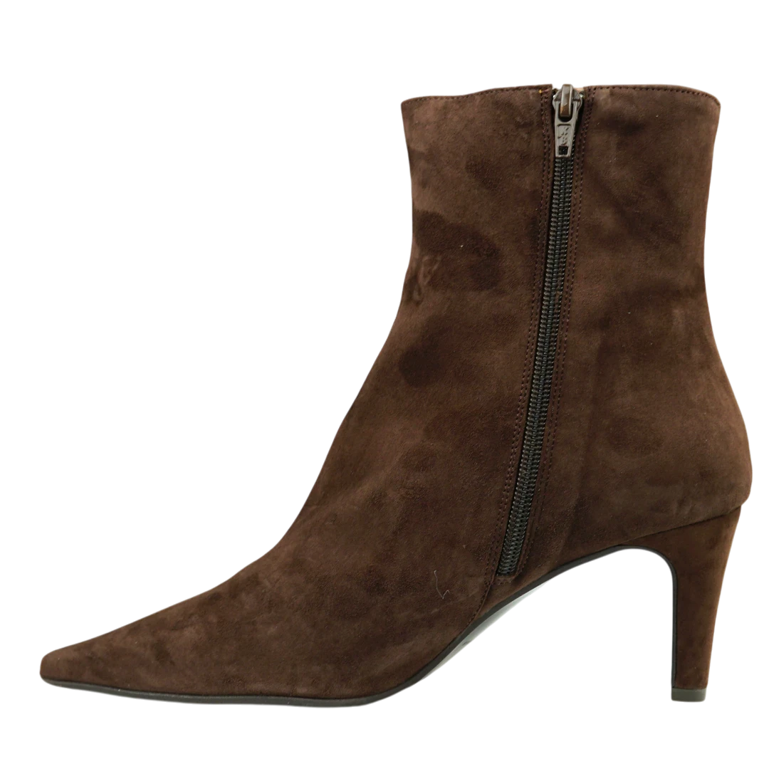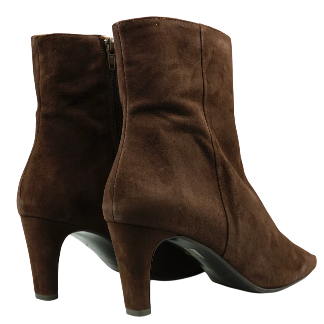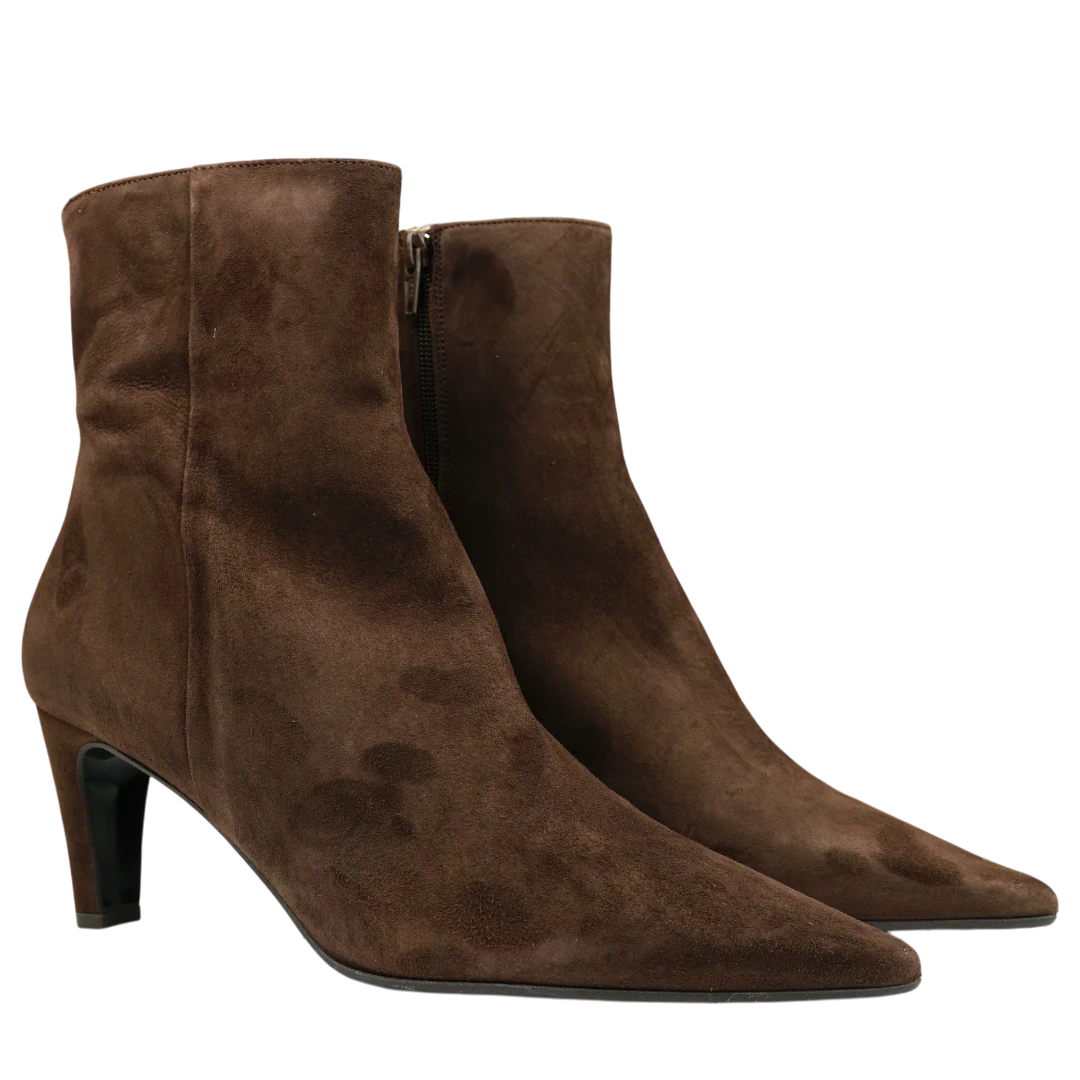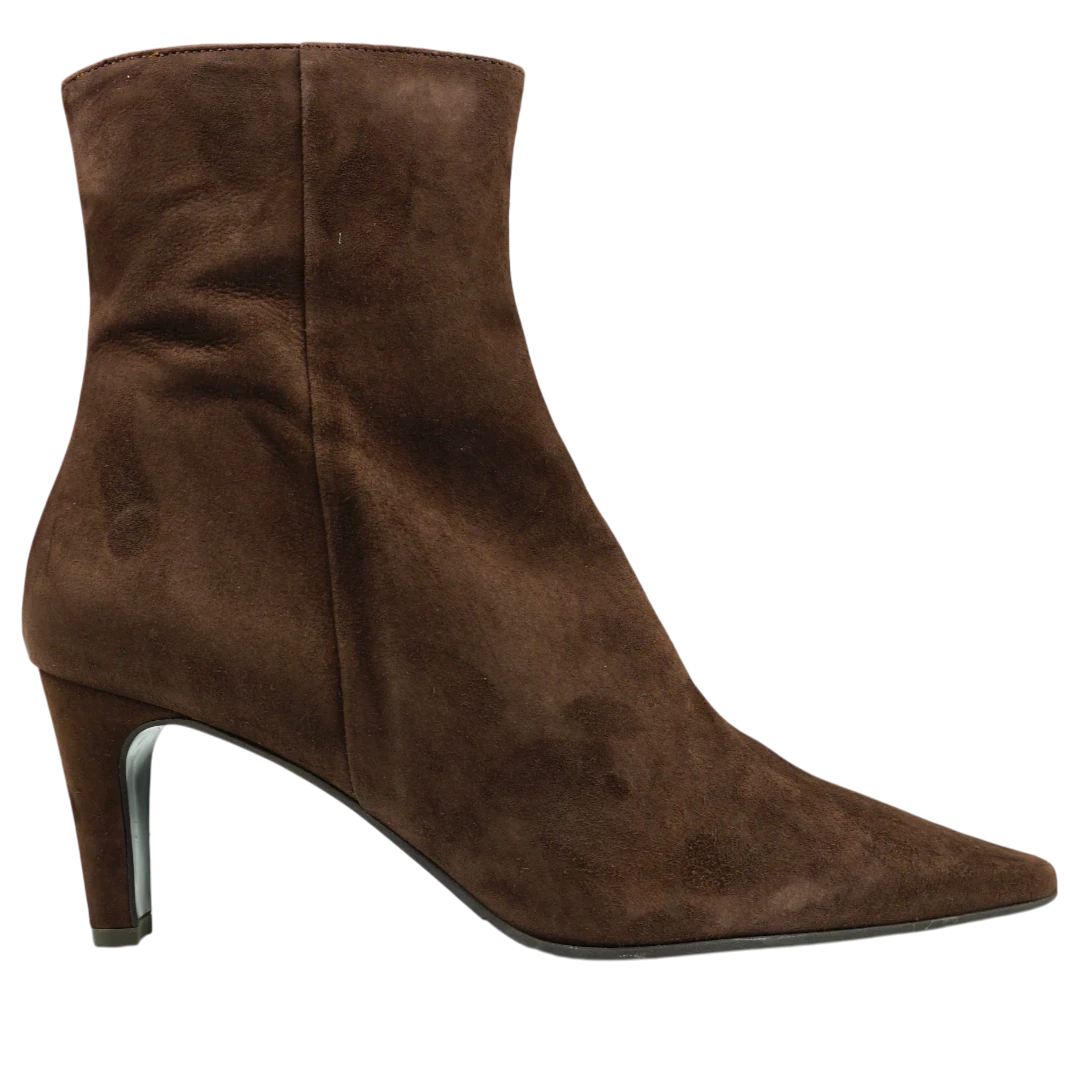 Ove elegantne gležnjače izrađene su od smeđeg brušenog antilopa koji odiše toplinom i luksuzom. Klasičan špicasti vrh u kombinaciji s tanjom visokom potpeticom pruža ženstven i sofisticiran izgled, dok čista silueta bez dodatnih detalja omogućava lako uklapanje u različite outfite. Savršen su izbor za jesenje i zimske dane – bilo da ih nosite uz ležerne traperice i kaput ili uz elegantnu haljinu i torbu u toplim tonovima. Bezvremenski model koji spaja udobnost, stil i prefinjenost.