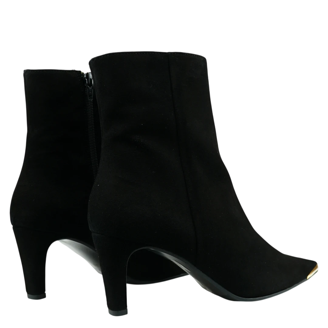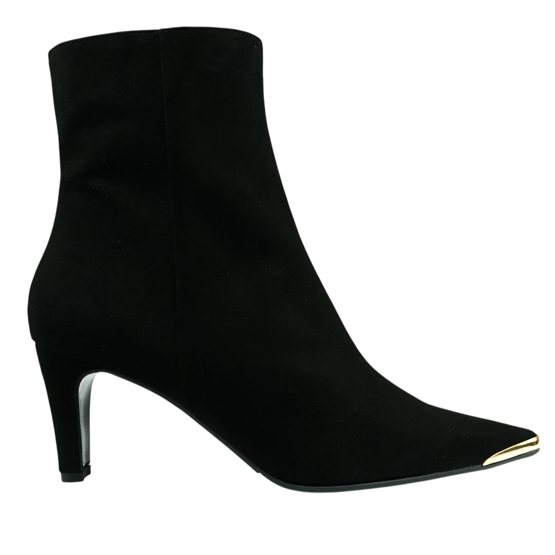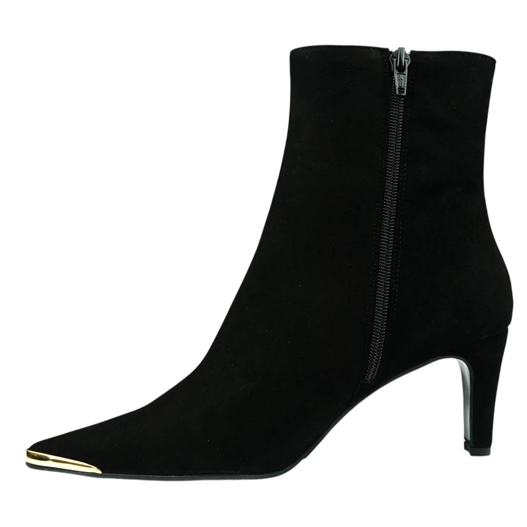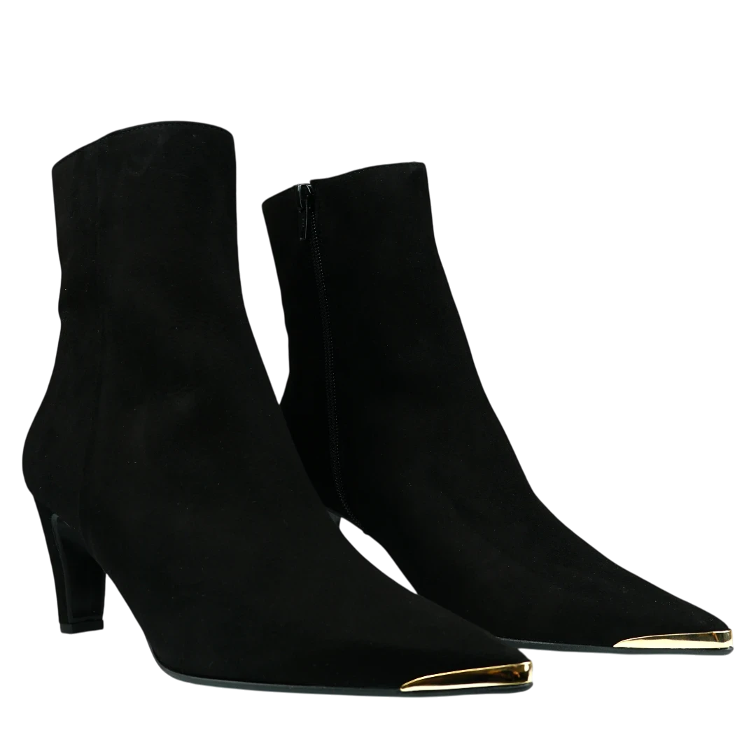 Ove crne gležnjače odišu luksuzom i elegancijom zahvaljujući sofisticiranom dizajnu od brušene kože i upečatljivom detalju – zlatnom metalnom vrhu na špicastom završetku. Visoka, tanka potpetica naglašava ženstvenu siluetu, dok minimalistička linija čini ovaj model savršenim za večernje kombinacije i posebne prilike. Idealne su za dame koje žele unijeti dozu glamura u svoje outfite, bilo da ih nose uz haljinu, elegantne hlače ili suknju. Bezvremenski crni model sa zlatnim akcentom – spoj klasike i modernog luksuza.