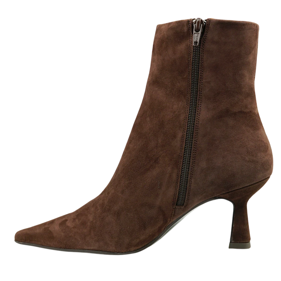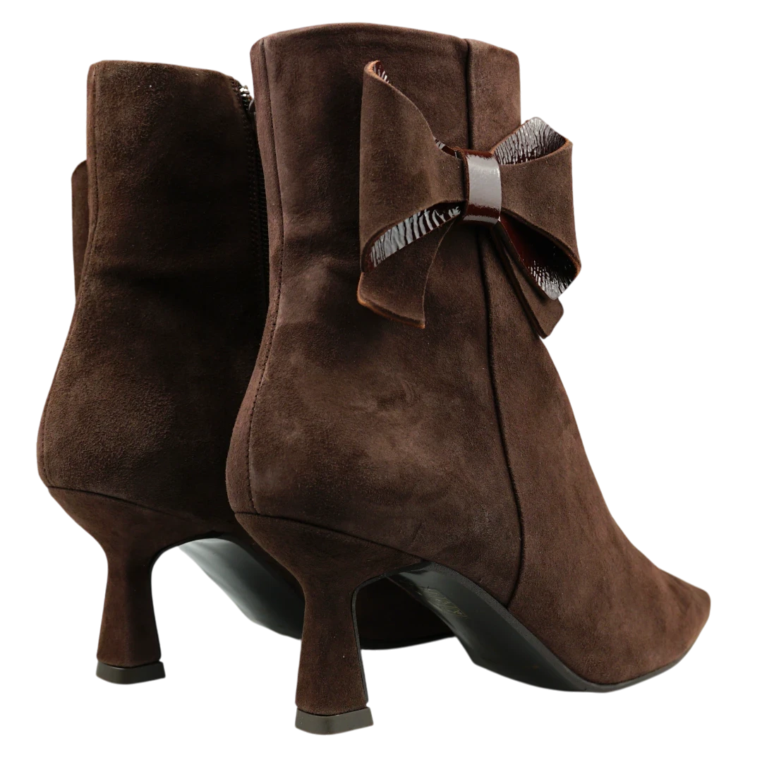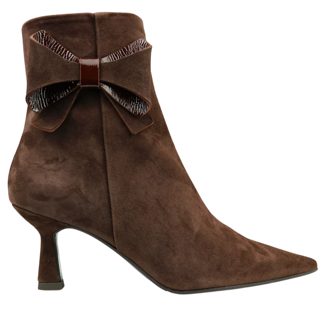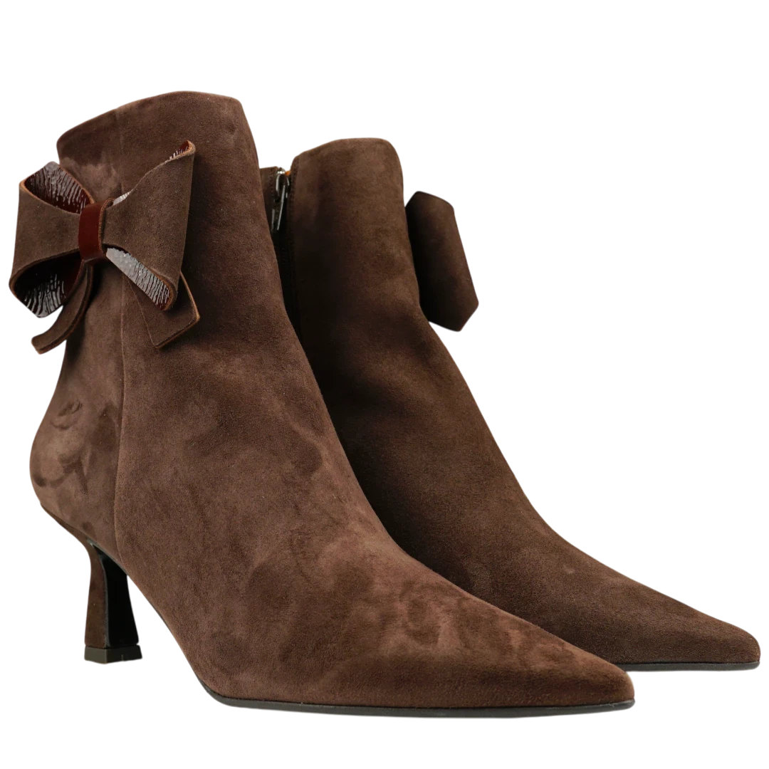 Ove ženstvene gležnjače u smeđem veluru odišu elegancijom i sofisticiranošću. Njihova istaknuta karakteristika je dekorativna mašna na zadnjem dijelu, izrađena od lakirane kože, koja unosi dašak romantičnog šarma i unikatnog stila. Fina, špicasta silueta i tanka potpetica pružaju klasičnu profinjenost, dok mekan velur osigurava luksuzan izgled i udobnost pri nošenju. Savršene su za kombinovanje uz haljine, suknje ili elegantne hlače – model koji svaku odjevnu kombinaciju pretvara u damski outfit.