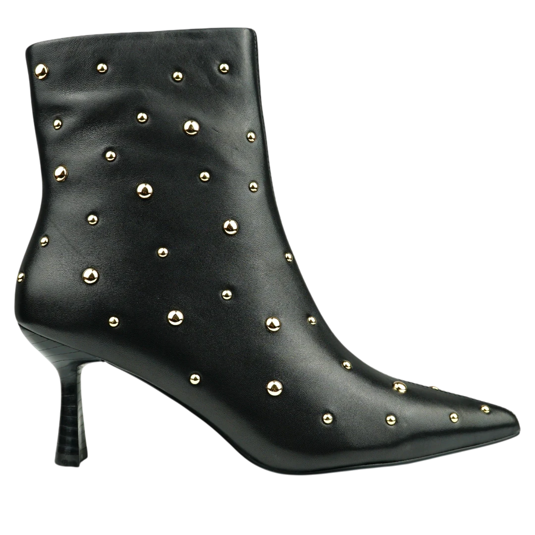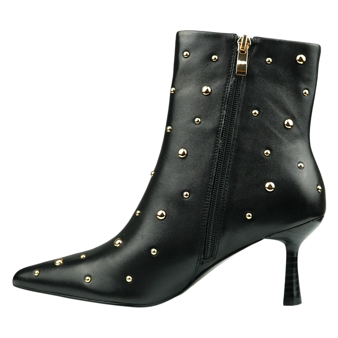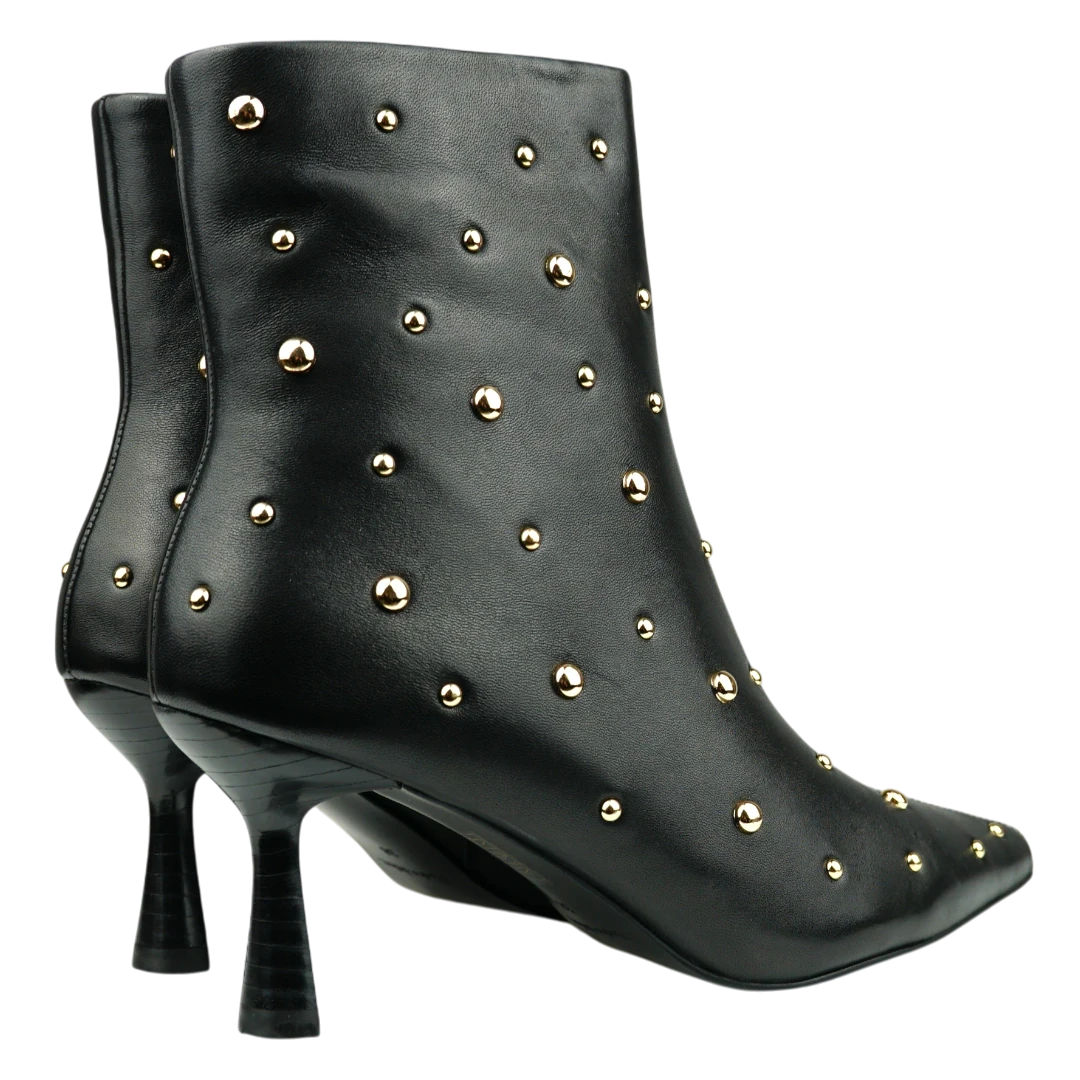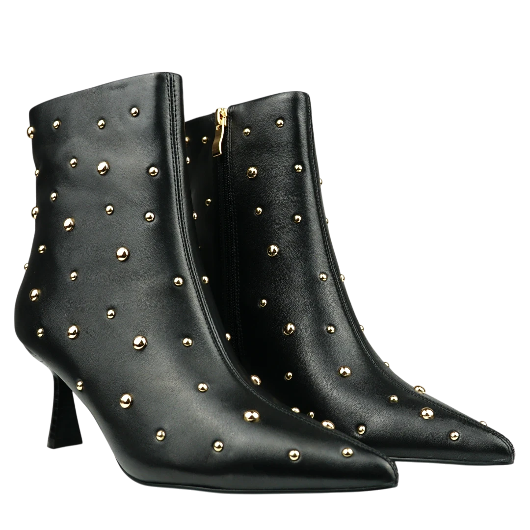 Ove crne kožne gležnjače ističu se modernim i glamuroznim izgledom zahvaljujući zlatnim nitnama raspoređenim po cijeloj površini. Špicasti vrh i elegantna, tanka potpetica daju im sofisticiran oblik, dok upečatljivi detalji unose dozu odvažnosti i luksuza. Savršen izbor za večernje kombinacije i outfite kojima želite dodati statement momenat – gležnjače koje osvajaju pažnju na prvi korak.