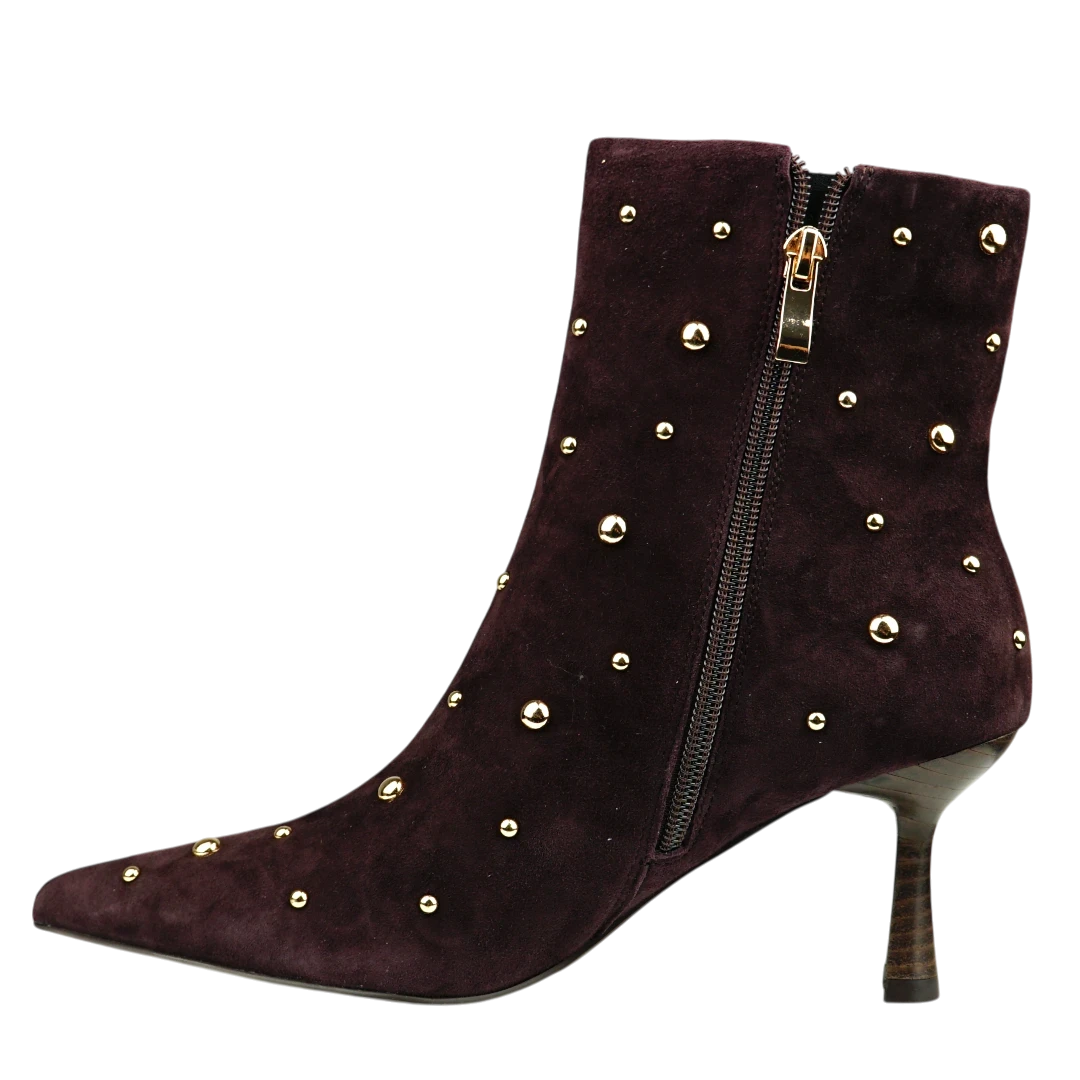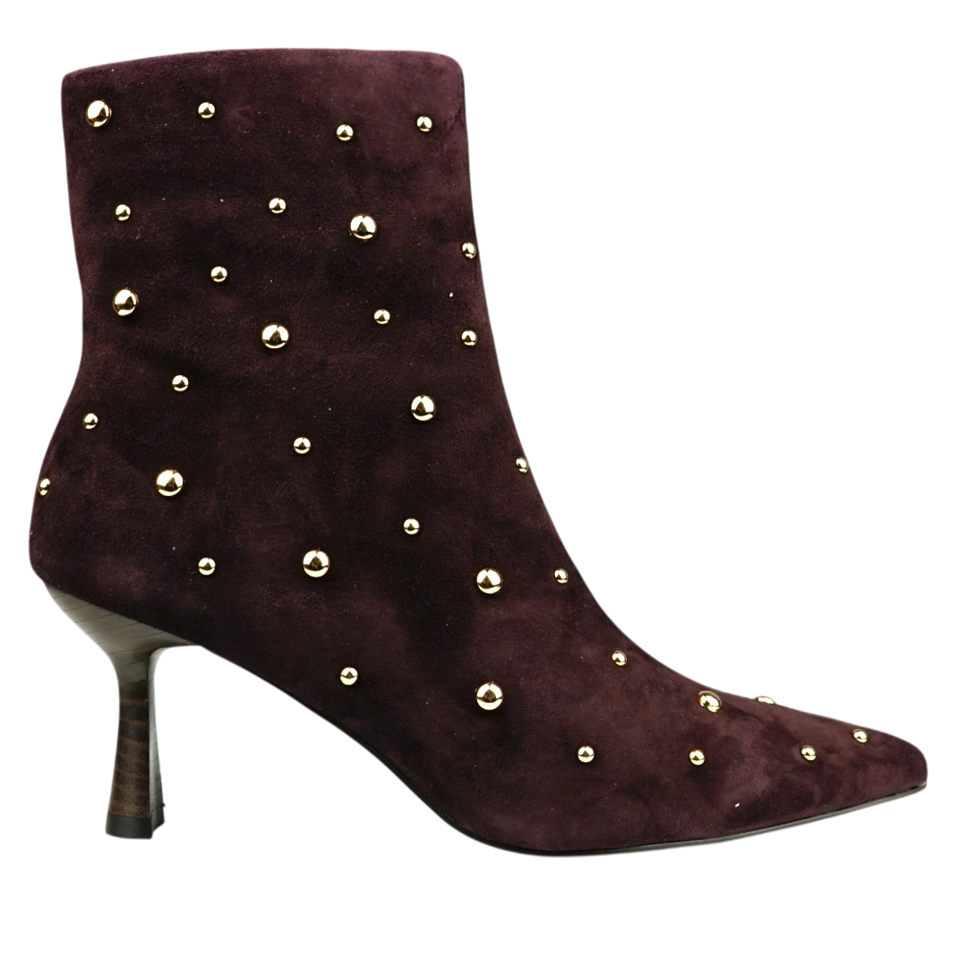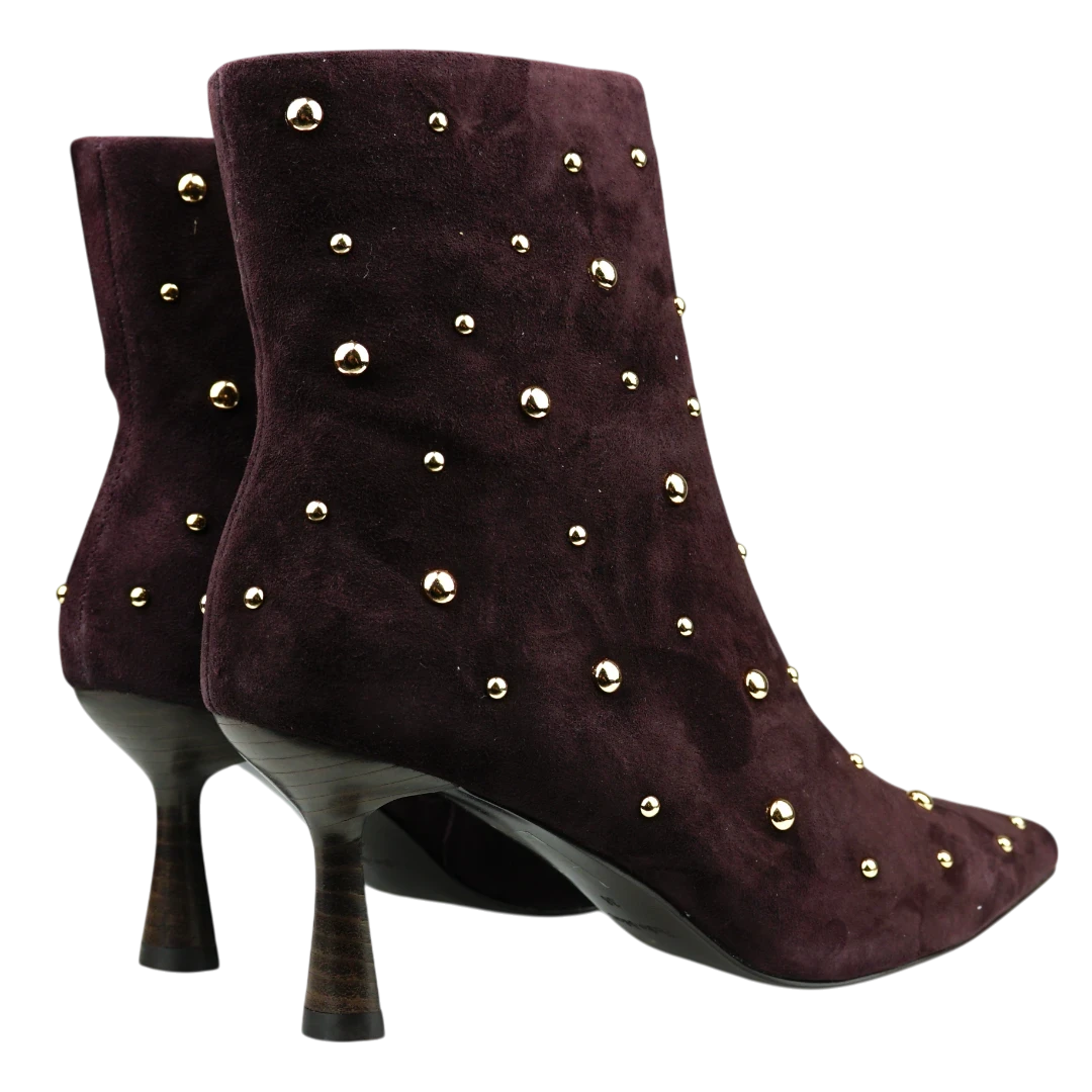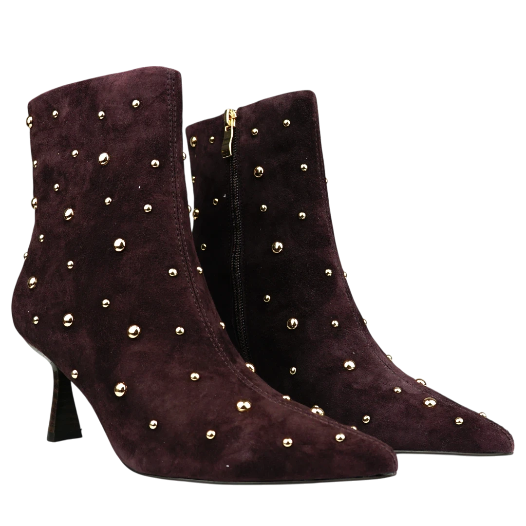 Ove gležnjače od brušene kože u dubokoj bordo nijansi odišu luksuzom i sofisticiranošću. Ukrašene zlatnim nitnama koje diskretno reflektuju svjetlost, spajaju klasičnu eleganciju sa modernim detaljima. Špicasti vrh i tanka potpetica dodatno izdužuju siluetu, dok bogata tekstura antilopa pruža toplinu i raskošan izgled. Savršene za večernje izlaske i modne kombinacije koje traže dašak glamura i odvažnosti.