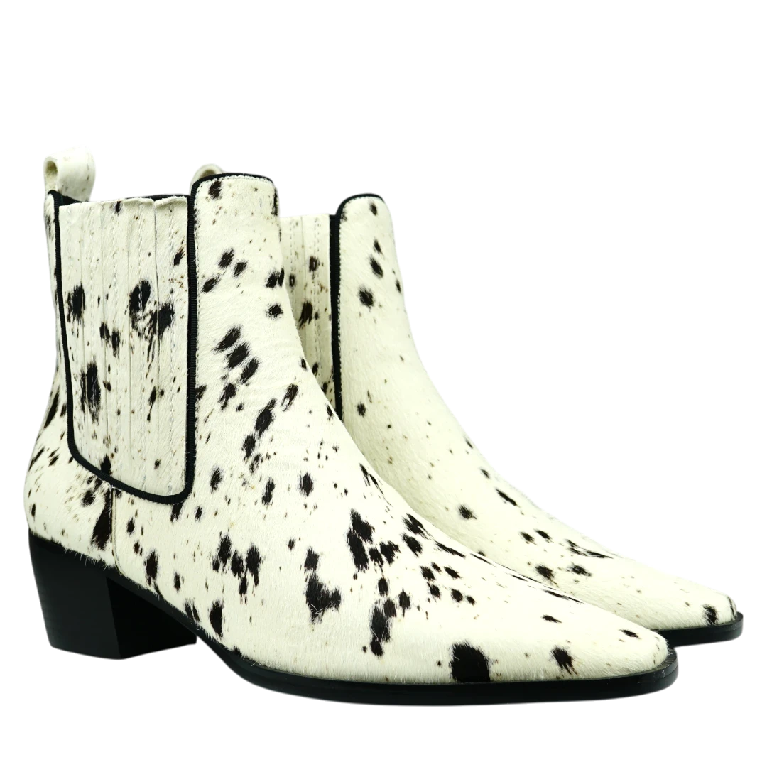 Upadljive i trendi, Marian gležnjače sa animal printom unose odvažan karakter u svaku modnu kombinaciju. Izrađene od prirodne kože sa efektom dlake i kontrastnim crno-bijelim šarama, ove čizme spajaju sofisticiran dizajn sa western prizvukom. Špicasti vrh i stabilna blok potpetica pružaju moderan izgled i udobnost tokom nošenja. Savršene su za dame koje žele unijeti dozu originalnosti u svoj stil – idealno se kombinuju uz traperice, kožne hlače ili mini suknje, stvarajući upečatljiv modni statement.