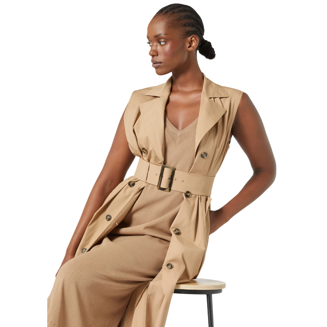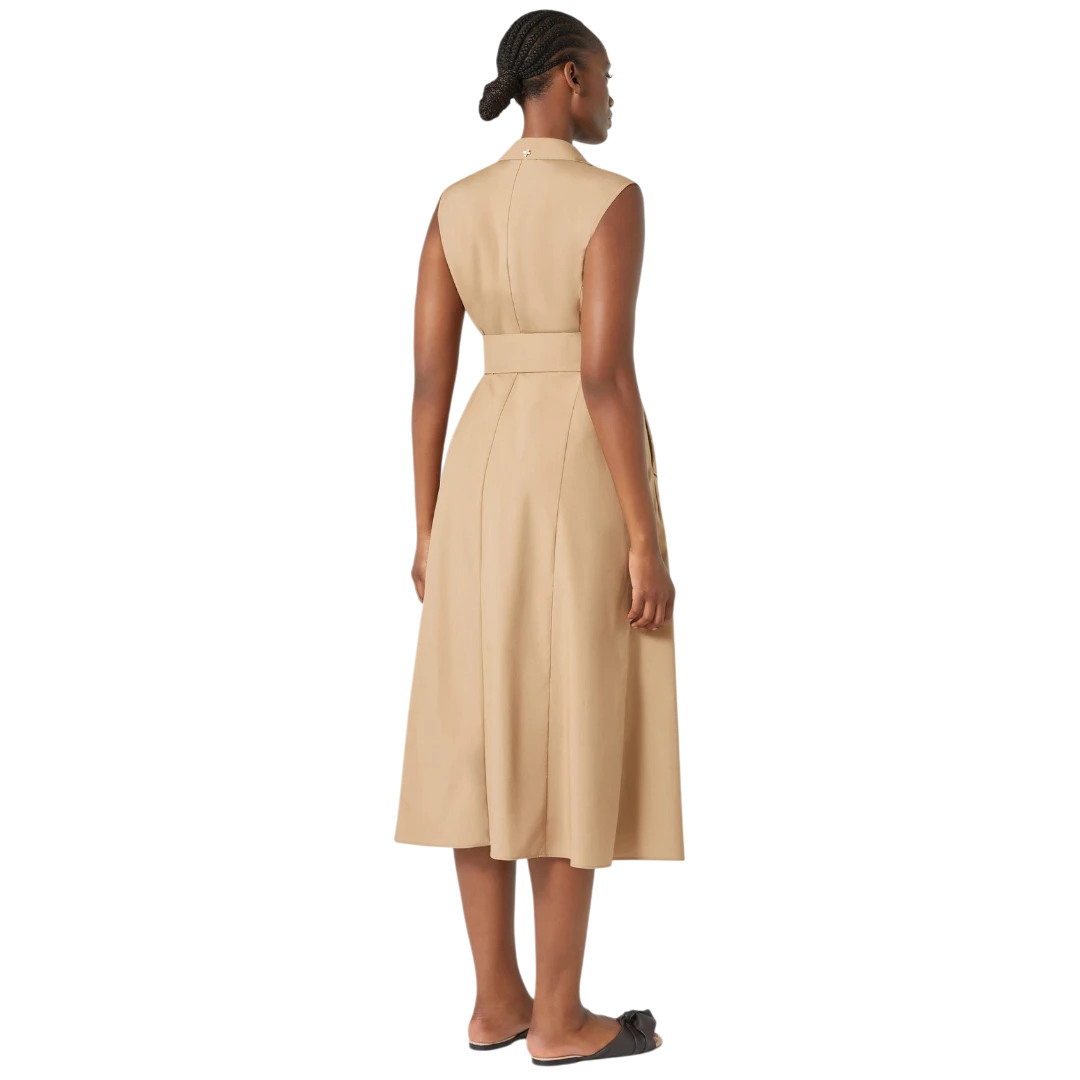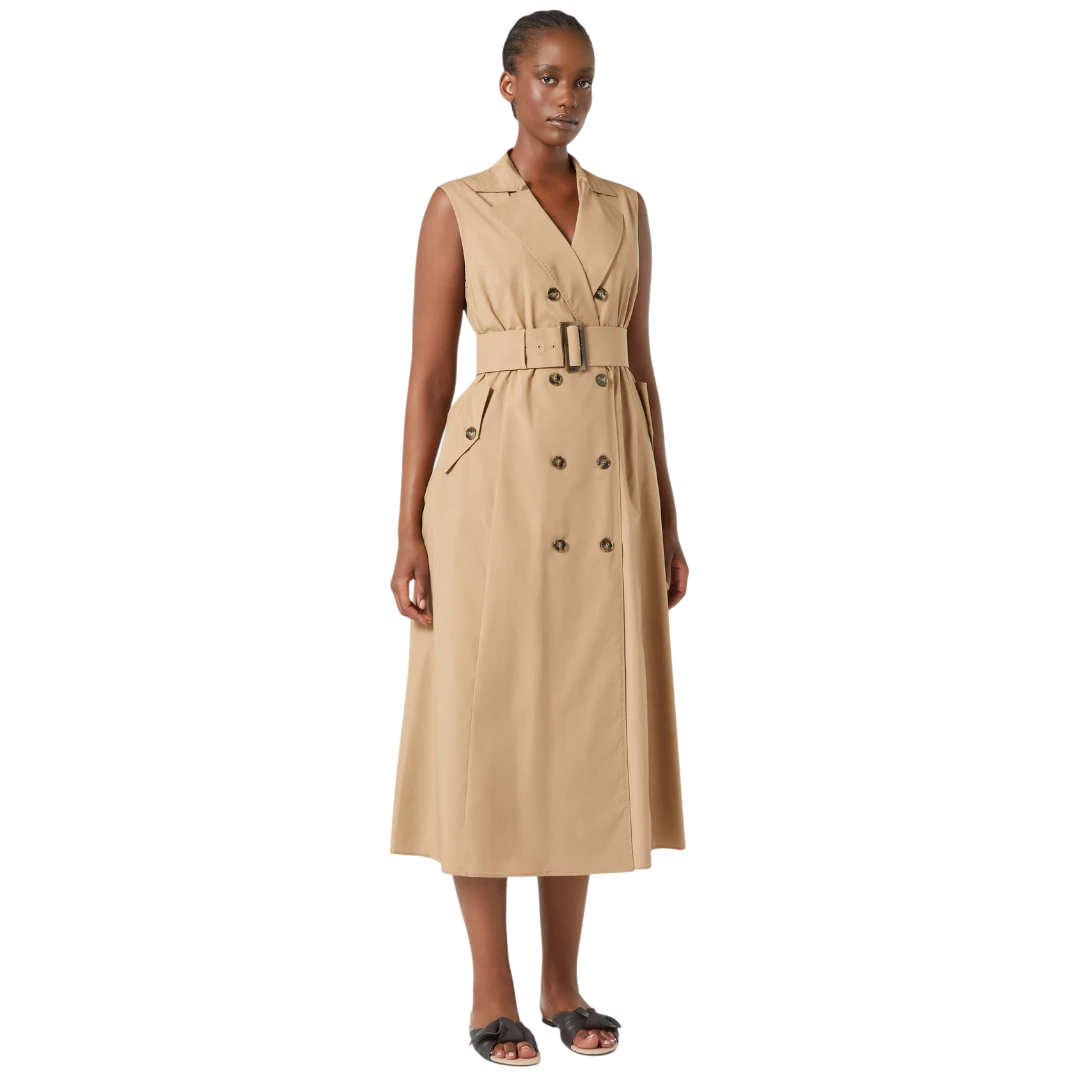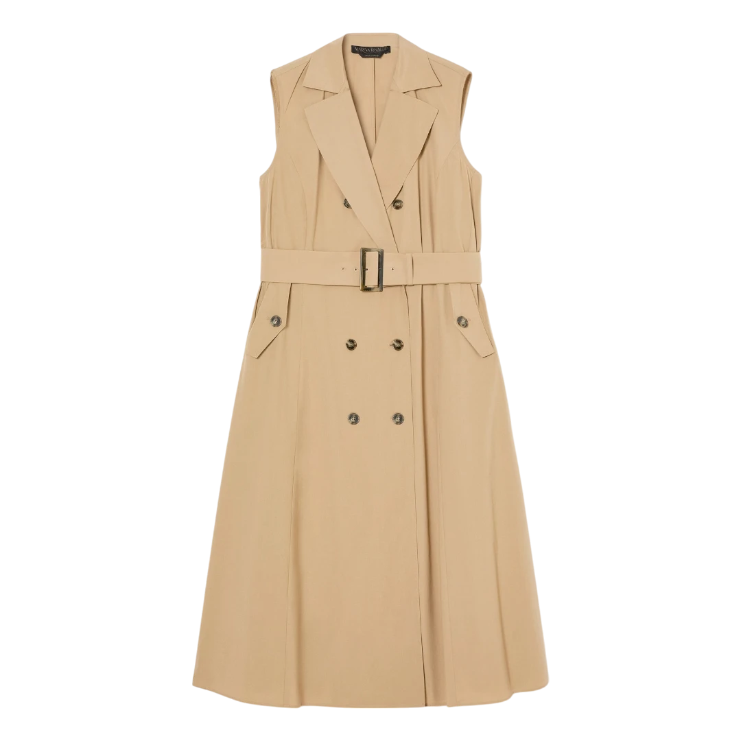 Dvoredna košulja-haljina od elastičnog pamučnog popelina u trench stilu, ukrašena ručno šivanim pick stitch detaljima za dodatnu sofisticiranost. Lepršav kroj s princes šavovima, rever kragnom i džepovima s poklopcima u špic. Pojas s kopčom u imitaciji roga i izvezenim rupicama omogućava prilagođavanje u struku. Uz haljinu dolaze tričetvrt rukavi za dodatnu stilsku fleksibilnost.