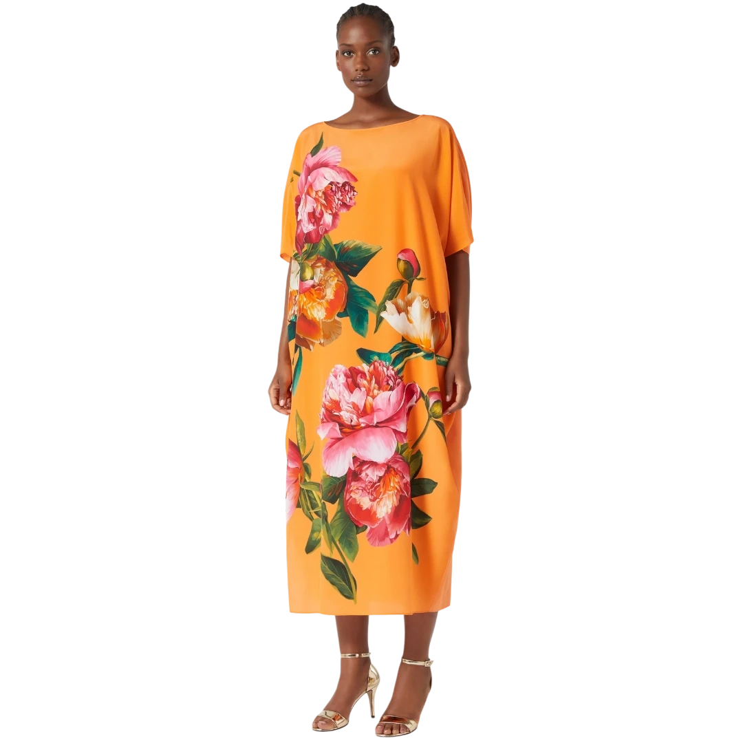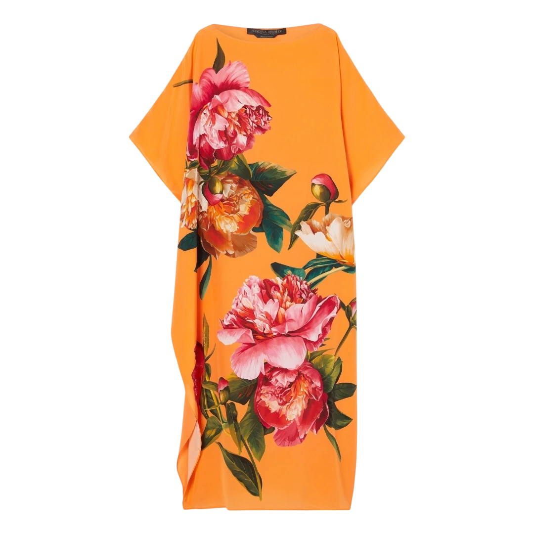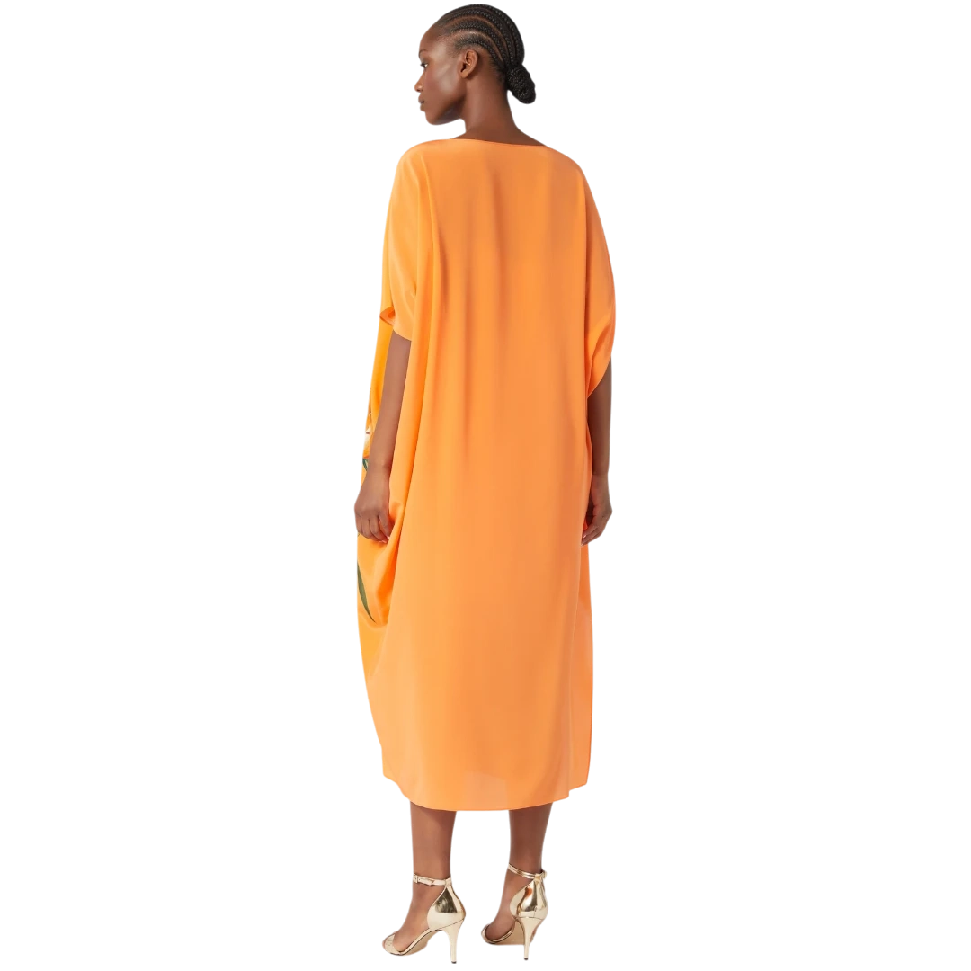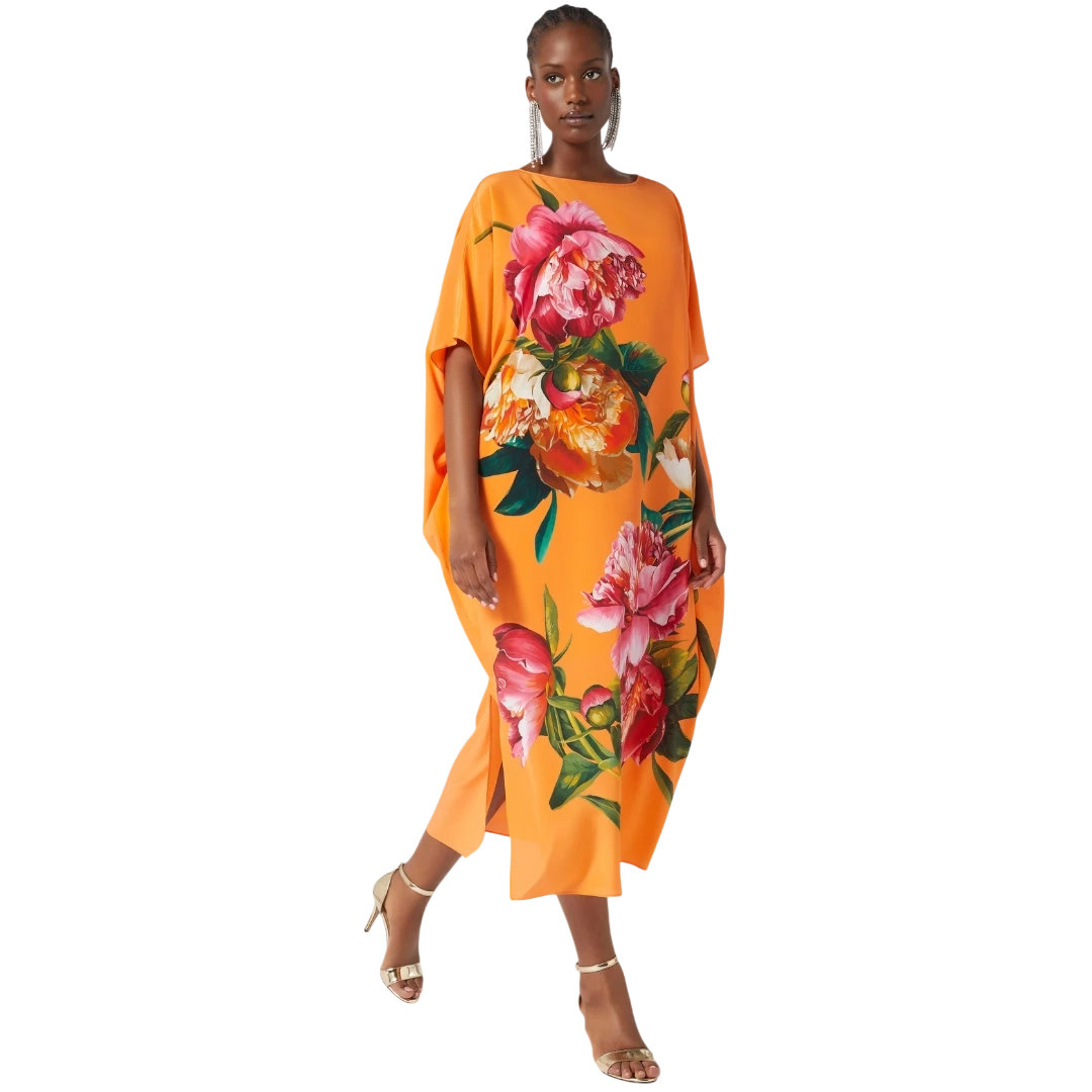Kaftan haljina od luksuznog crêpe de Chinea od čiste svile, ukrašena upečatljivim cvjetnim printom na prednjem dijelu. Opušteni kroj s tričetvrt rukavima, brodskim izrezom i bočnim prorezima pruža savršen spoj elegancije i udobnosti. Dolazi s podsuknjom od svileno-mješavinskog crêpe materijala. Idealna za posebne prilike koje traže istančan stil.