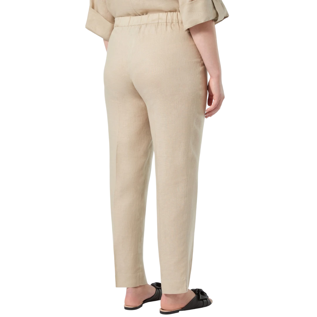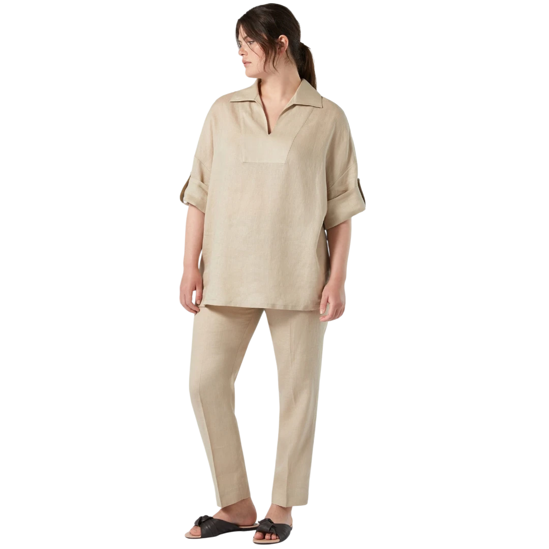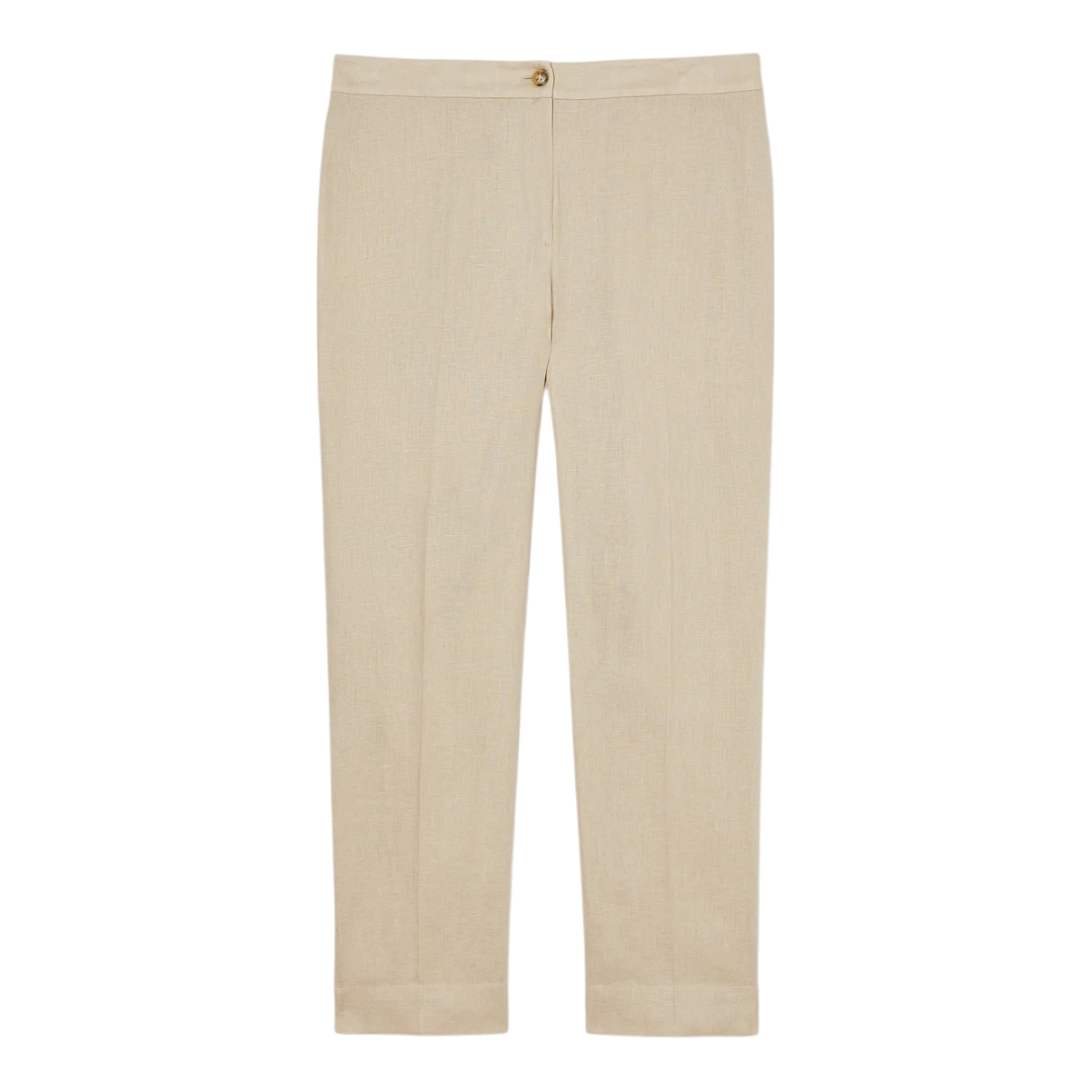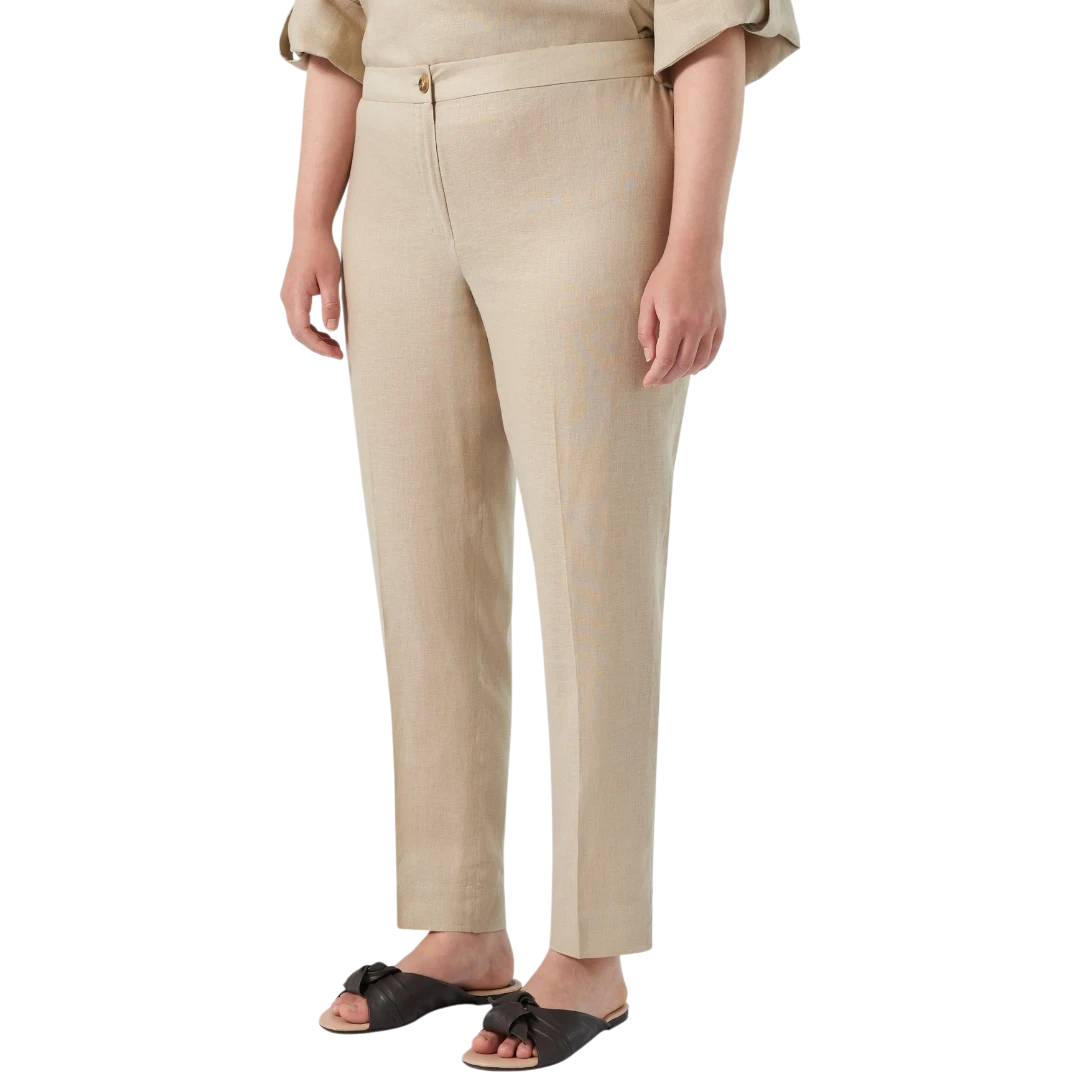 Ove slim-fit hlače iz kolekcije Persona by Marina Rinaldi izrađene su od prozračne tkanine od čistog lana, idealne za elegantan izgled u toplijim danima. Suženi kroj s ušivenim faltama naglašava ženstvenu siluetu, dok detalj proreza na rubovima nogavica dodaje moderan i sofisticiran završetak. Zatvaranje na dugme i rajsferšlus osigurava uredan izgled, a zahvaljujući svojoj jednostavnosti, ove hlače lako se kombinuju s različitim bluzama, košuljama ili blejzerima – savršen temelj za brojne dnevne i poslovne outfite.
