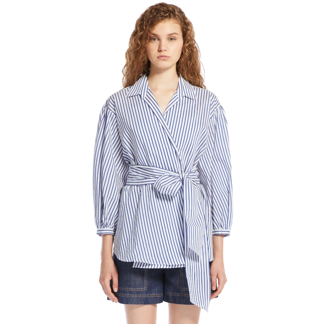 Košulja na preklop izrađena od laganog platna s mješavinom pamuka i svile, idealna za elegantne i ženstvene kombinacije. Ležerna silueta s V-izrezom na preklop i špicastom kragnom naglašava dekolte, dok tročetvrt balon rukavi s opuštenim ramenima i manžetnama dodaju volumen i sofisticiranost. Leđa krase jaram i nabor za dodatnu udobnost, a vezanje u struku omogućava individualno prilagođavanje figure.