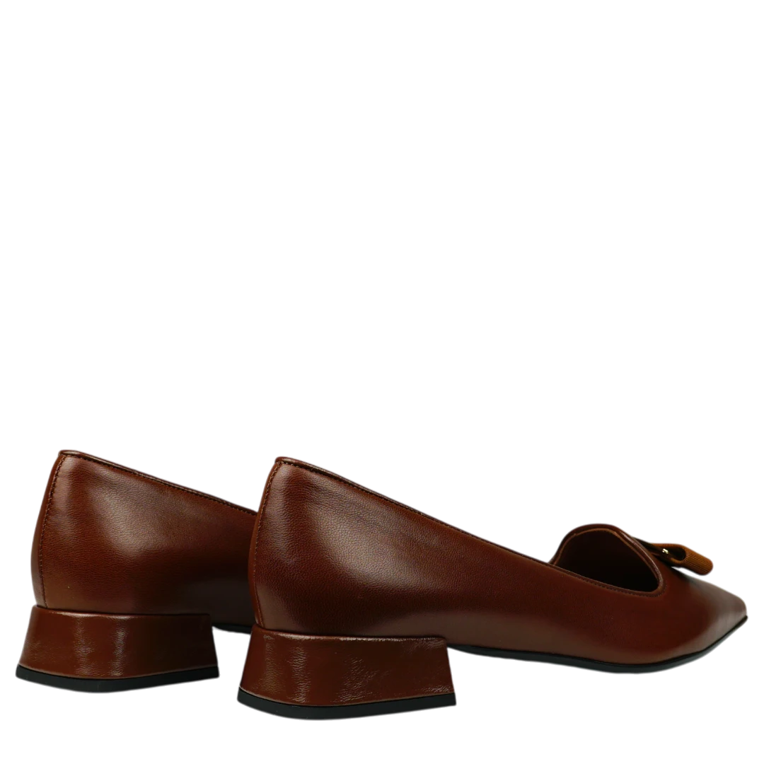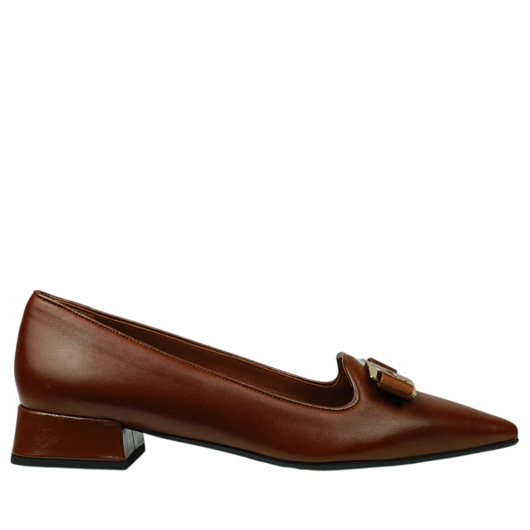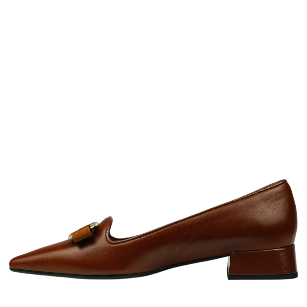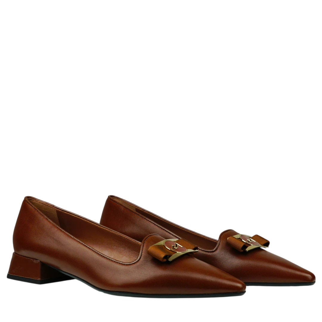 Musella cipele u nijansi tople smeđe boje donose savršenu ravnotežu između udobnosti i profinjenog stila. Izrađene od glatke kože s elegantnom metalnom kopčom na prednjem dijelu, ove cipele odišu bezvremenskom elegancijom. Niski blok potpetica pruža stabilnost i lakoću pri svakom koraku, čineći ih idealnim izborom za poslovne kombinacije ili svakodnevno nošenje. Klasičan dizajn i pažljivo birani detalji čine ih komadom koji će upotpuniti svaku garderobu s notom italijanskog šarma.