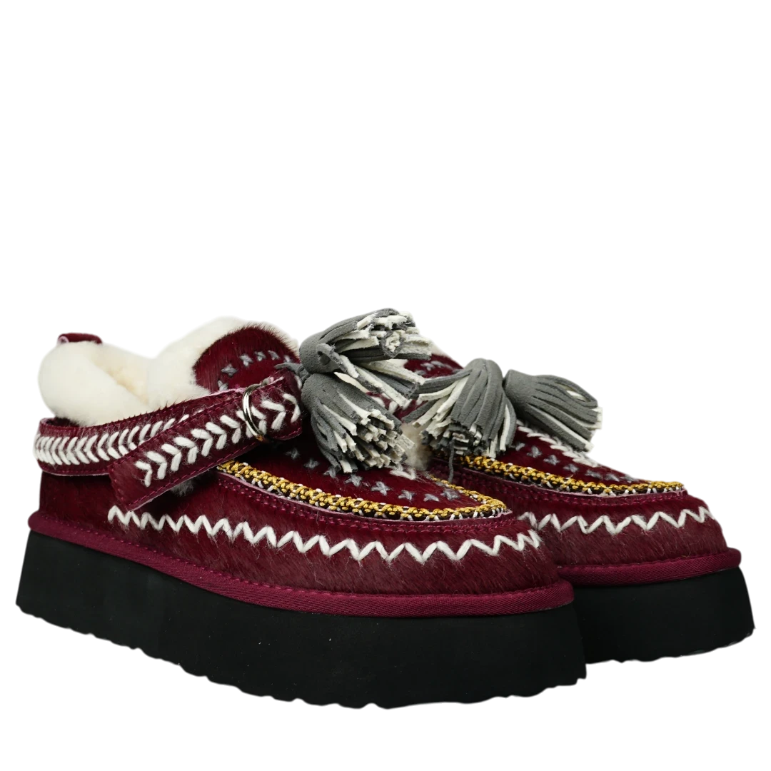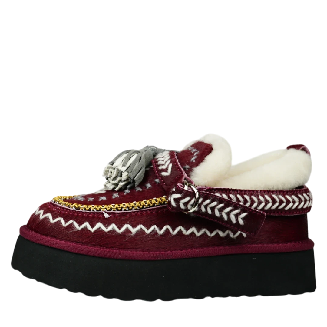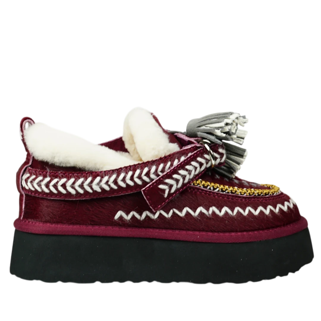 Ove cipele u bogatoj bordo nijansi donose savršen spoj topline, udobnosti i unikatnog dizajna. Ručno izrađene s prepoznatljivim kontrastnim prošivima i detaljima od mekanog krzna, pružaju udoban osjećaj pri svakom koraku. Zahvaljujući debljem potplatu, idealne su za hladnije dane, dok moderan etno-boho izgled čini da se ističu u svakoj kombinaciji. Savršene za žene koje vole udobnost s dozom originalnosti i stila.